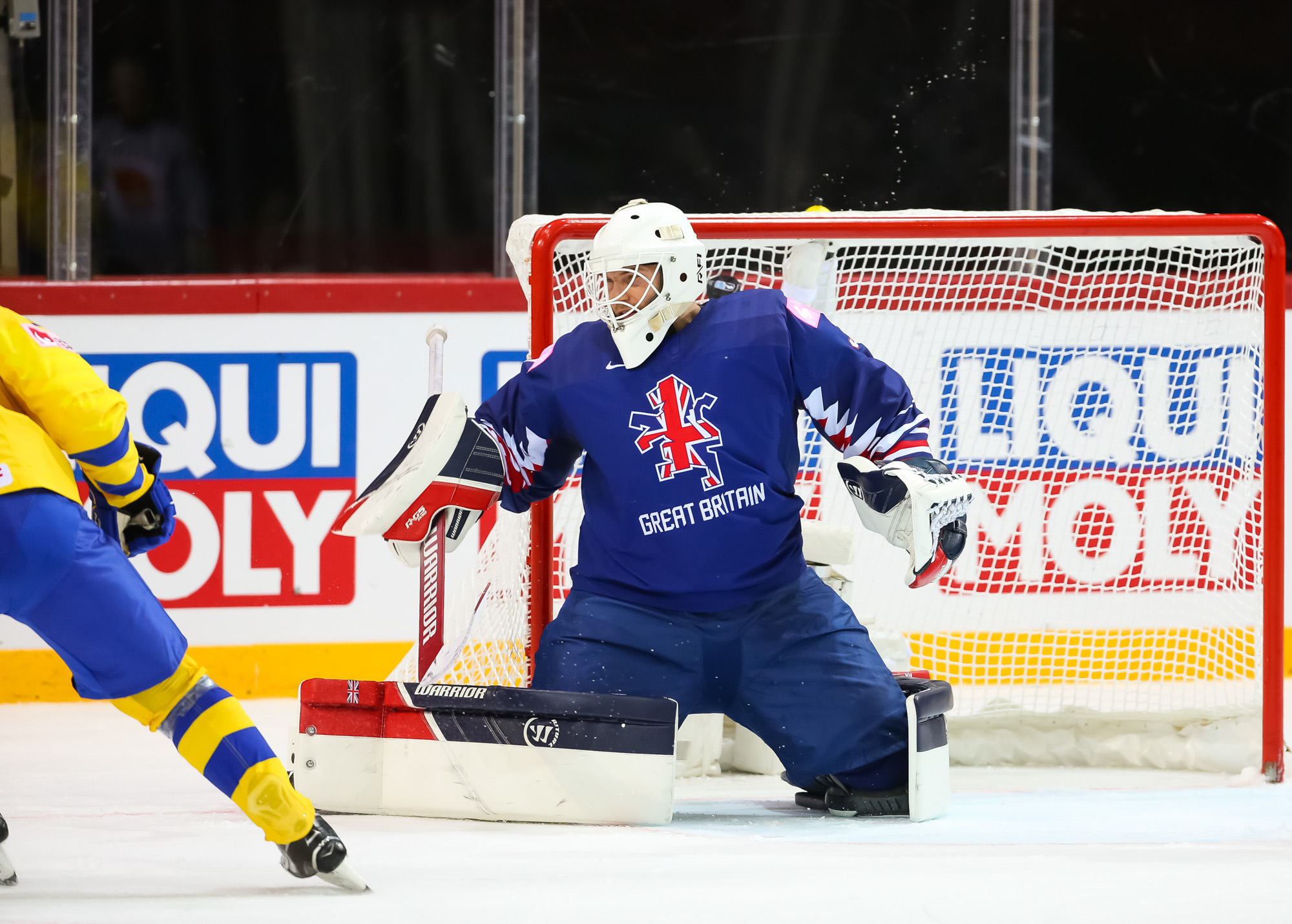 Sweden was enjoying much the better of the early action, but a rare GB foray saw Liam Kirk fire in a deflected backhand attempt from the right-hand channel. As the puck approached the crease, British forward Brendan Connolly slid into Swedish goalie Viktor Fasth and both ended up in the net. The initial call was no goal, with the officials feeling that Connolly interfered with Fasth and prevented him from making the save. But, on a review, the officials concluded that the collision was caused by interference on the British forward from Rickard Rakell. The decision was reversed and Kirk had his fifth goal of the championship. That puts the Yorkshire-born youngster out in front in the tournament goal scoring race: his five tallies came from just 11 shots.