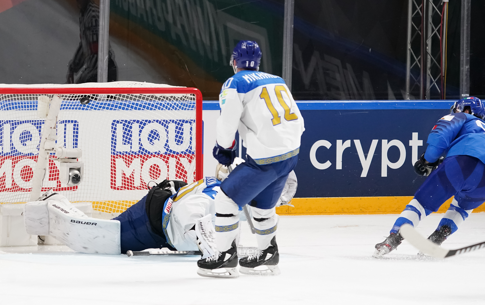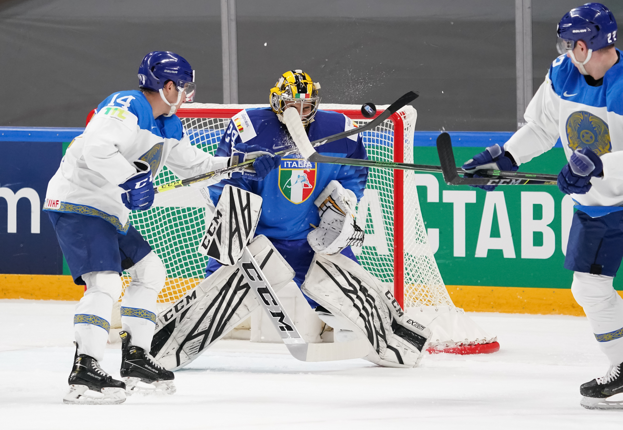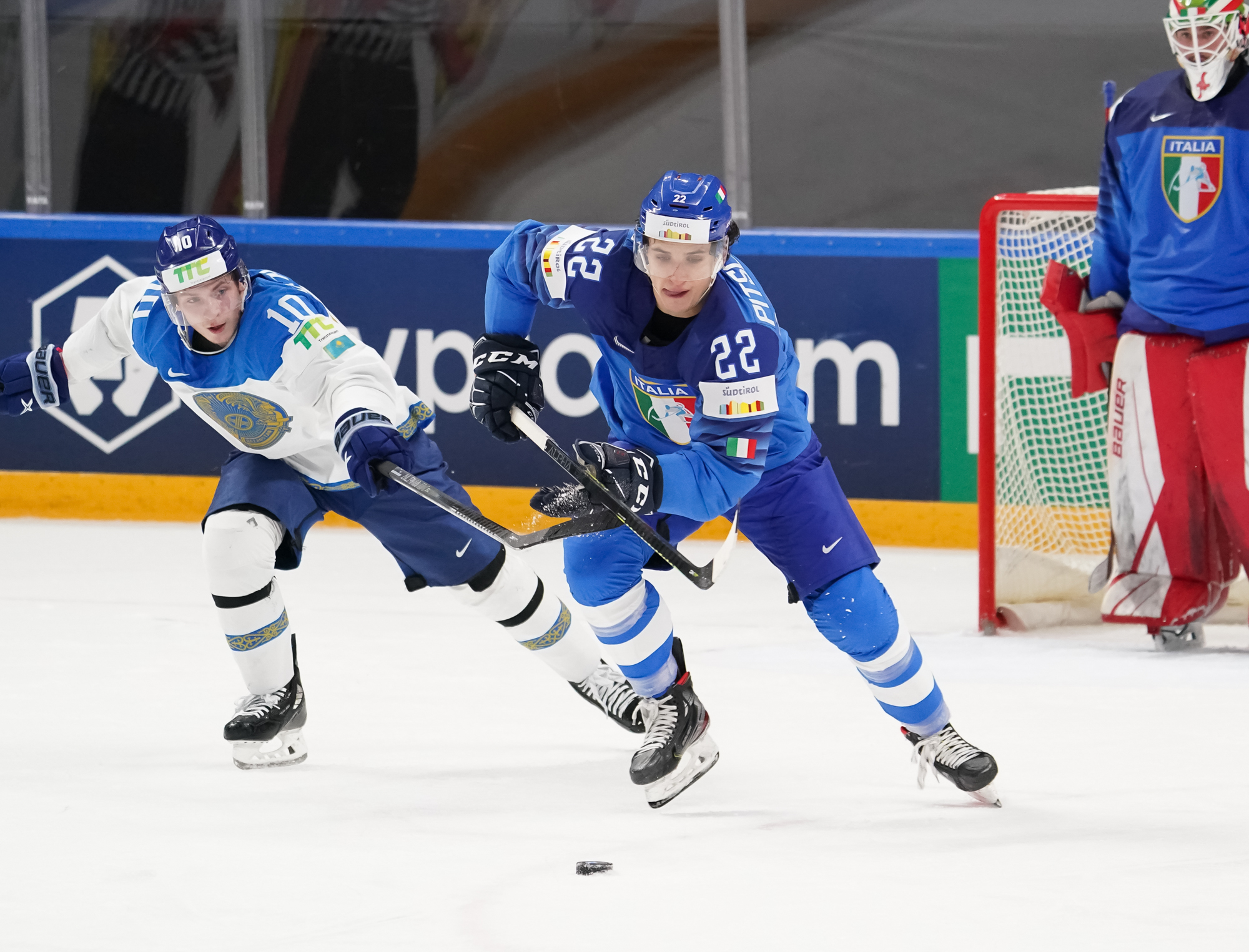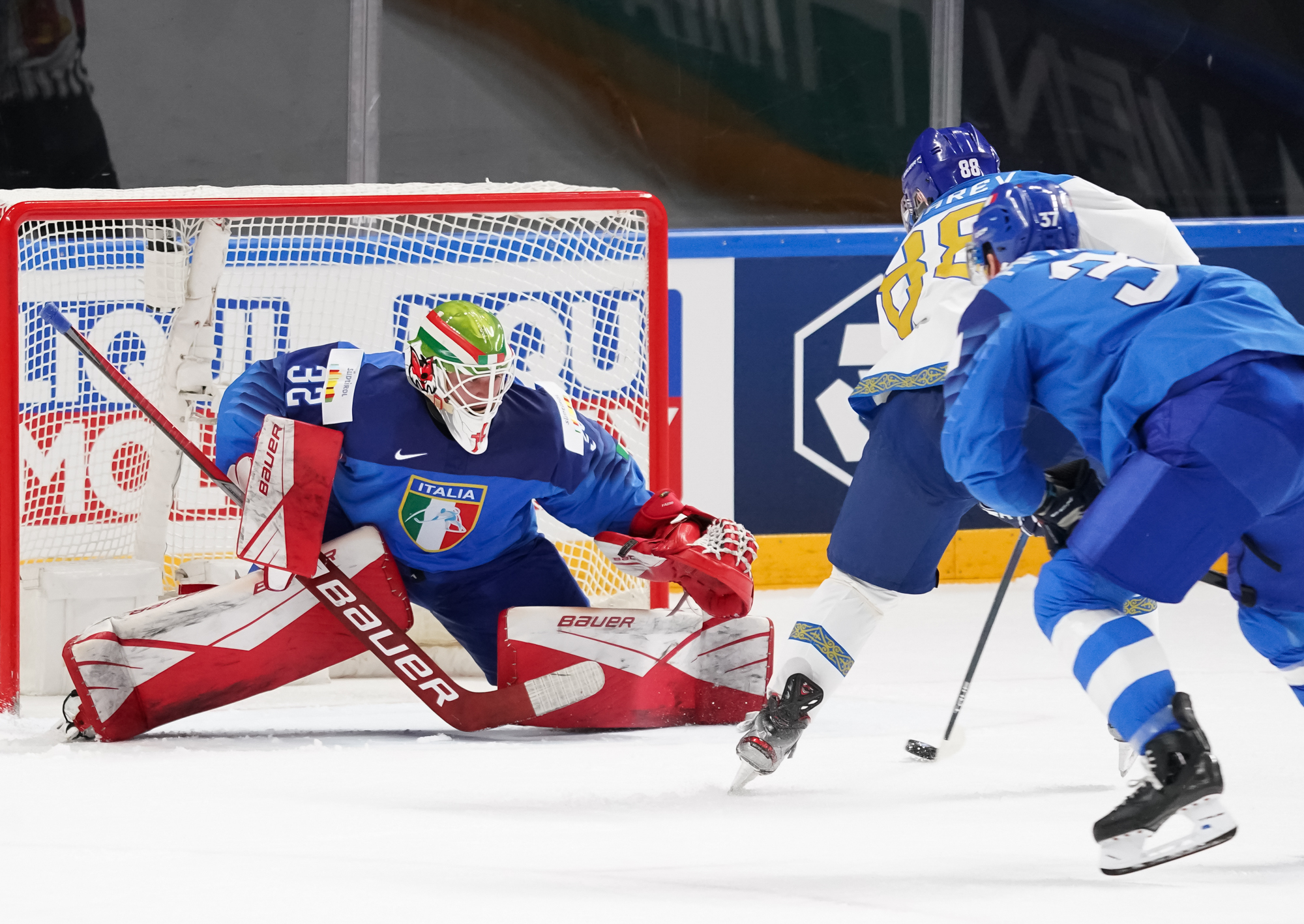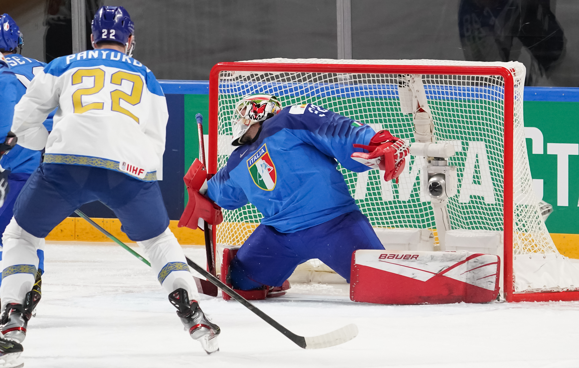 It remained tied past the game’s midpoint but the Kazakhs regained the lead and gave themselves a bit of breathing room with two goals 2:28 apart. After some sustained pressure in the Italian zone, Alikhan Asetov found Yegor Petukhov wide open in front, and he easily beat a sprawling Justin Fazio.