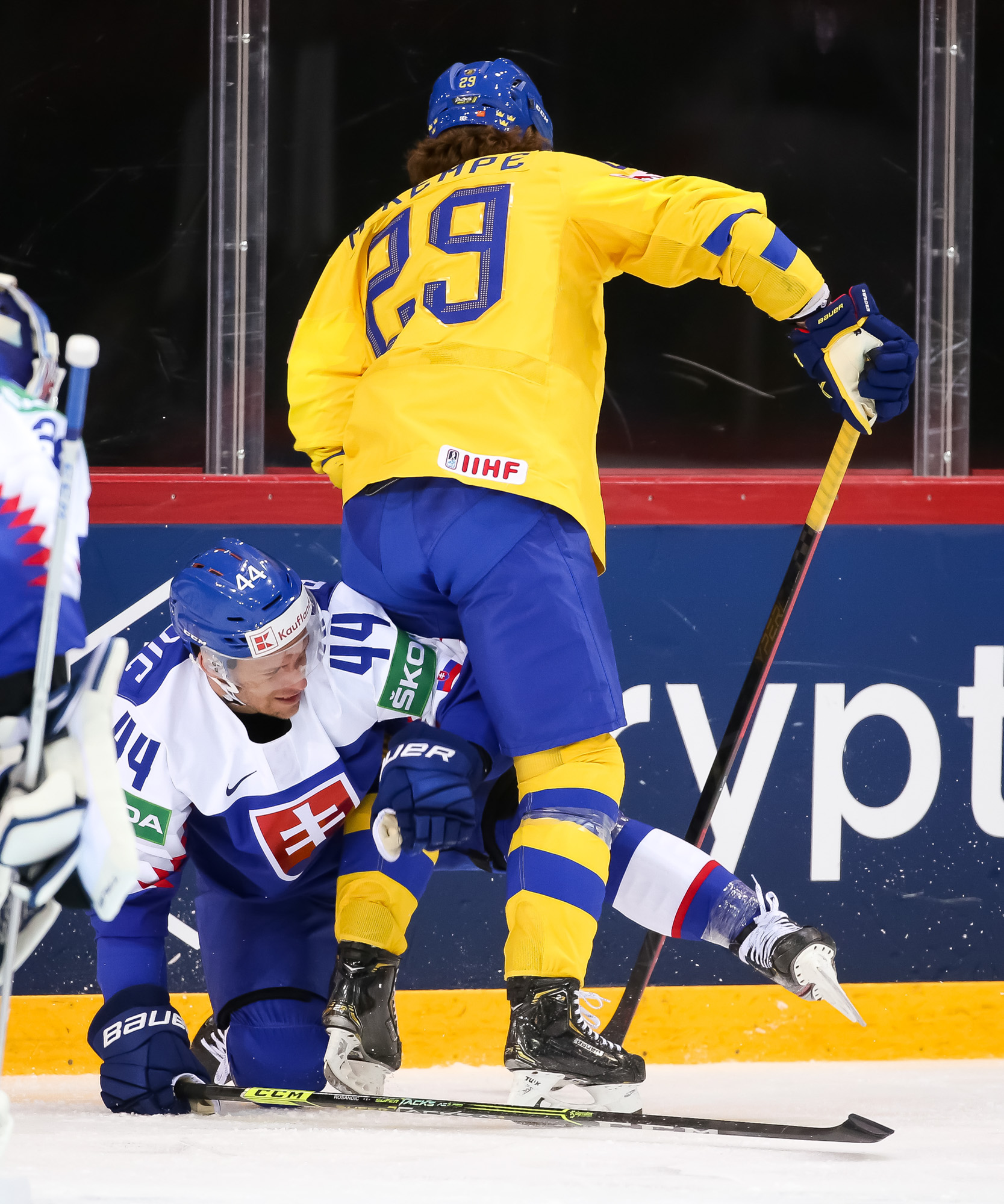 The Swedes tied it just past the game’s midpoint on a strange play. Marcus Sorensen’s initial shot hit the side of the net and then the end boards, where it was recovered by Max Friberg. Friberg attempted a centring pass but it hit a Slovak stick and popped into the air, bounced off Huska’s shoulder and in front of the net. Several players from both teams tried to knock the airborne puck one way or the other and it eventually bounced into the net.