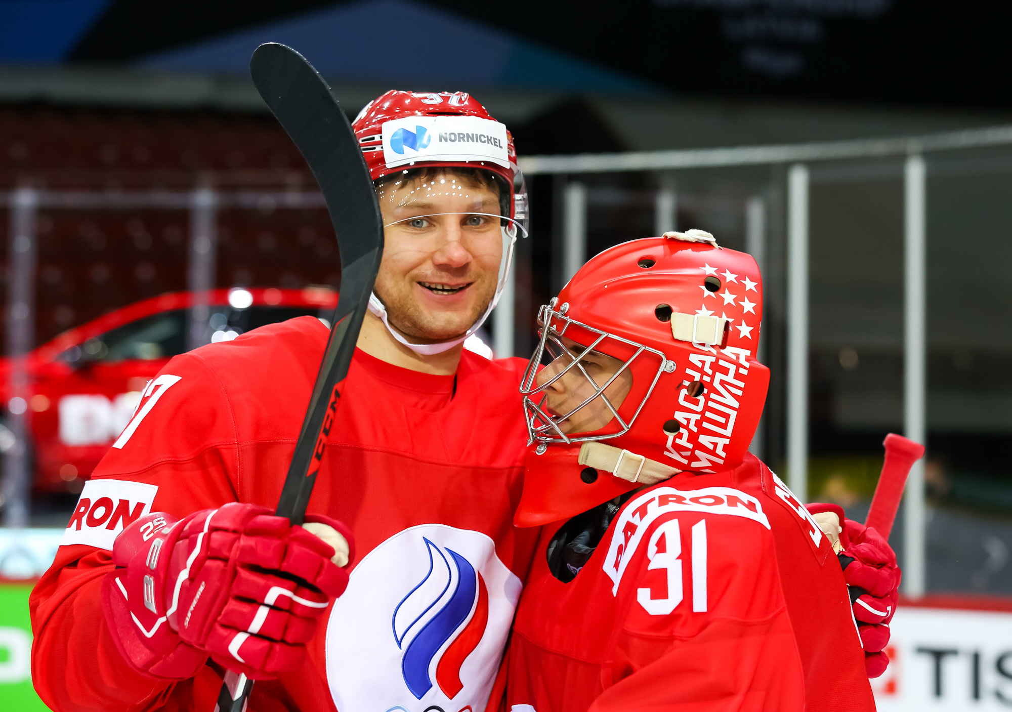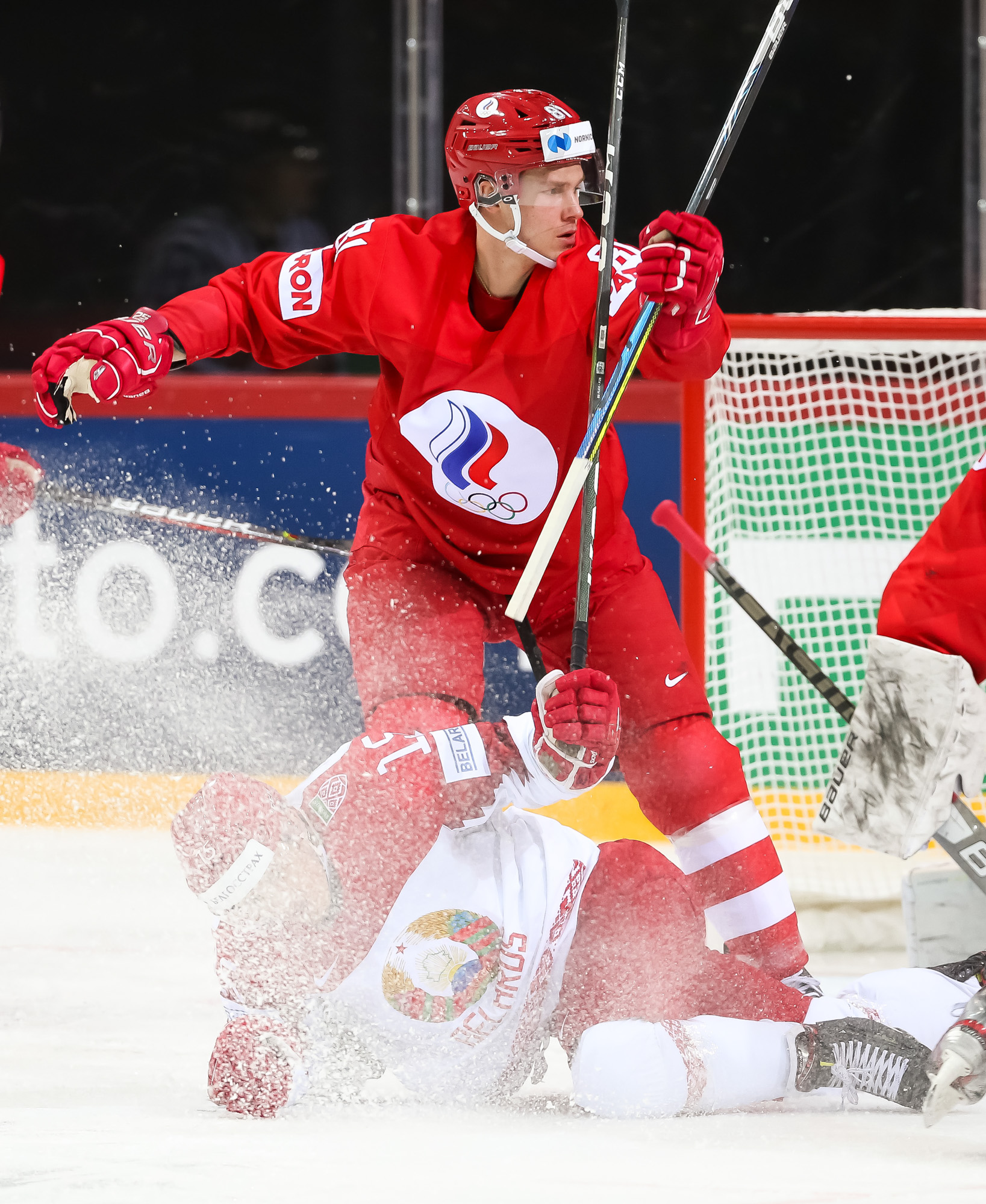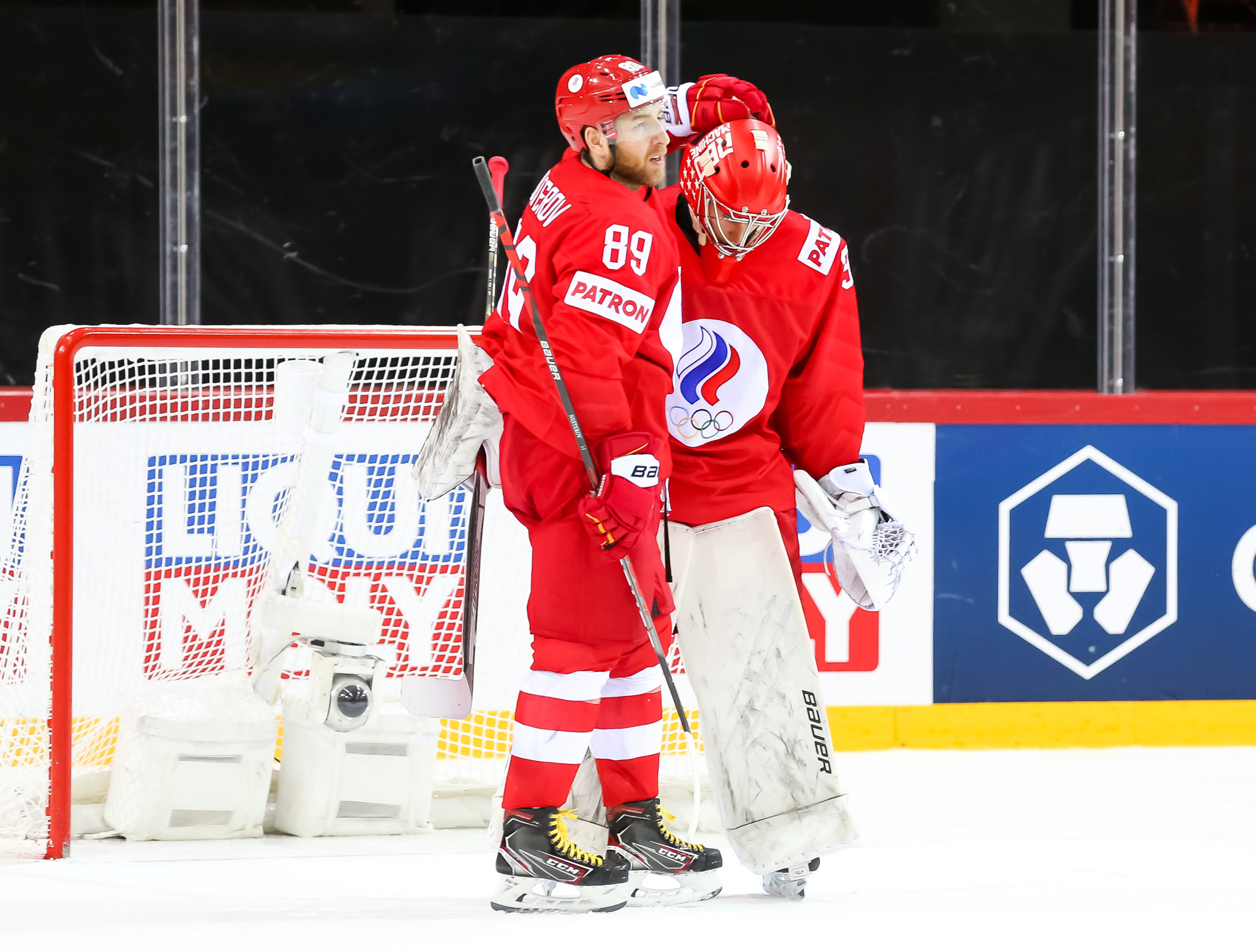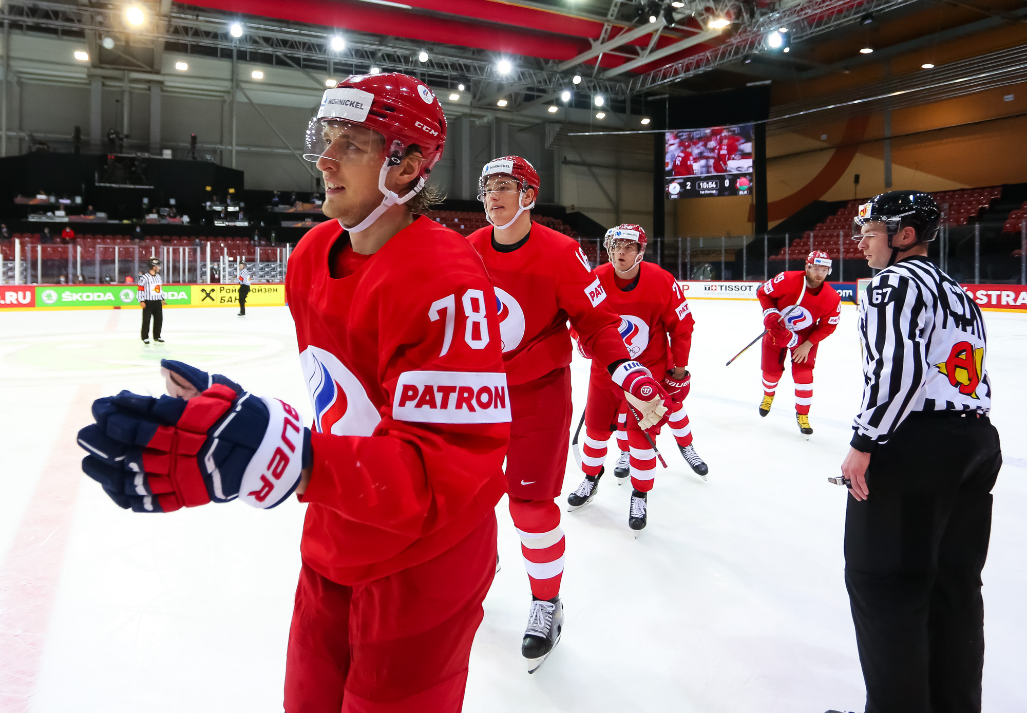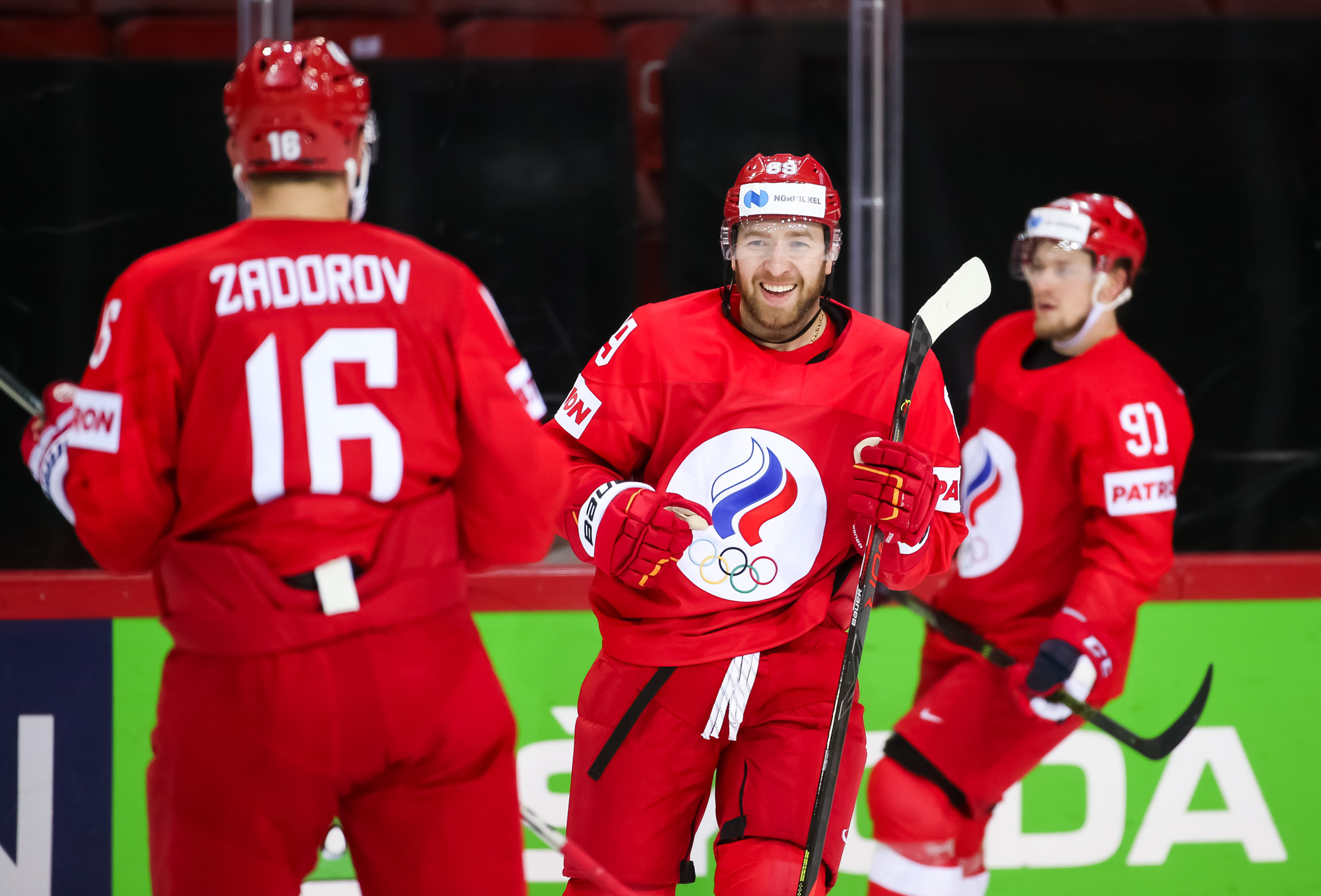 ROC's Nikita Nesterov celebrates his second-goal against Belarus with his teammates.