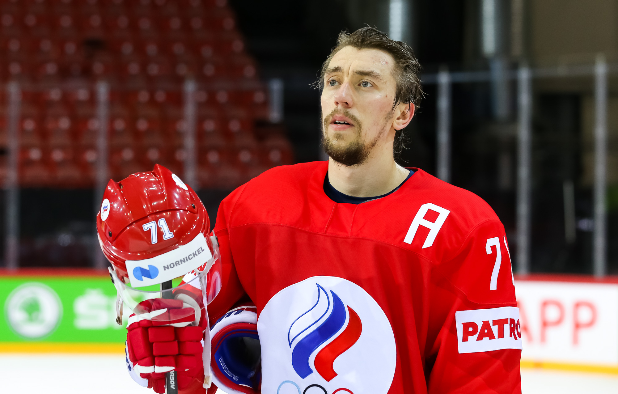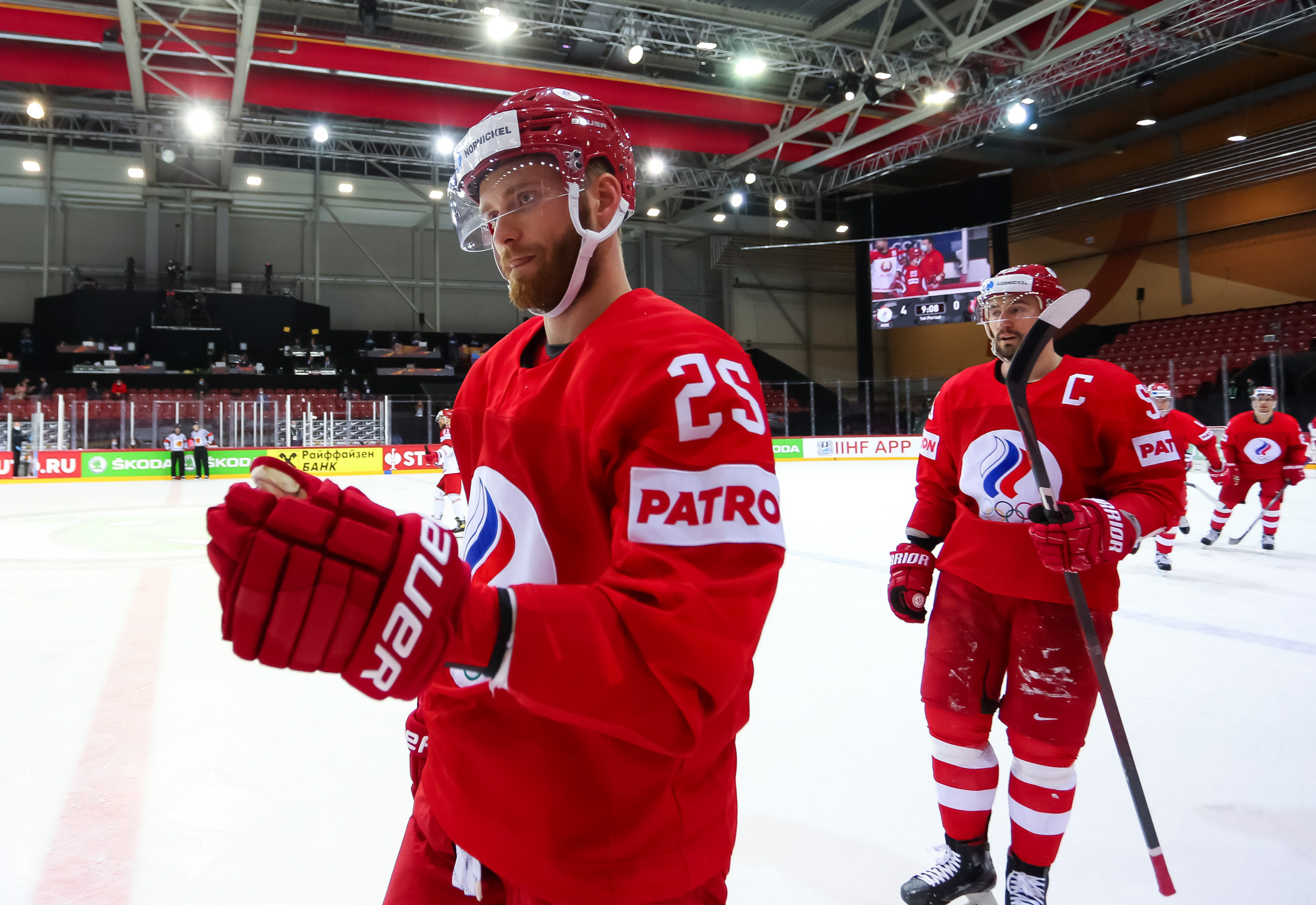Today was the first time that supporters were allowed into the arena at this World Championship. Most spectators wanted to see Latvia's qualification battle against Germany, but team ROC had a solitary supporter of its own, one Andrei from Riga.