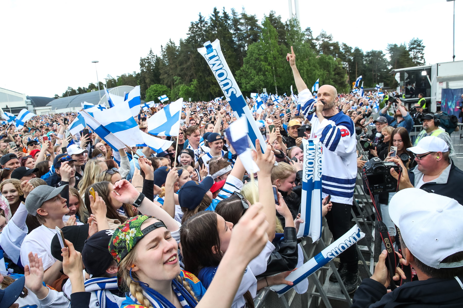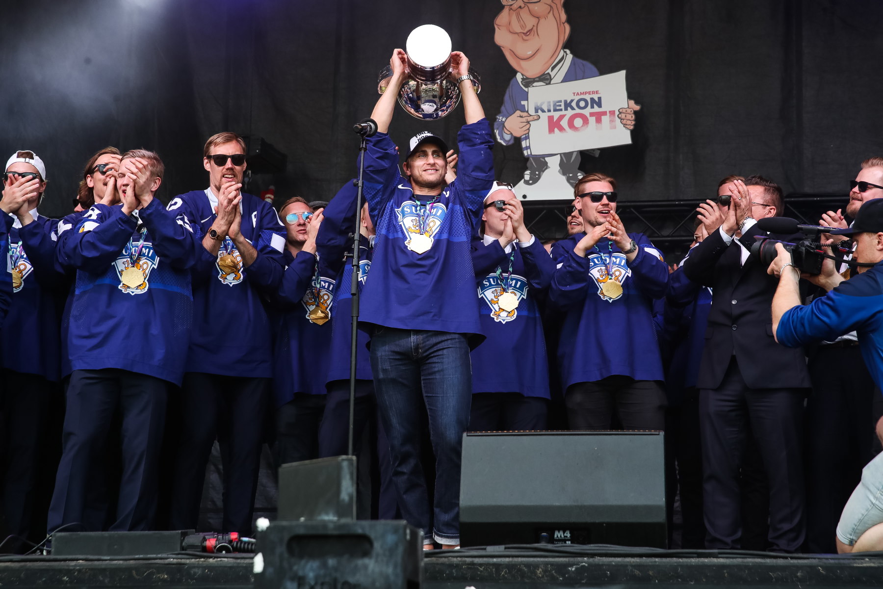 Once they had gathered in Tampere, the celebration followed the usual format, with popular artists entertaining the fans before the team took the stage, first the support staff, then the assistant coaches, and then the players in the order of their jersey numbers, except for two.