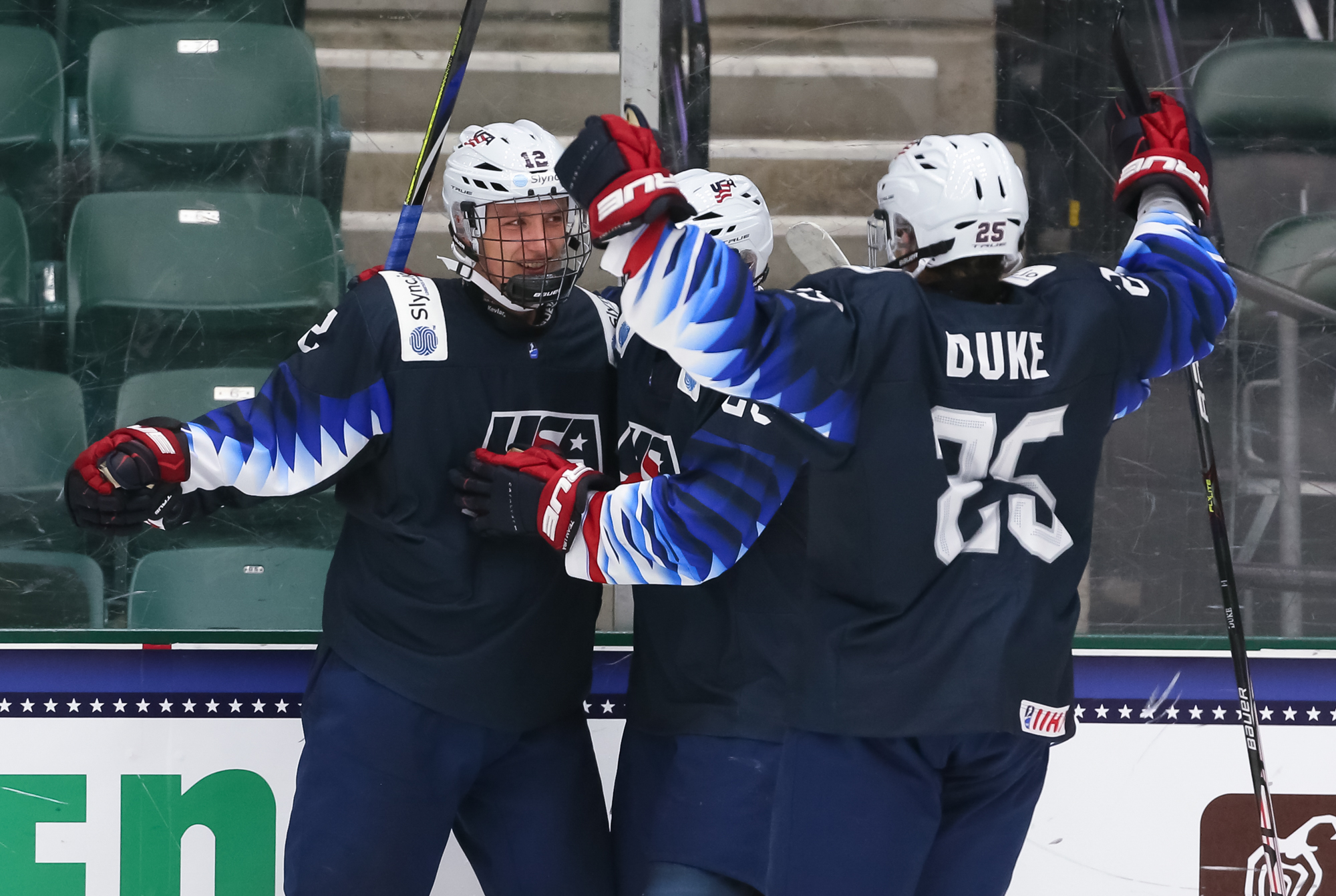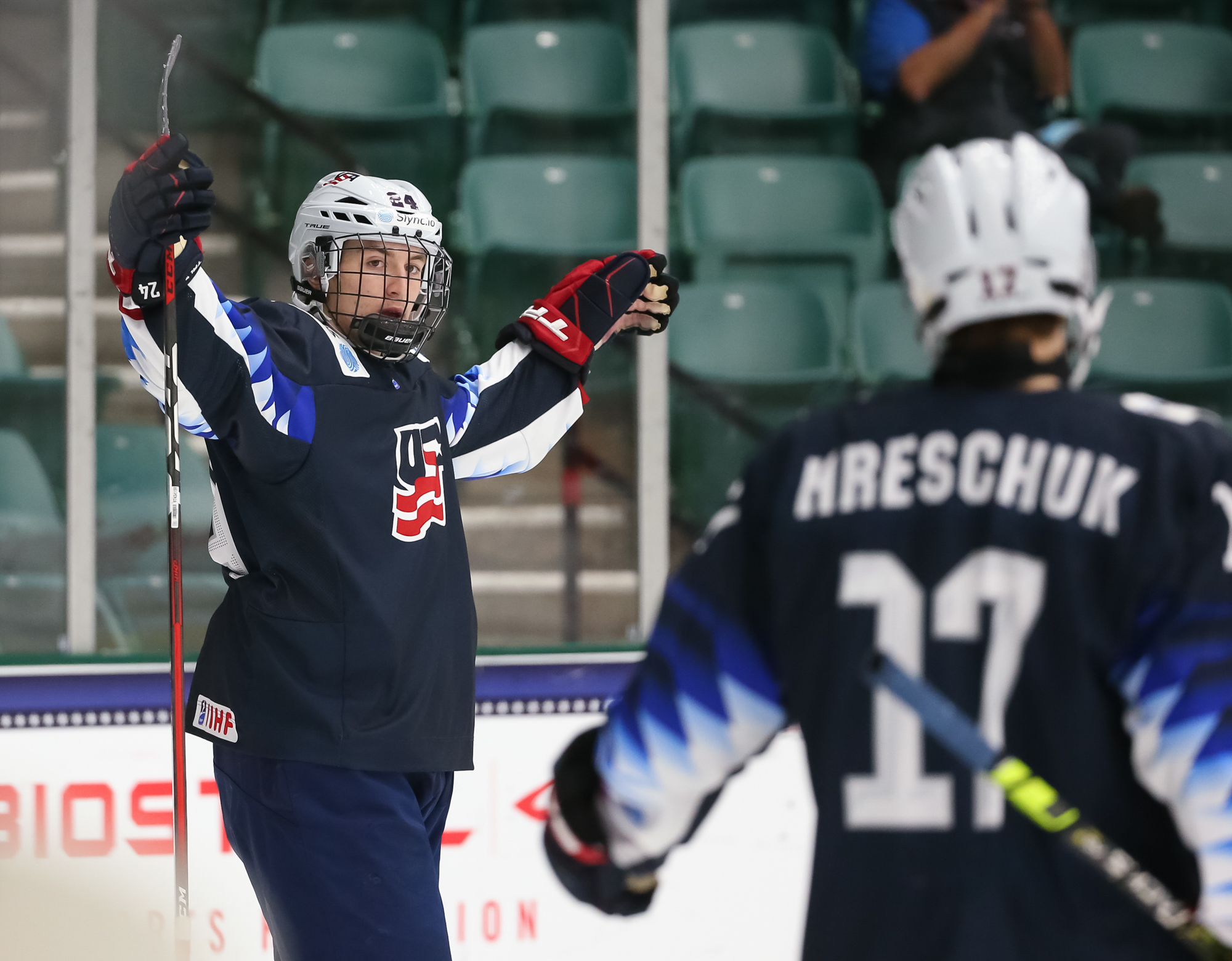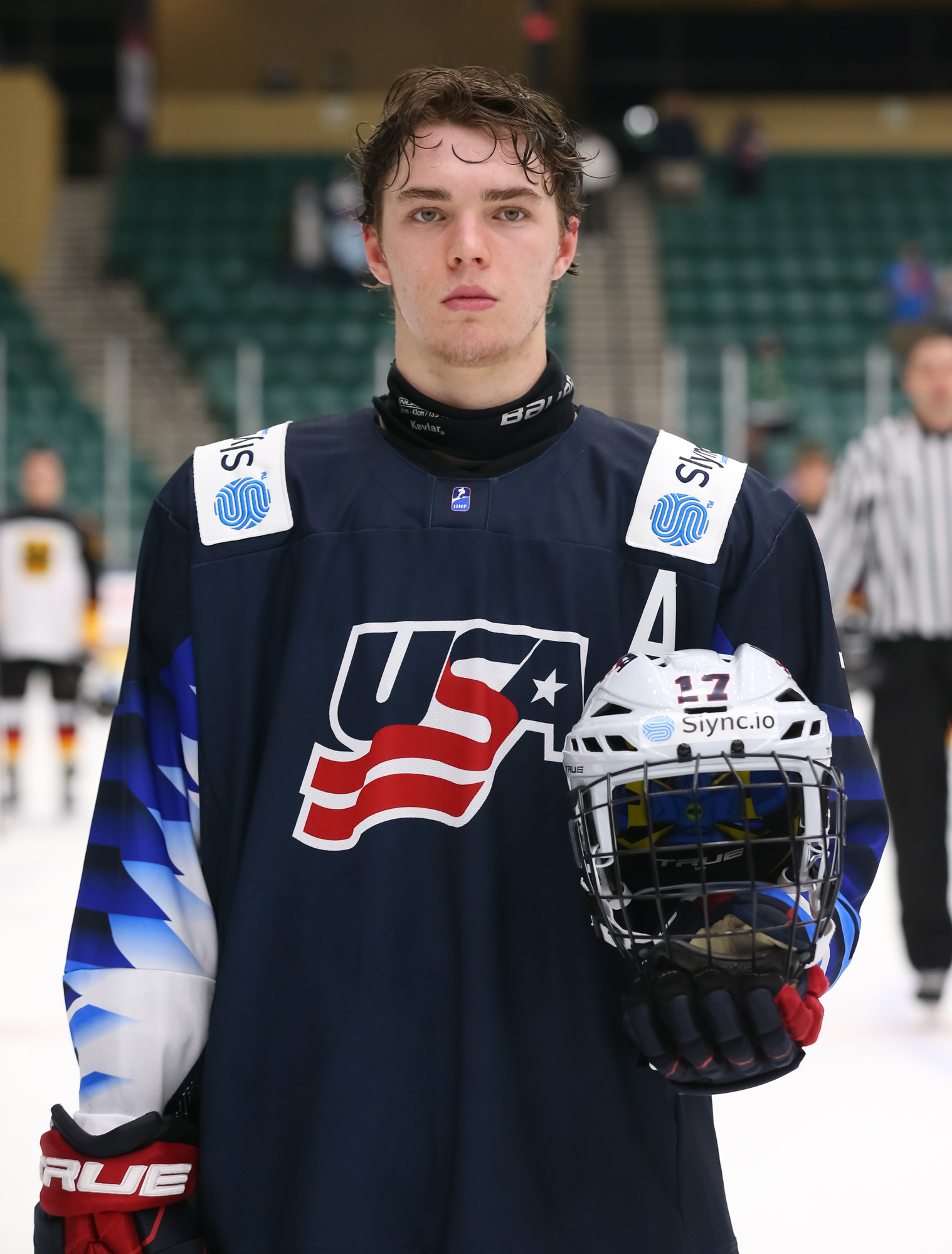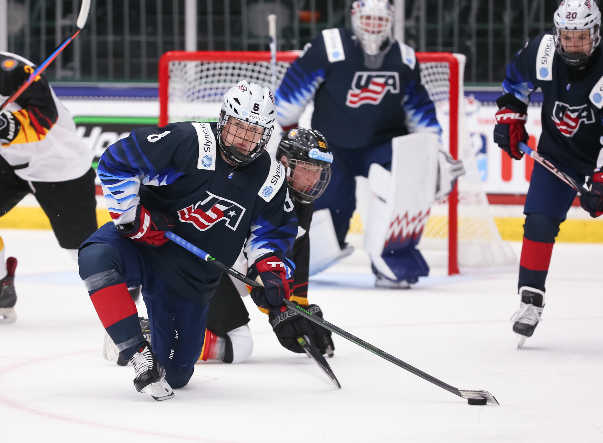 At 7:35, the towering Charlie Stramel put the U.S. up 4-2 with a breakaway goal, maintaining his focus as German defenders lunged with sticks and scoring on the forehand. Seconds later, Wolf had to be sharp to stop Logan Cooley on yet another breakaway.