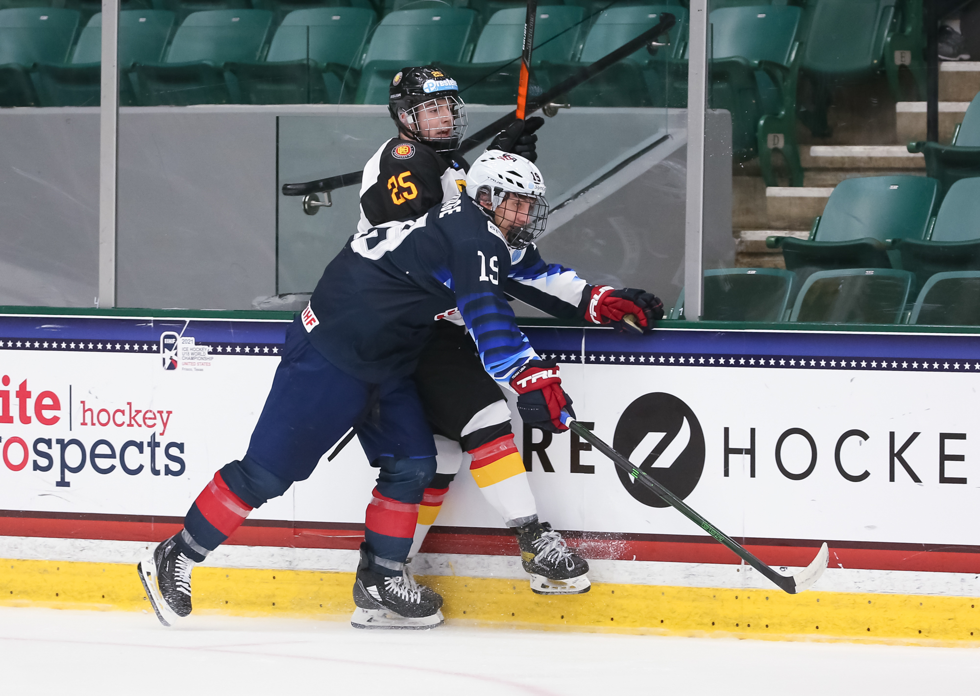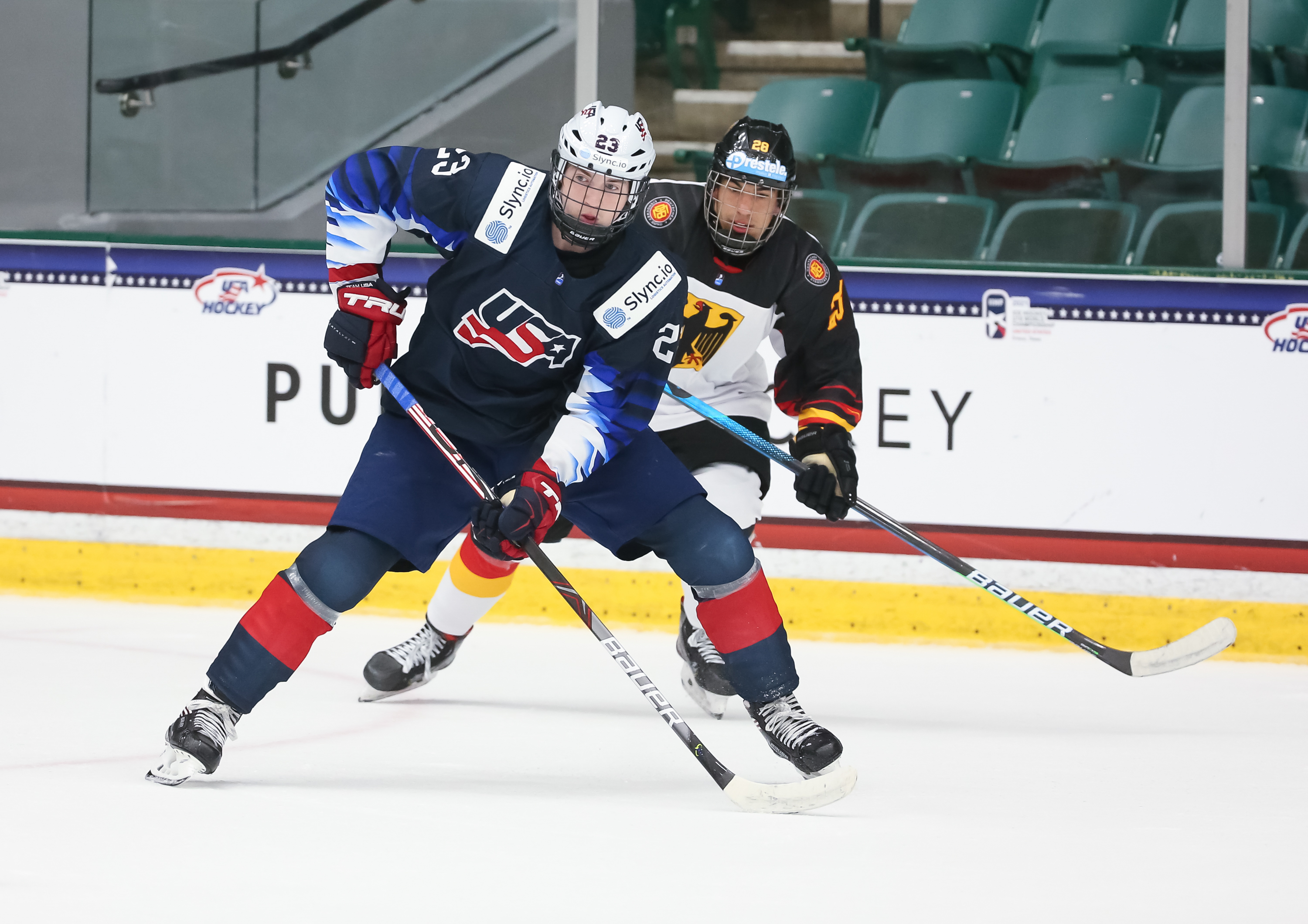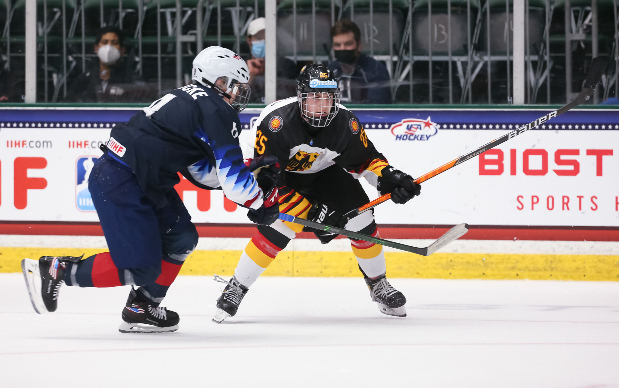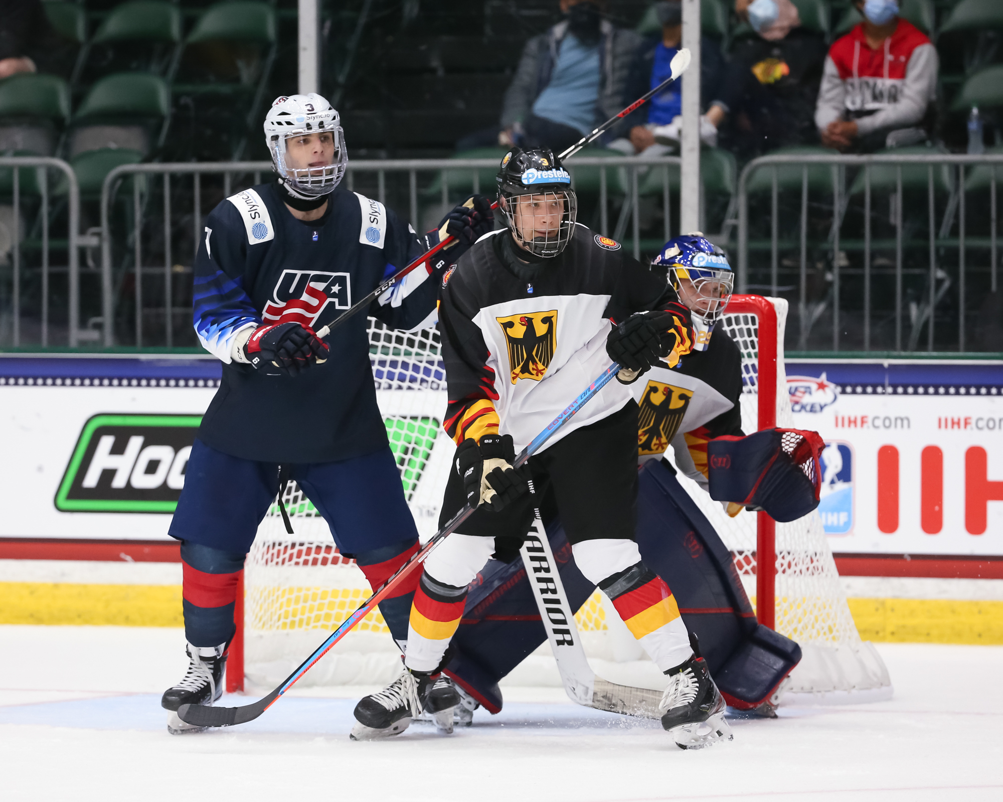 In the second period, the Germans managed to slow the pace and clog up the ice. Sasha Pastujov gave the U.S. some breathing space at 12:40 with his second U18 Worlds goal when he jammed in a rebound at the side of the net for a 3-1 lead.