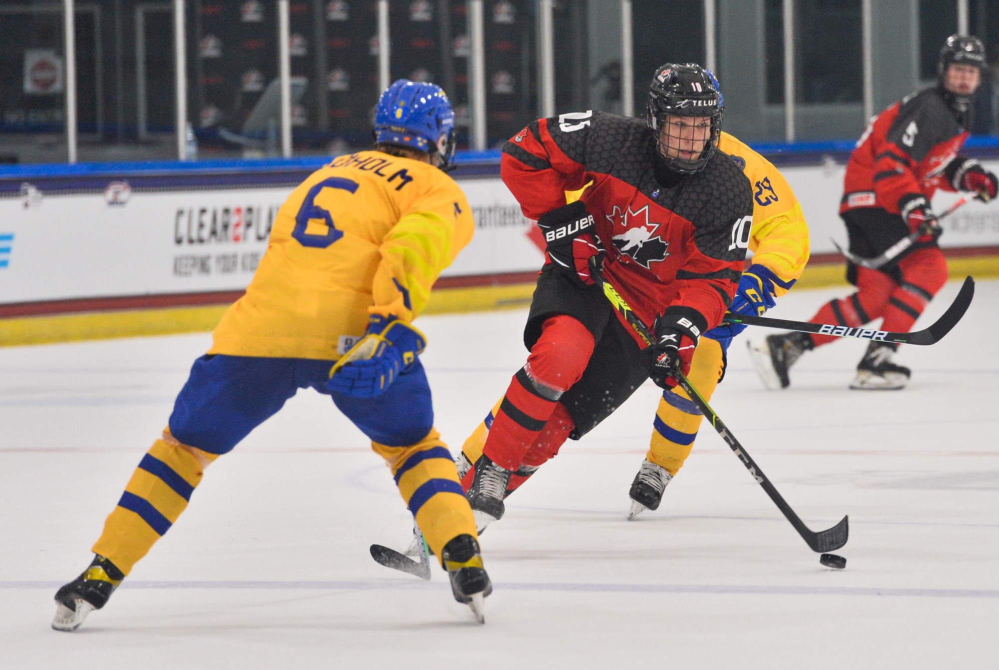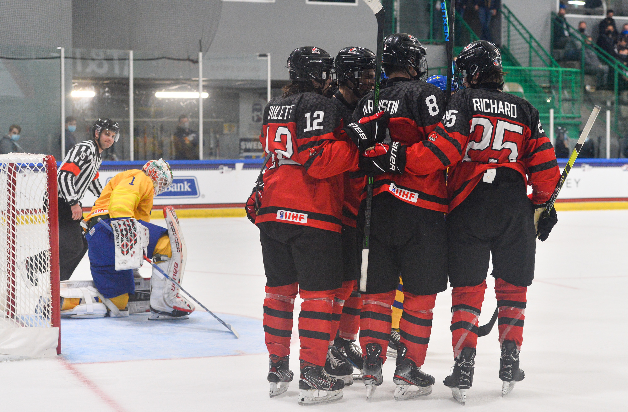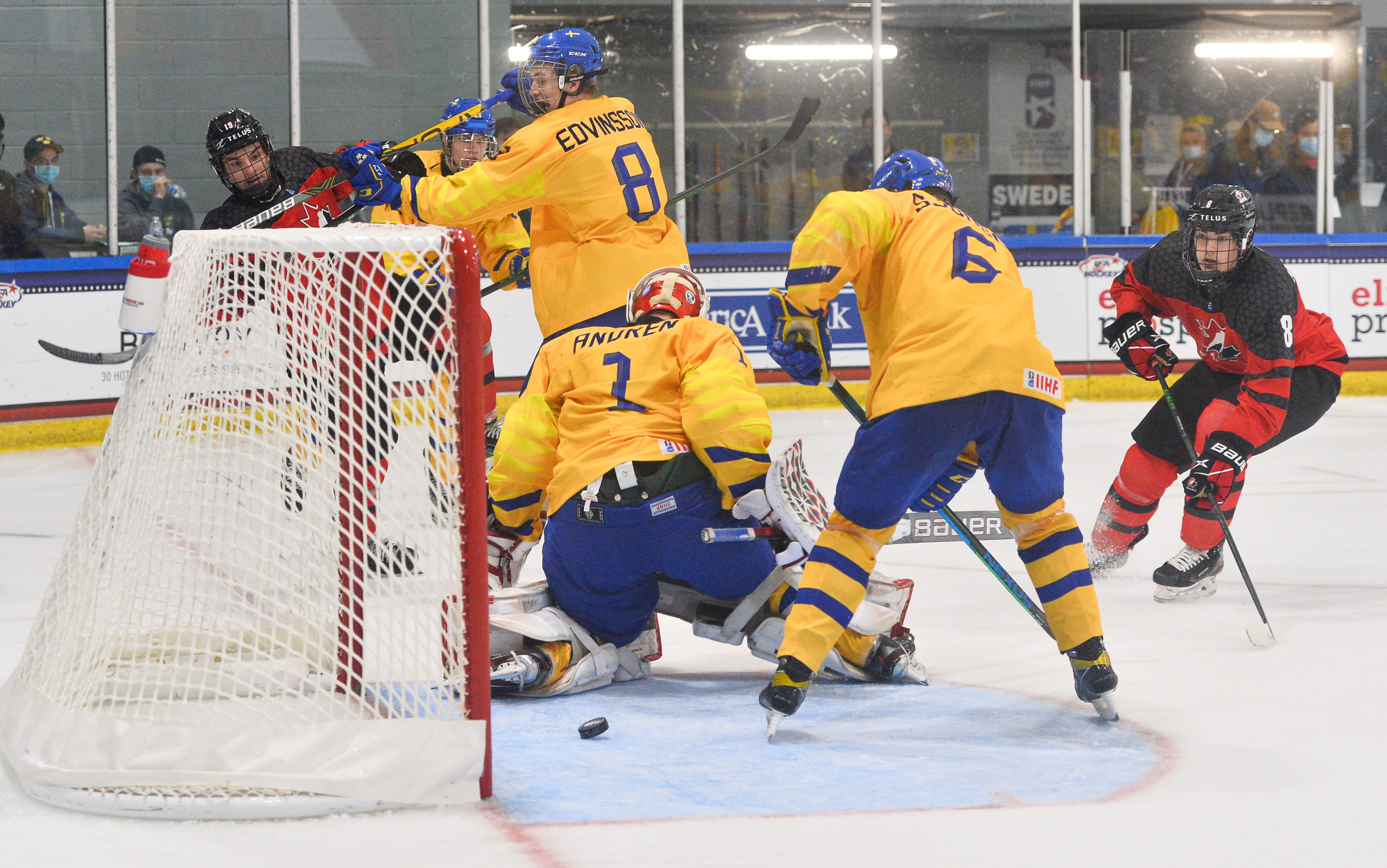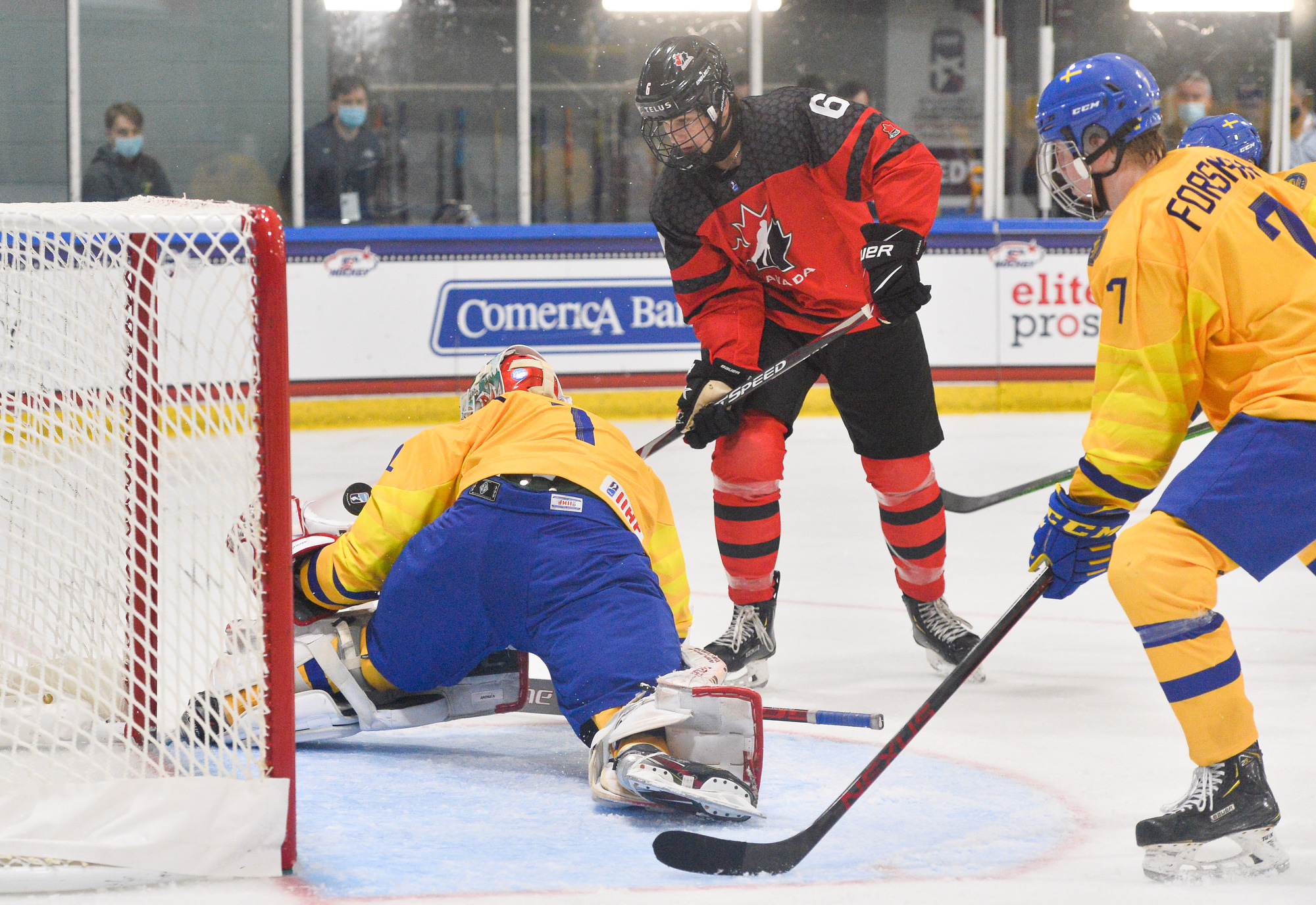 Canada then scored two quick goals to extend its lead. First, 15-year-old Connor Bedard drove down the right side and got the puck to the front where Brett Harrison’s shot beat Lindbom. Just 75 seconds later, Pinelli made it 4-0, forcing Eriksen to make a goaltending change and giving Viggo Andren his first action of the tournament.
