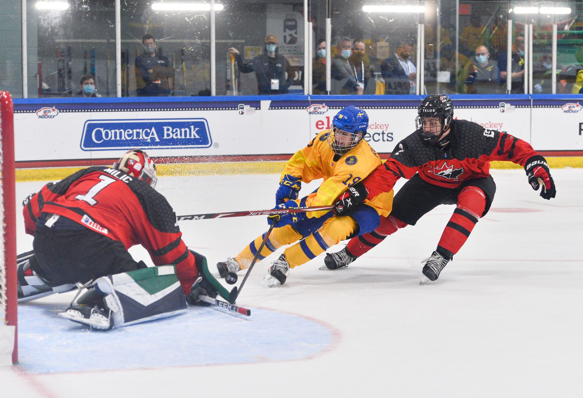 Five minutes later, Clarke made it 2-0 on a similar shot from the other faceoff dot. Canadian goalie Thomas Milic made his best save soon after. Olen Zellweger made a bad giveaway at his blue line allowing William Stromgren to go in alone, but Milic made a fine toe save to keep it 2-0.