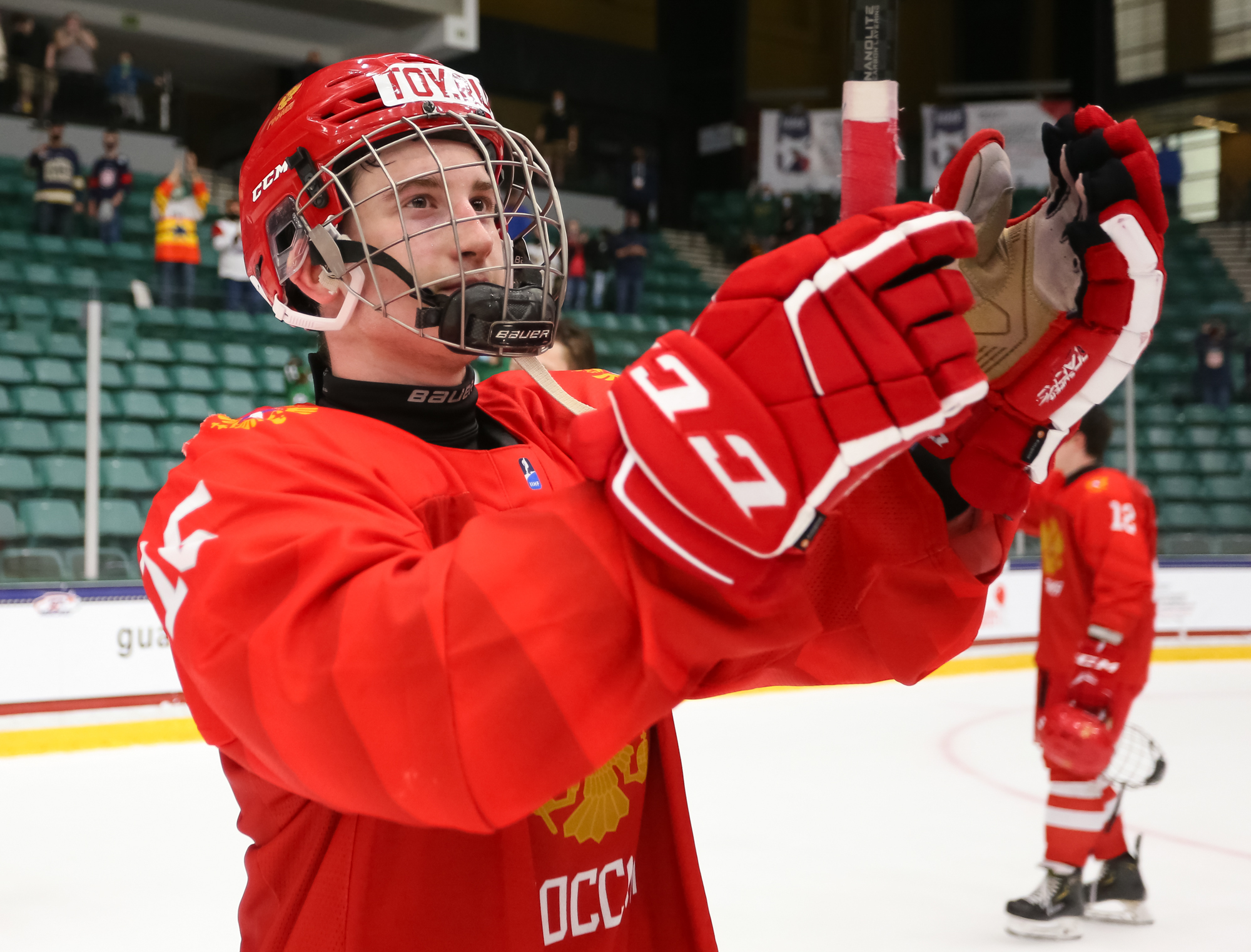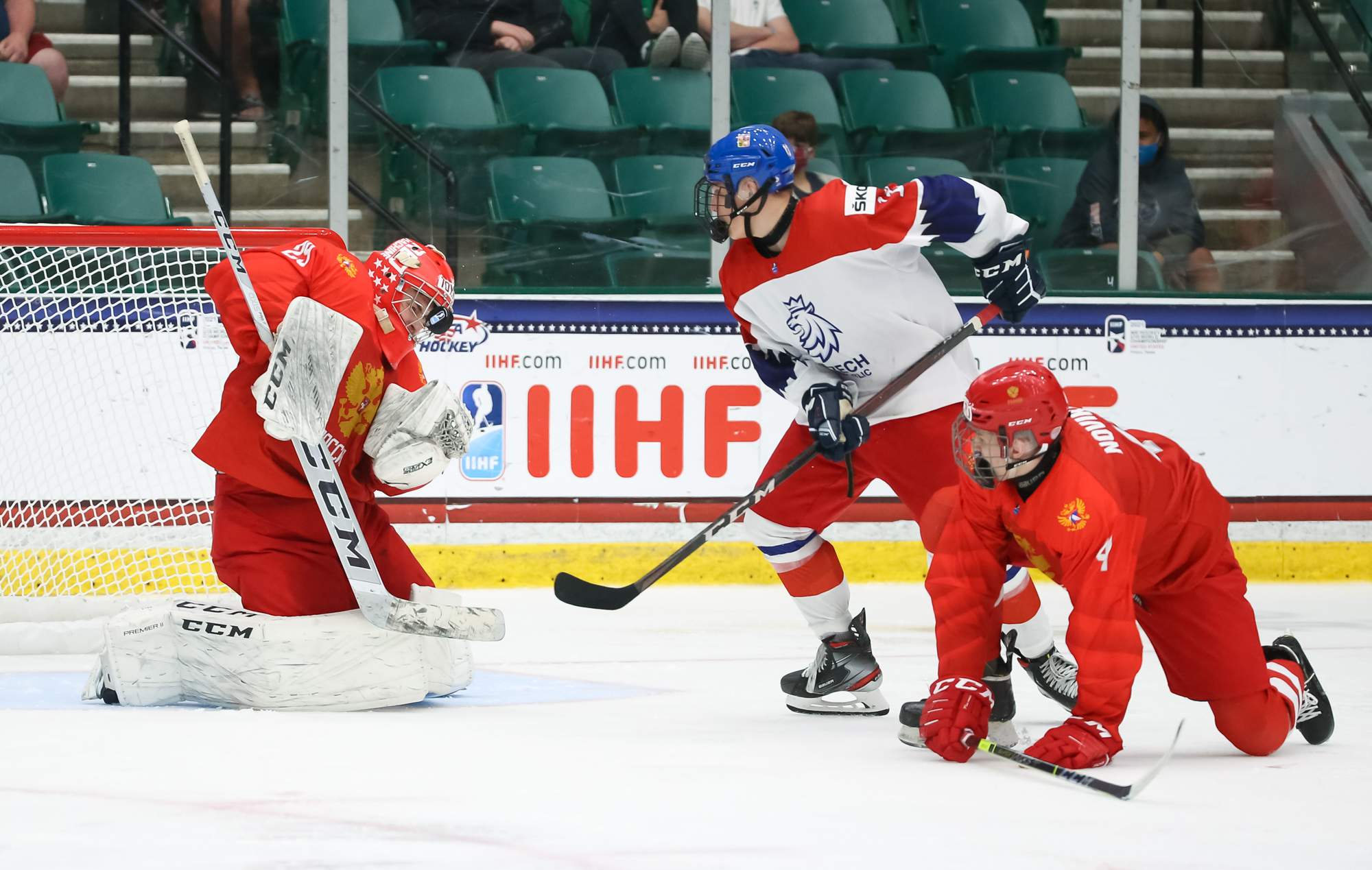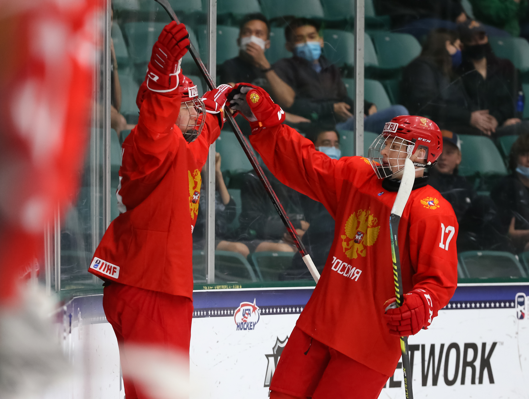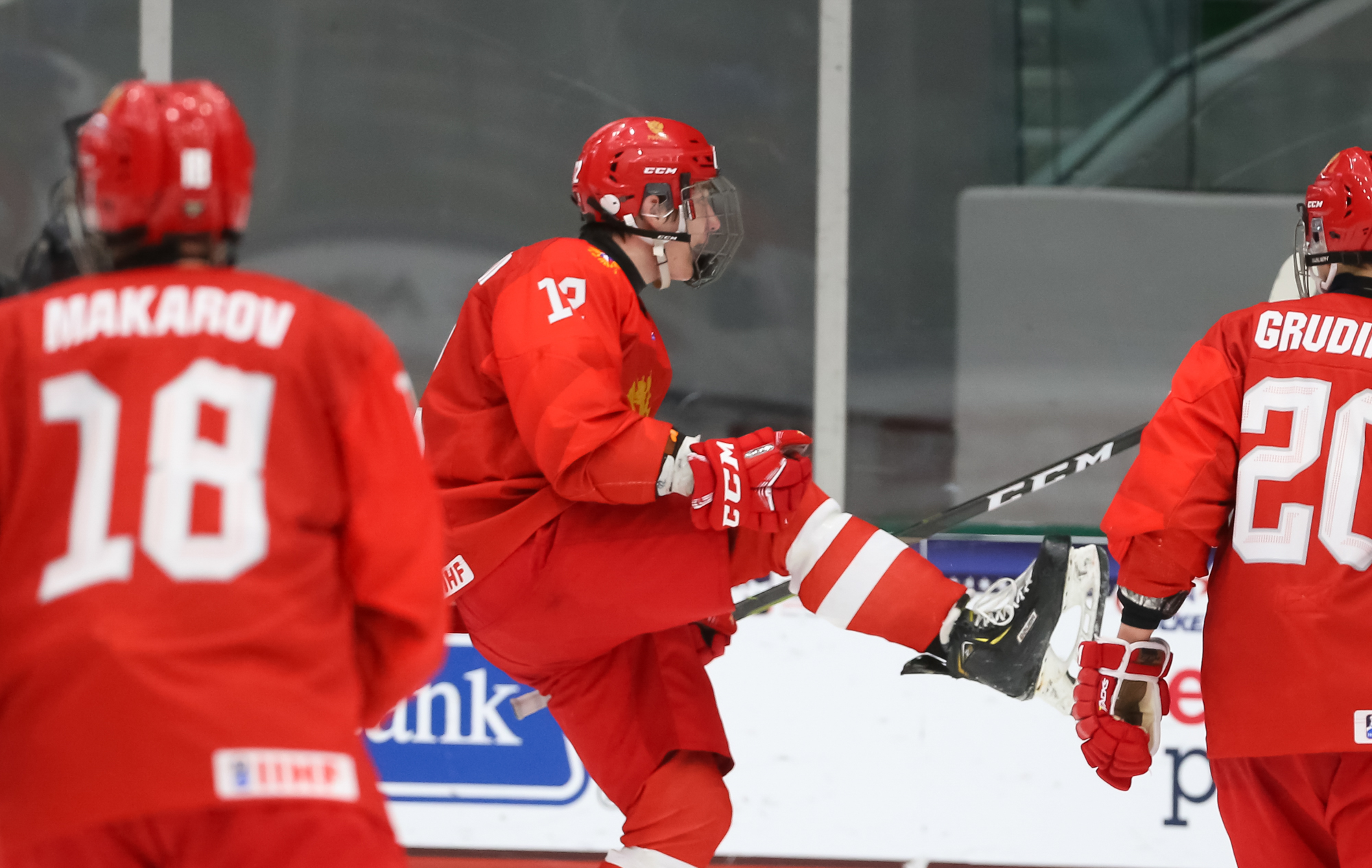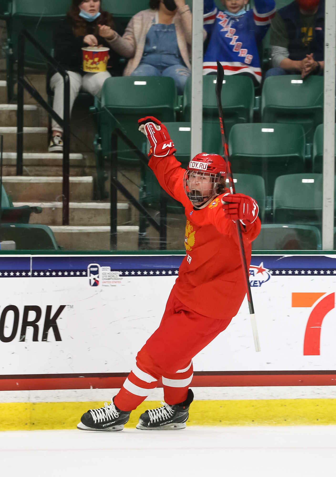 Prokhor Poltapov (#13) was one of three Russians with a multi-goal game in the 11-1 victory over the Czech Republic to round out Group B action at the 2021 U18 Worlds.