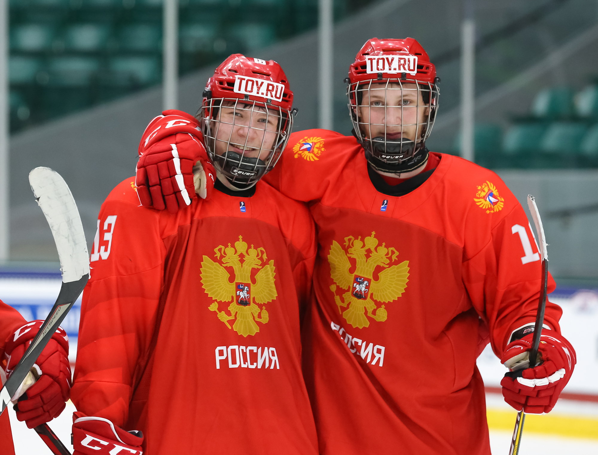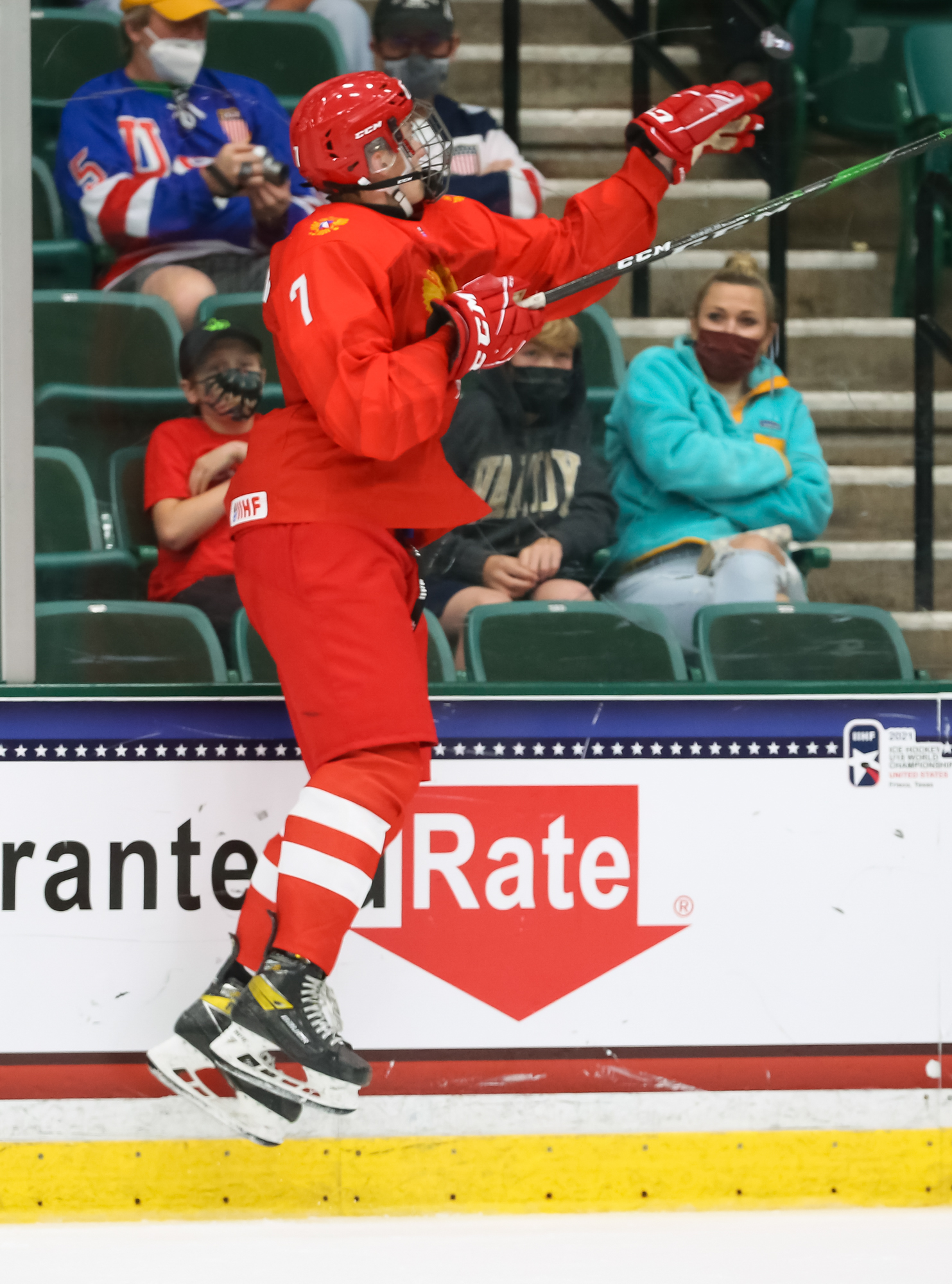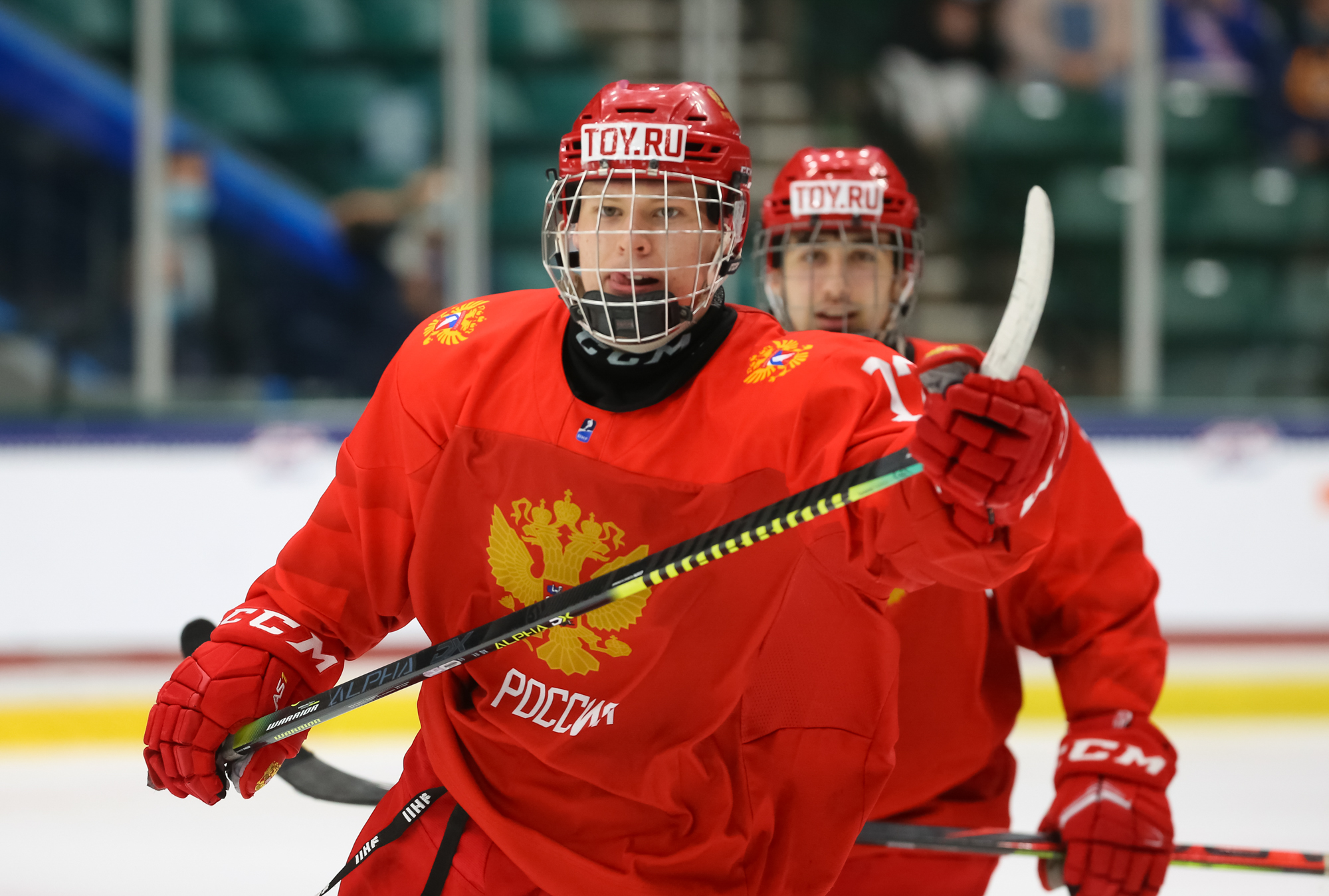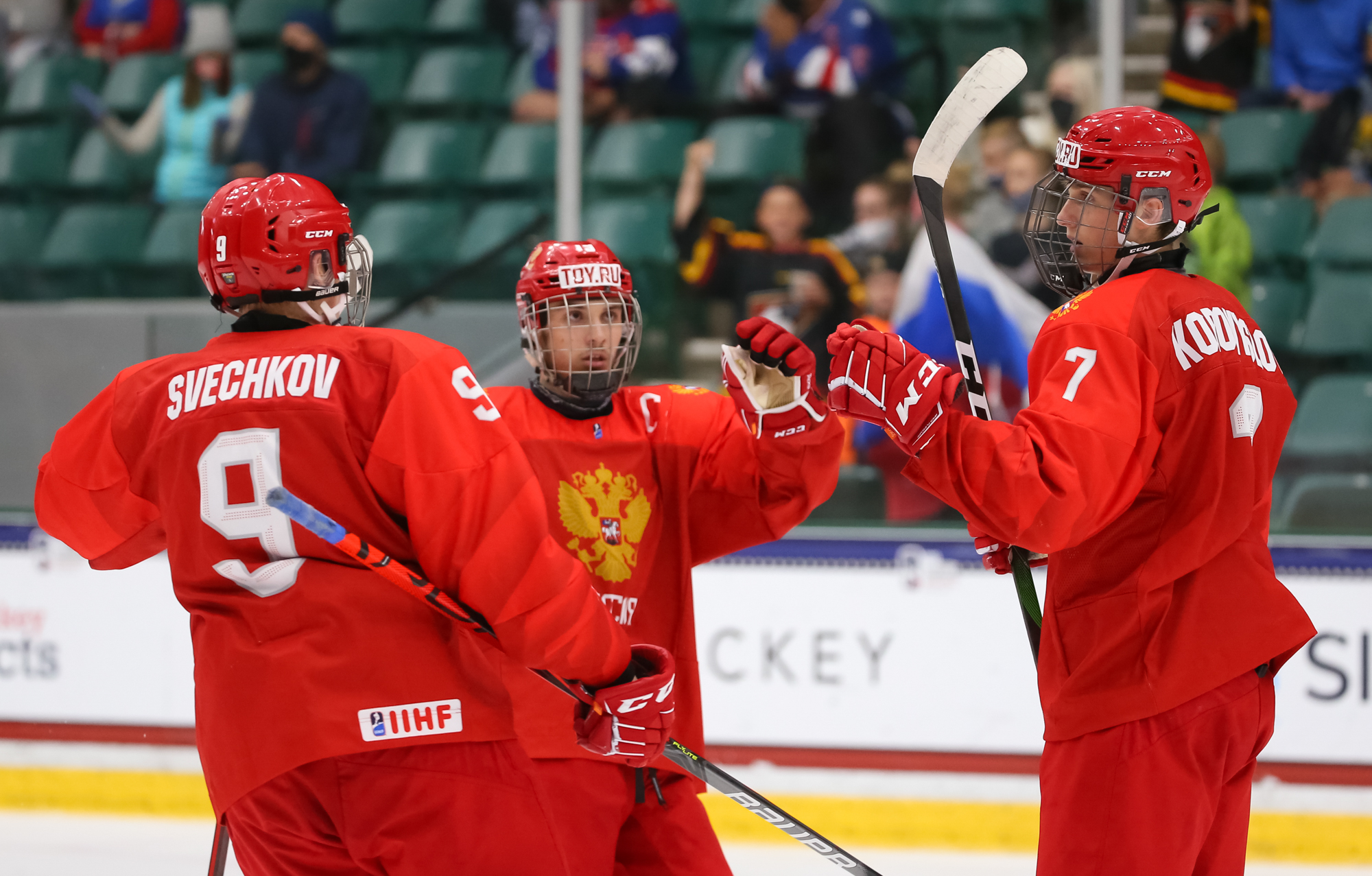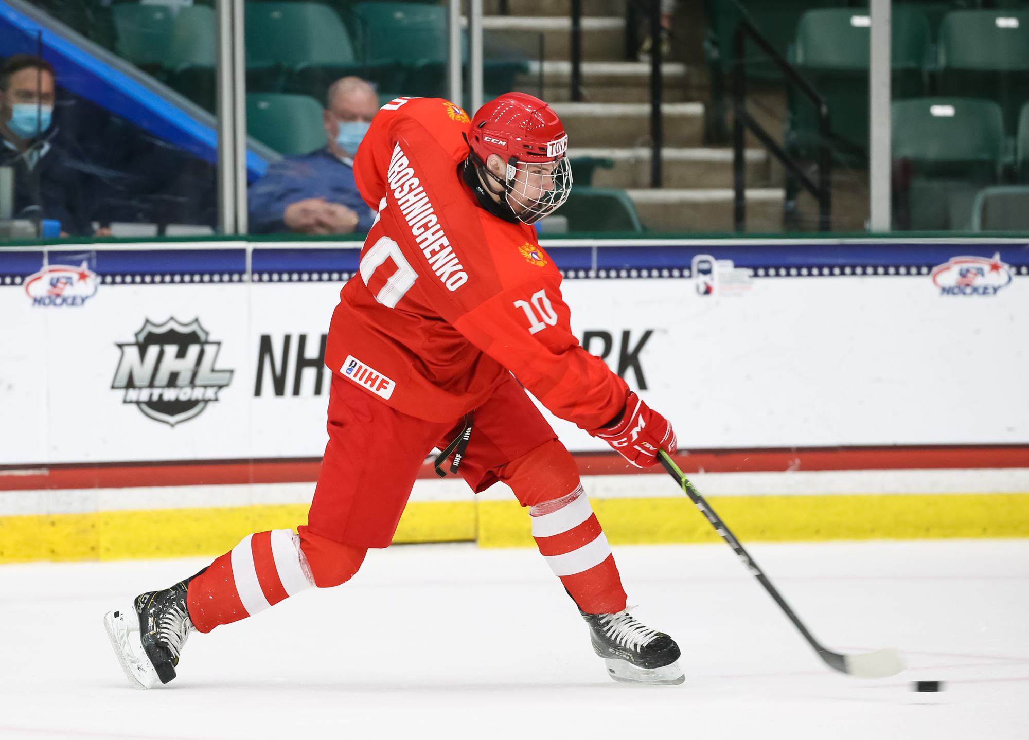 Prokhor Poltapov (#13) was one of three Russians with a multi-goal game in the 11-1 victory over the Czech Republic to round out Group B action at the 2021 U18 Worlds.