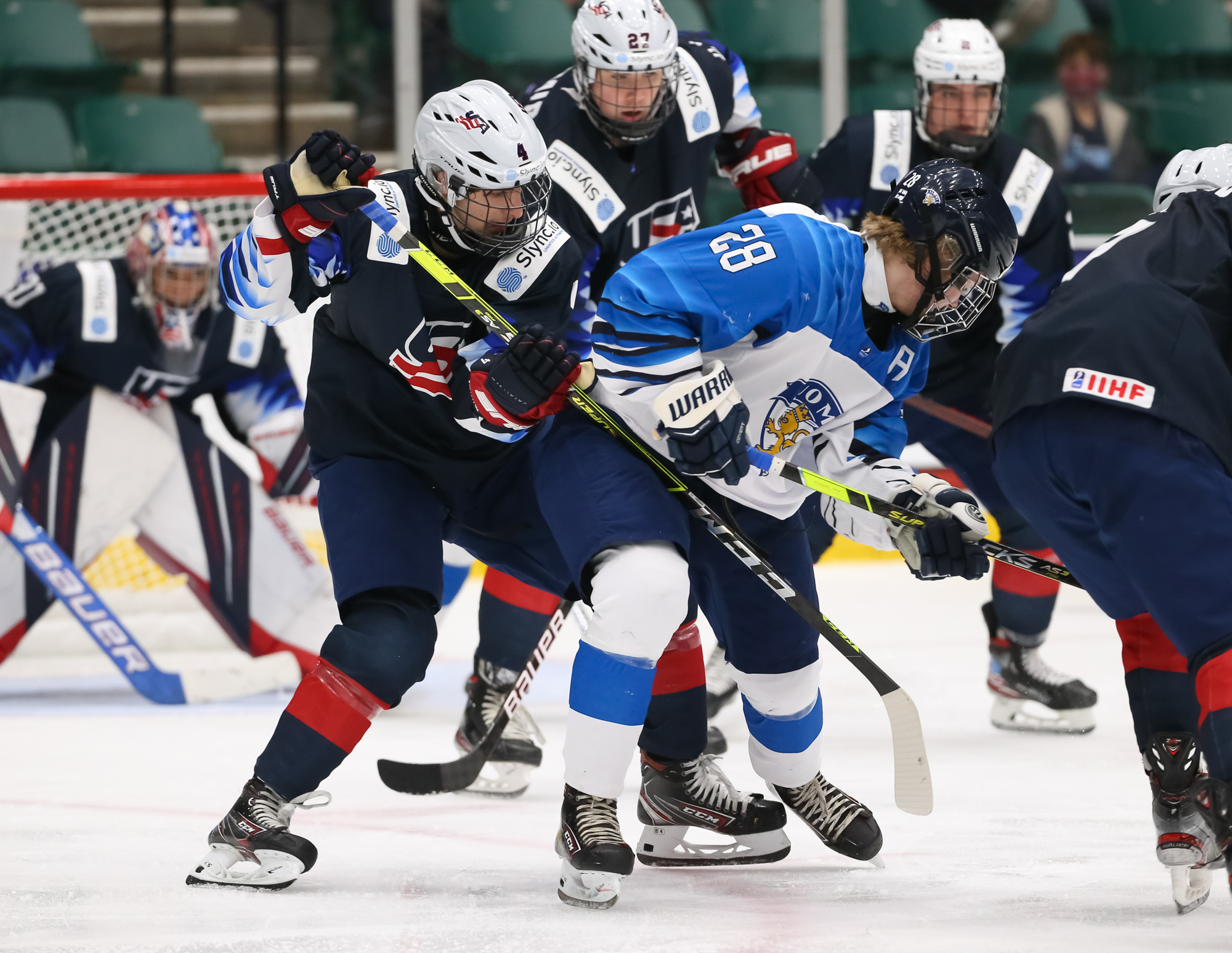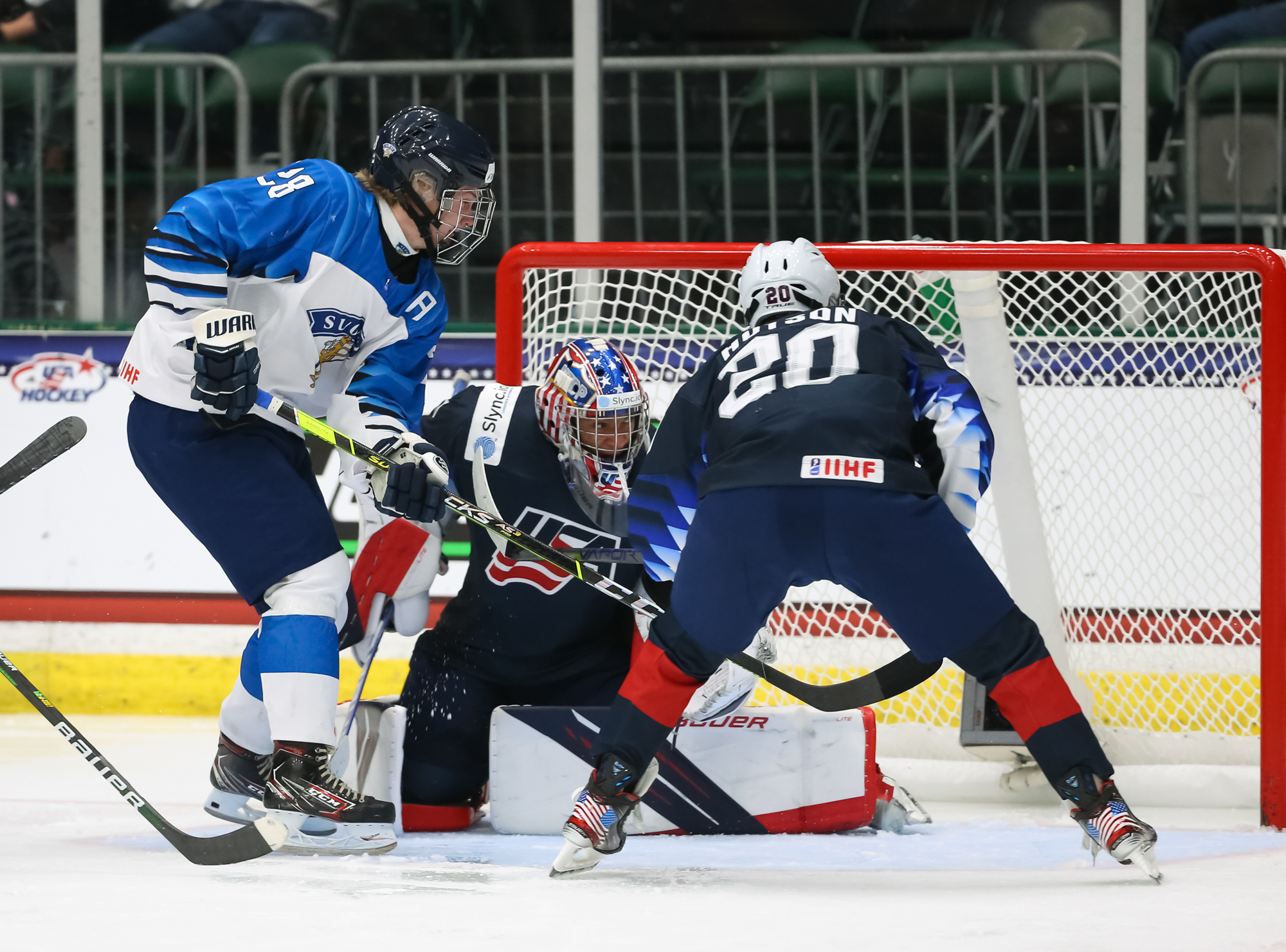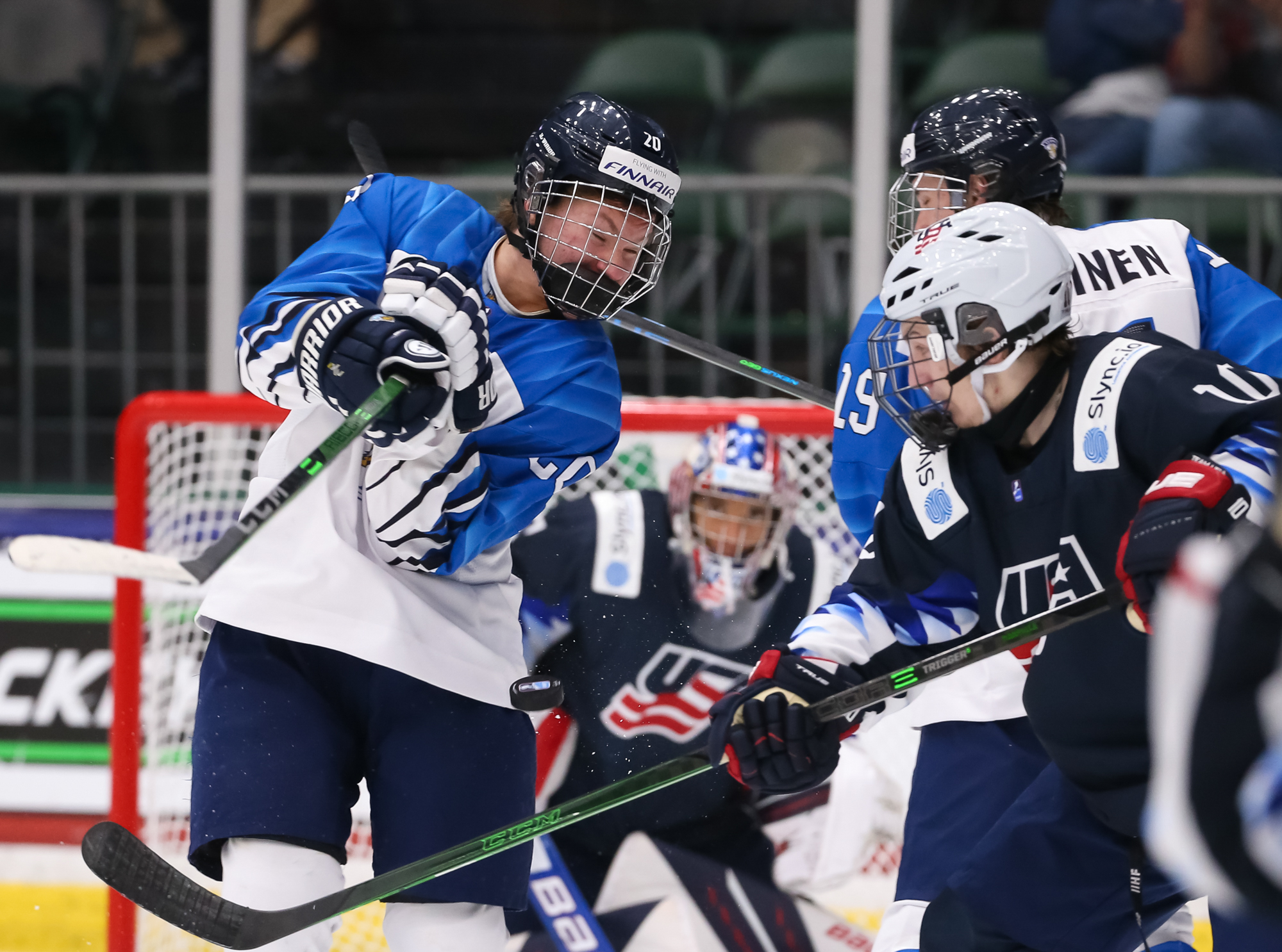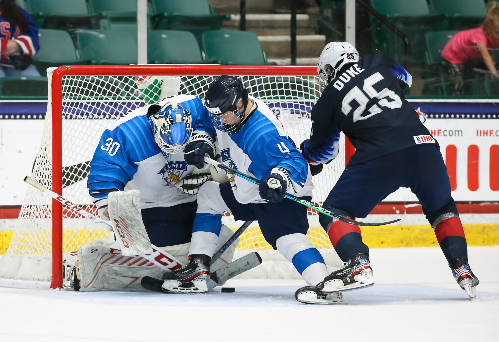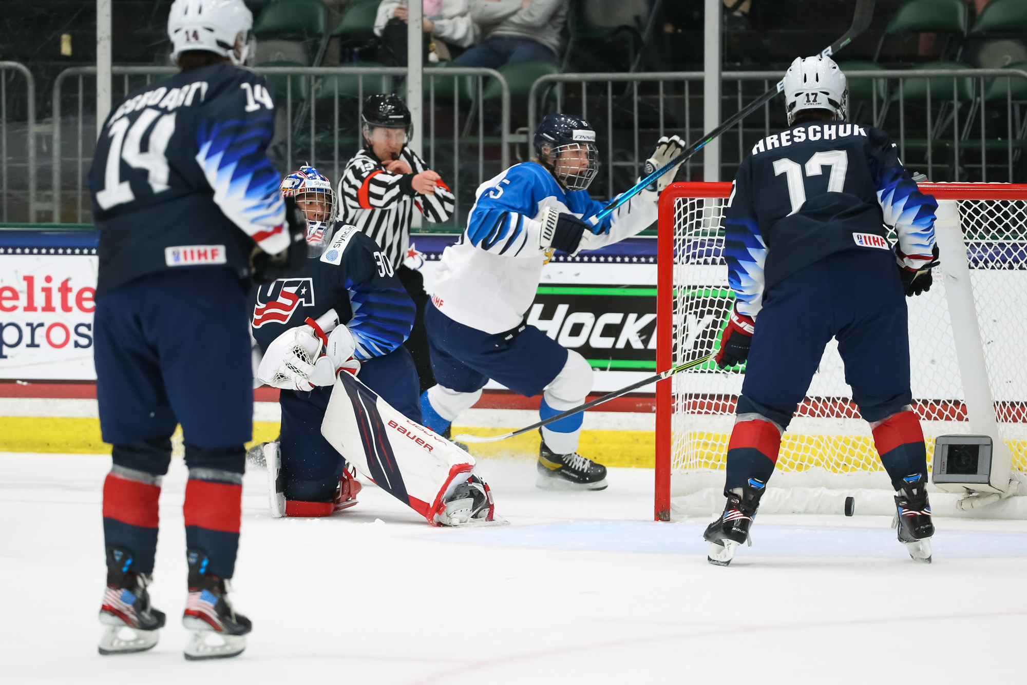 The Finns went up 4-3 at 13:26. Off a draw in the U.S. end, Sisu Yliniemi went to the net and deflected Viljami Juusola's centre point shot through Mbereko.