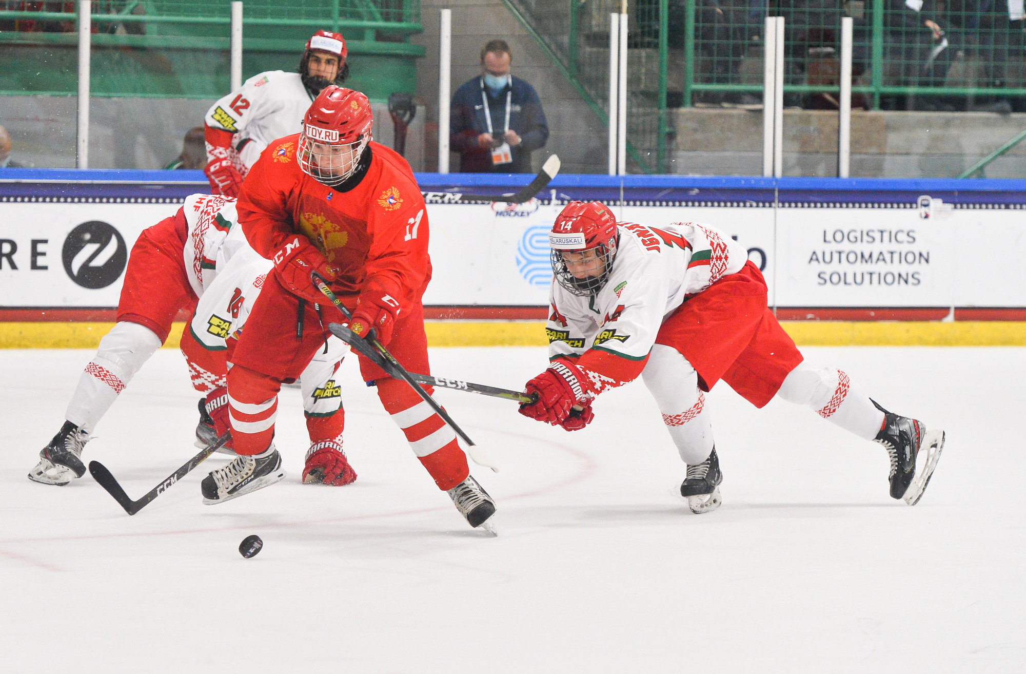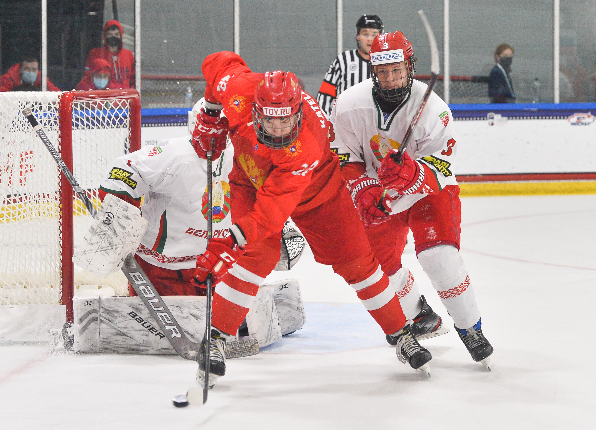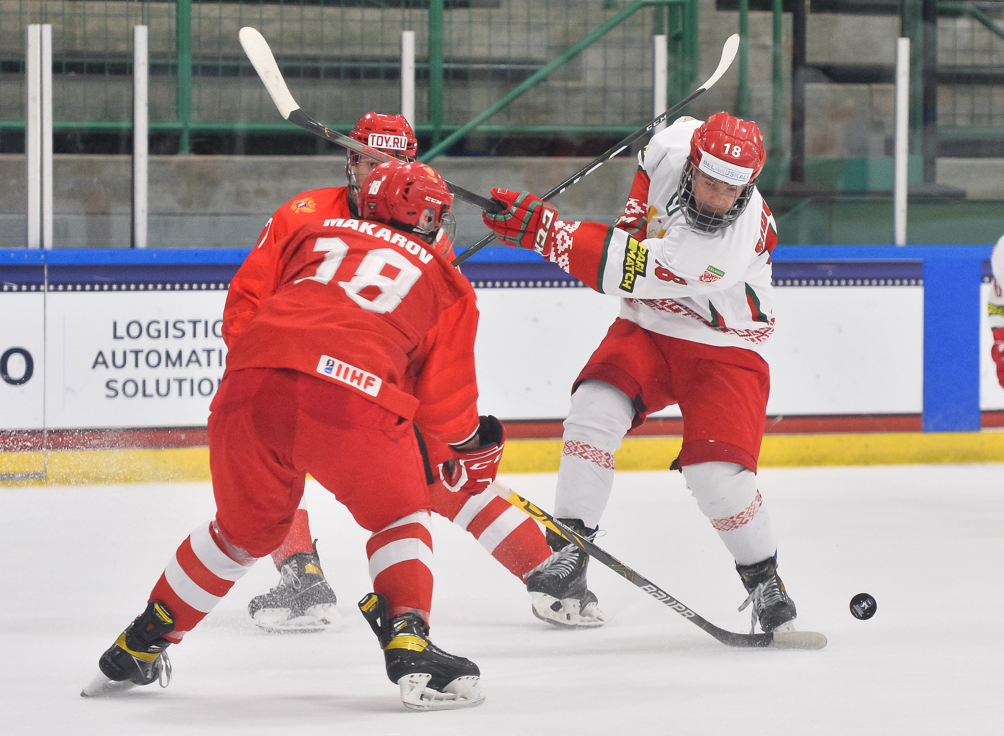 Less than four minutes later, it was 3-2. Belarus's Ivan Anoshko did a great job of winning a draw in the Russian zone and dishing the puck to Fyodor Nikolayenya, who made no mistake.
