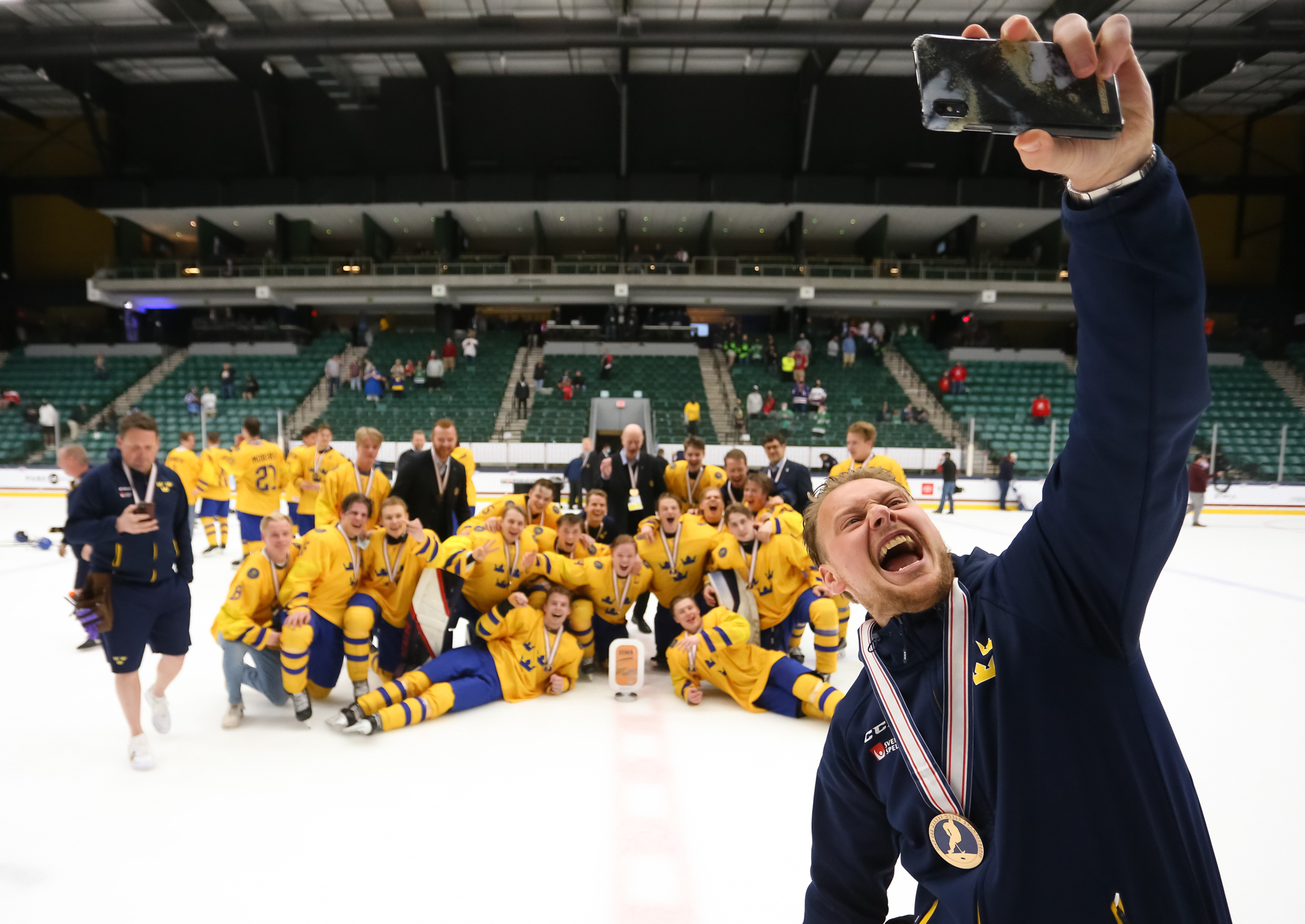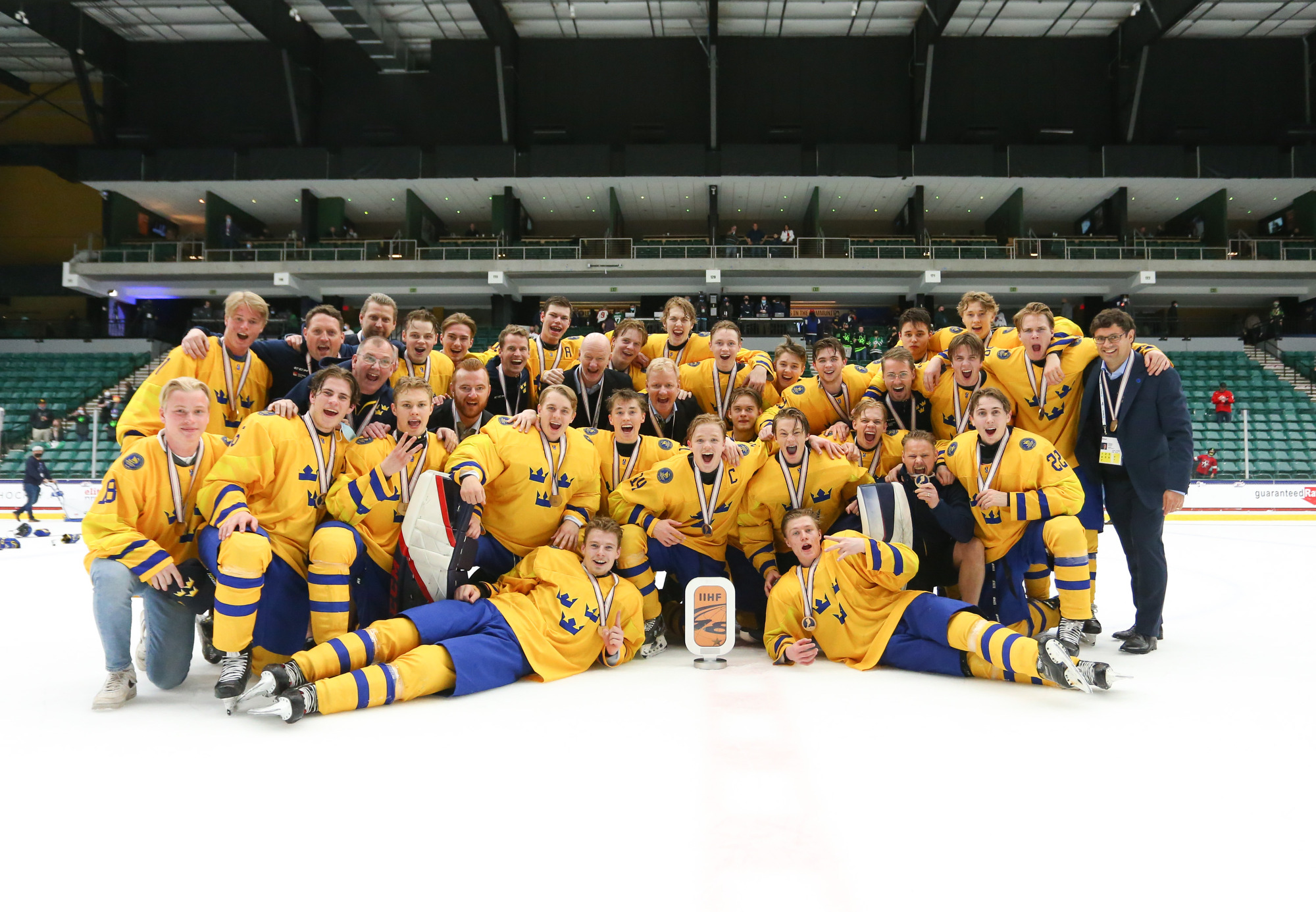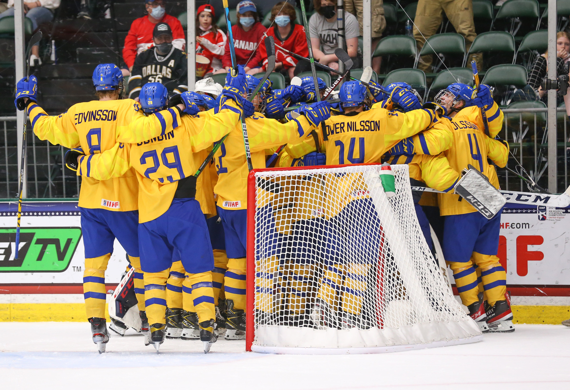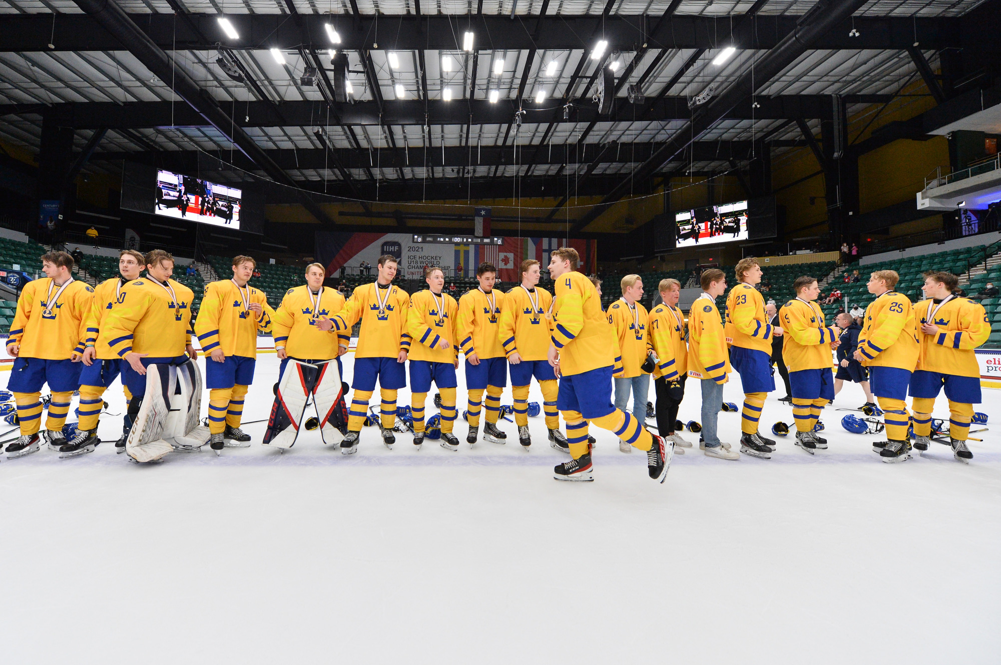 Sweden rejoices after an 8-0 win over Finland in the 2021 IIHF Ice Hockey U18 World Championship bronze medal game in Frisco, Texas.