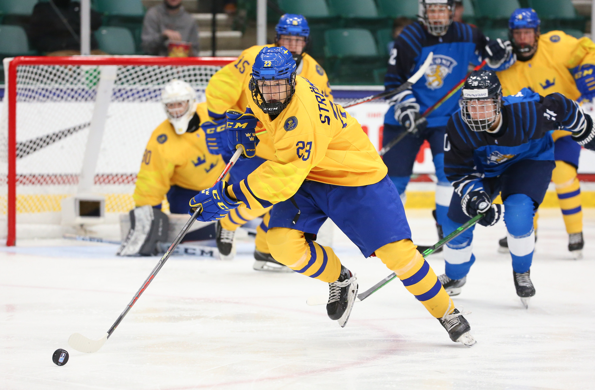 At 5:00, on the same man advantage, Sweden drew first blood. William Stromgren lured Finnish starter Aku Koskenvuo to the ice before finding Rosen with a deceptive cross-ice pass. The Leksands IF prospect's one-timer hit the wide-open net for the eventual winner.