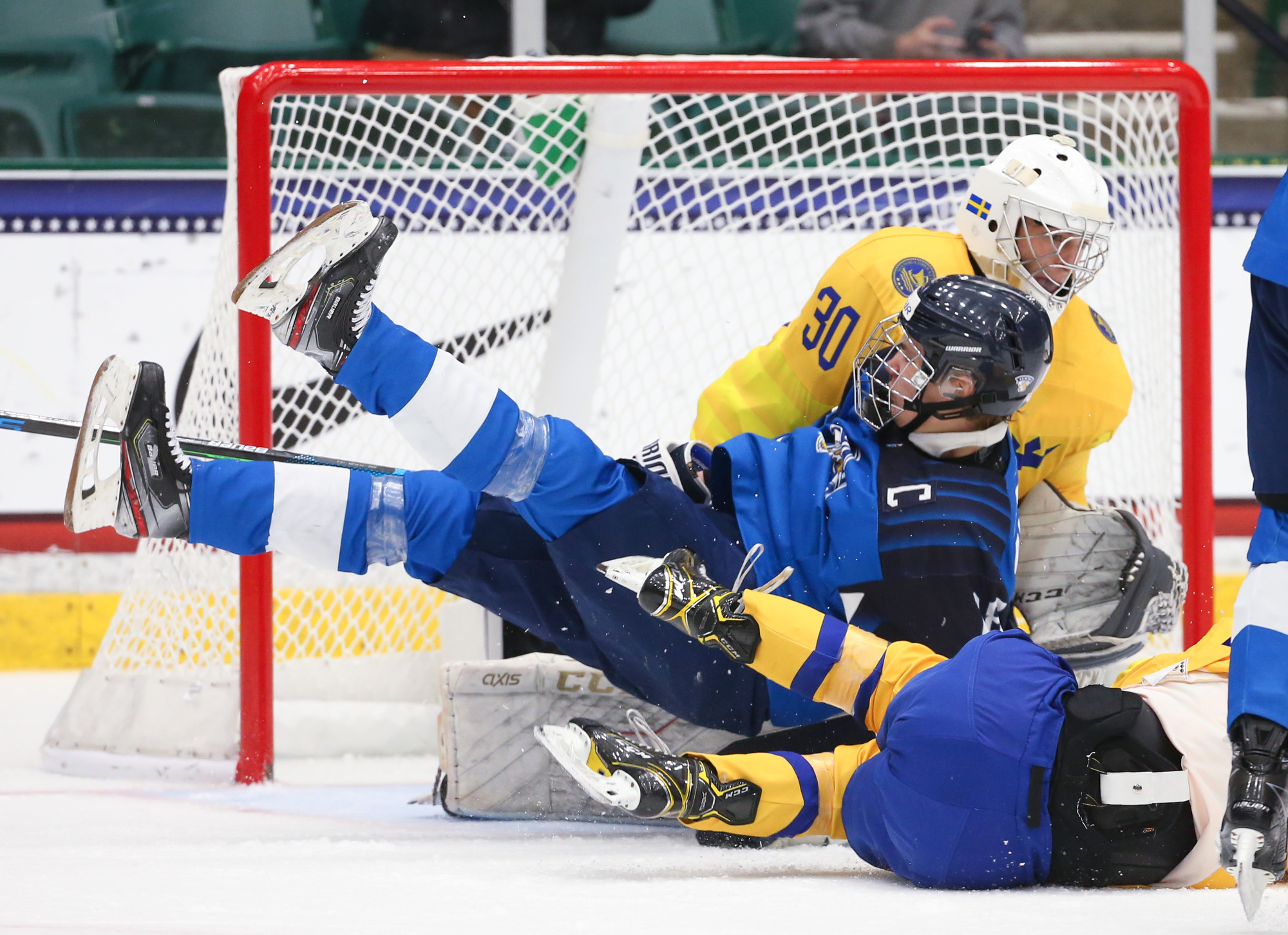 To kick off the second period, the Swedes besieged Koskenvuo's cage. He lost and regained his goalie stick, only to have a puck squeak through him. Niko Huuhtanen dived behind Koskenvuo to clear the disc away, but top Swedish defenceman Simon Edvinsson fired it home for a three-goal lead at 3:31.