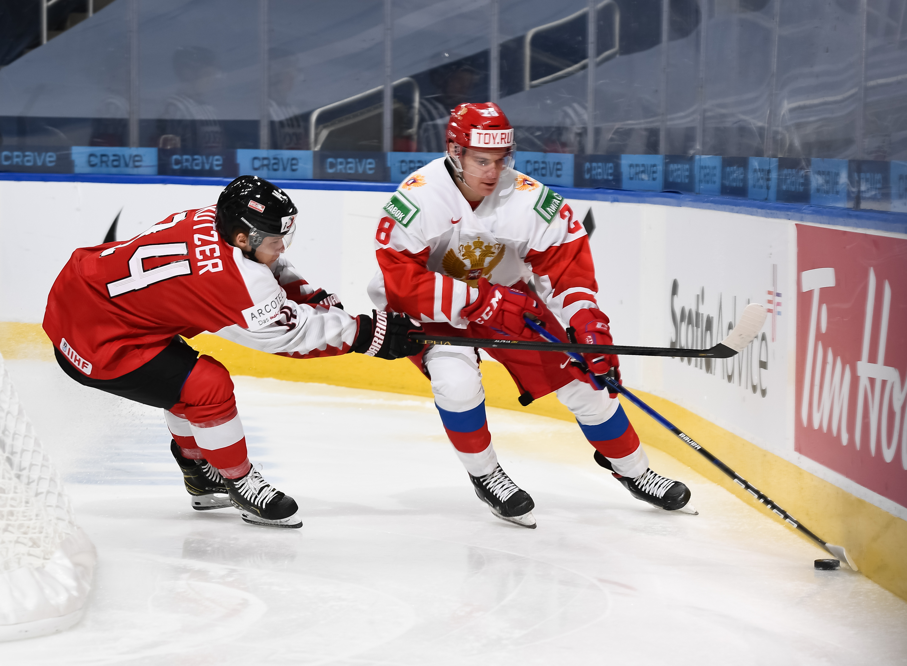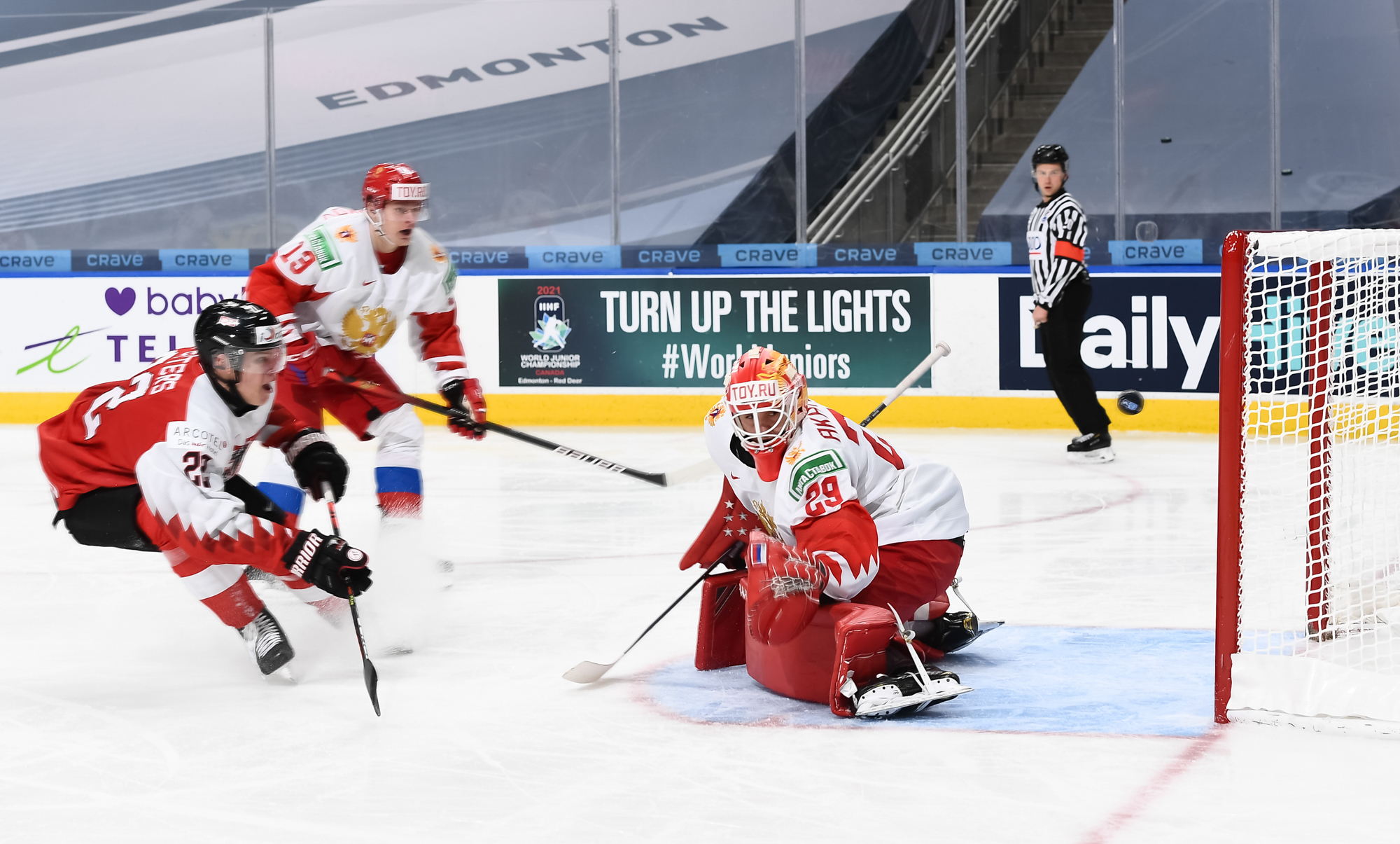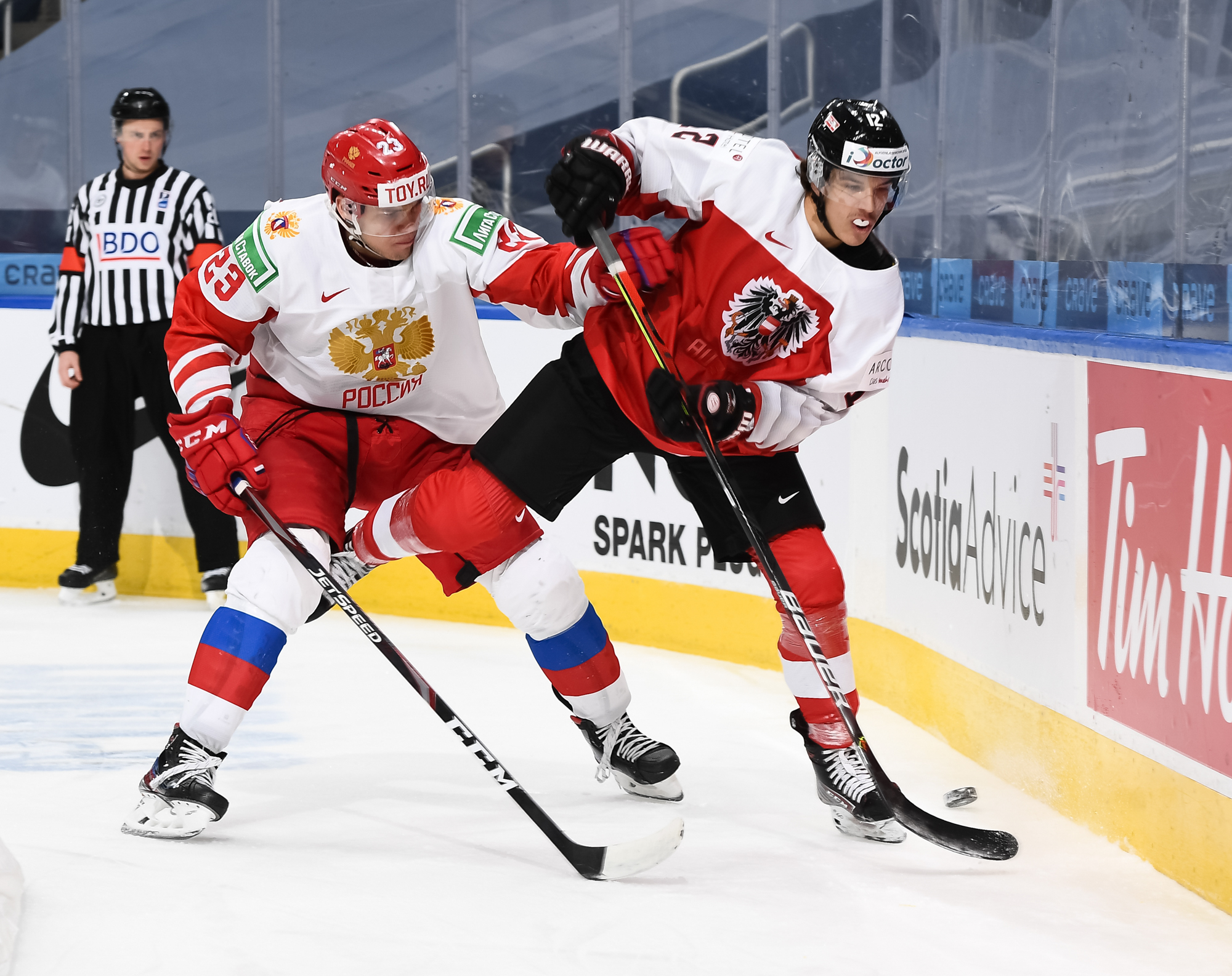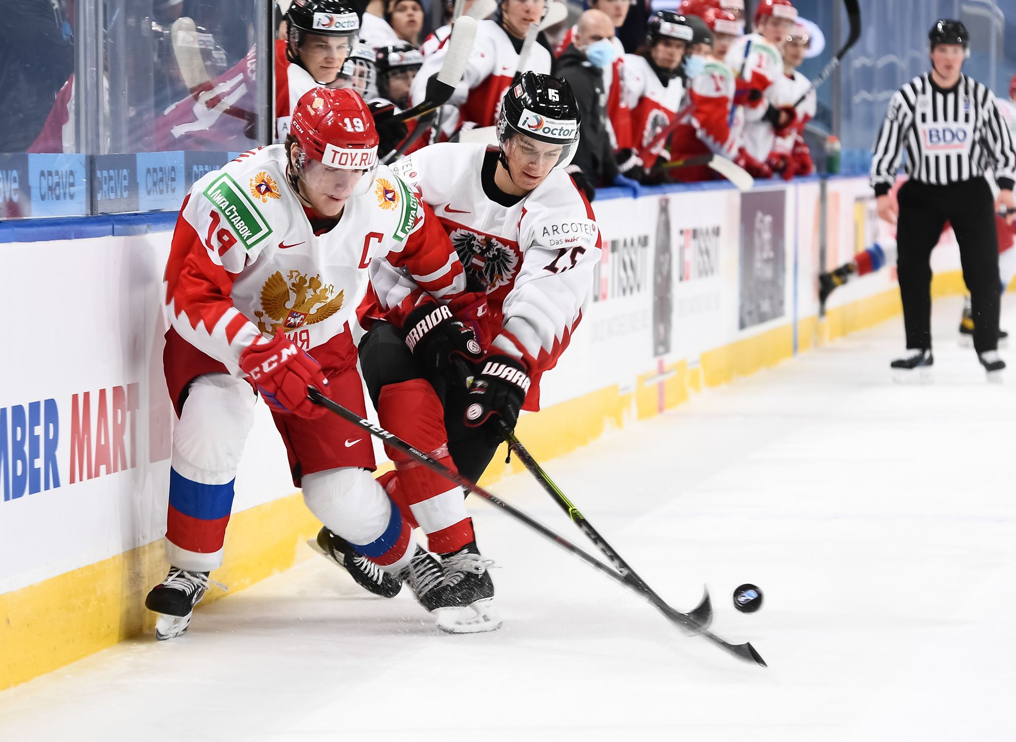 In the second period, Senna Peeters gave Austrian fans something to cheer about when he got the team's first goal of the World Juniors at 7:38. Breaking hard to the net, the Rogle Angelholm attacker lifted the stick of Vasili Ponomaryov to accept a nice pass from 16-year-old Marco Kasper and put the puck over Akhtyamov's glove.