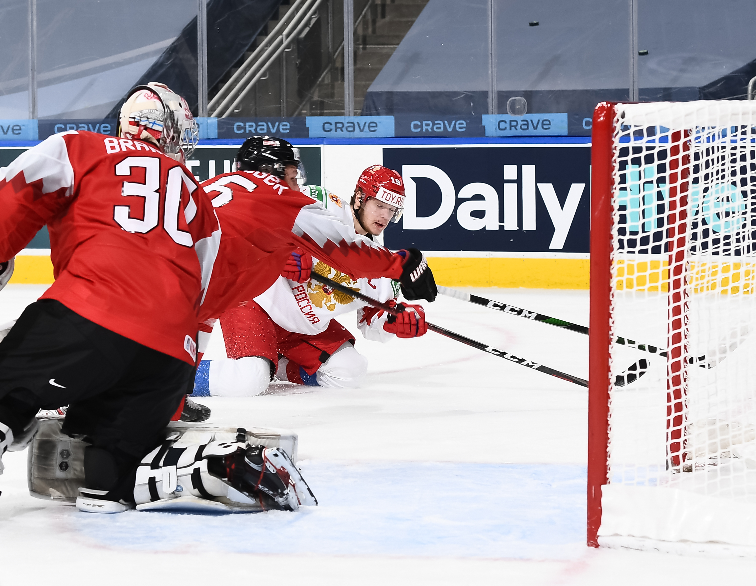 With a Roberto Luongo-style glove save, Brandner robbed Amirov on another Russian man advantage with about 10 minutes to go. However, Yegor Afanasiev batted in a rebound out of mid-air with 2:16 left. Arseni Gritsyuk sent a howitzer bar in with 1:31 remaining to round out the scoring at 7-1.