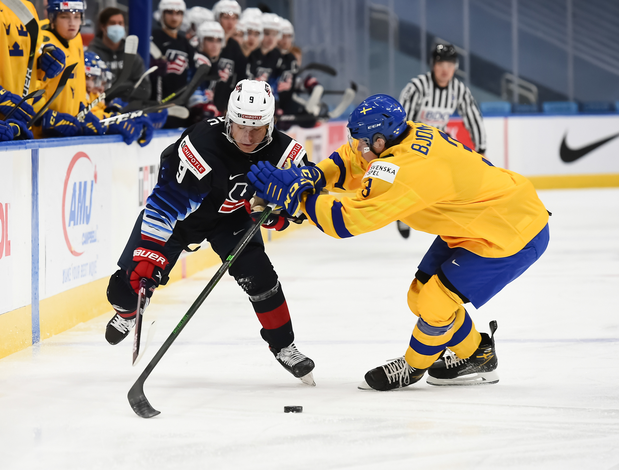 The Juniorkronorna had a nightmare start, surrendering two goals on the U.S.’s first five shots, and they couldn’t bounce back. The U.S. outshot Sweden 37-27.