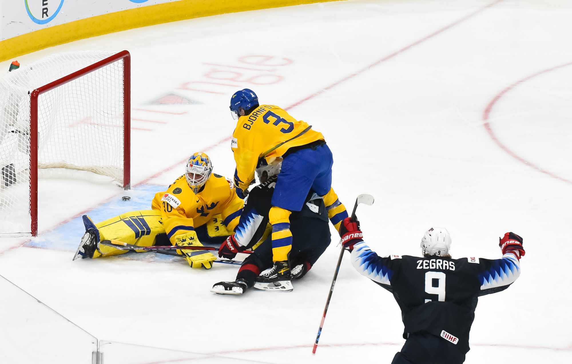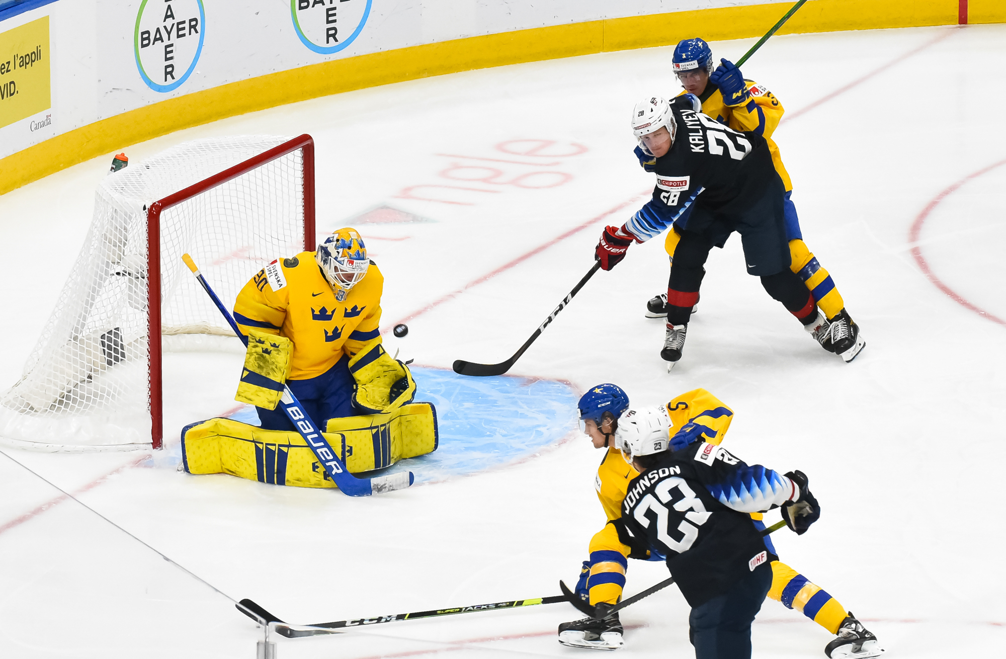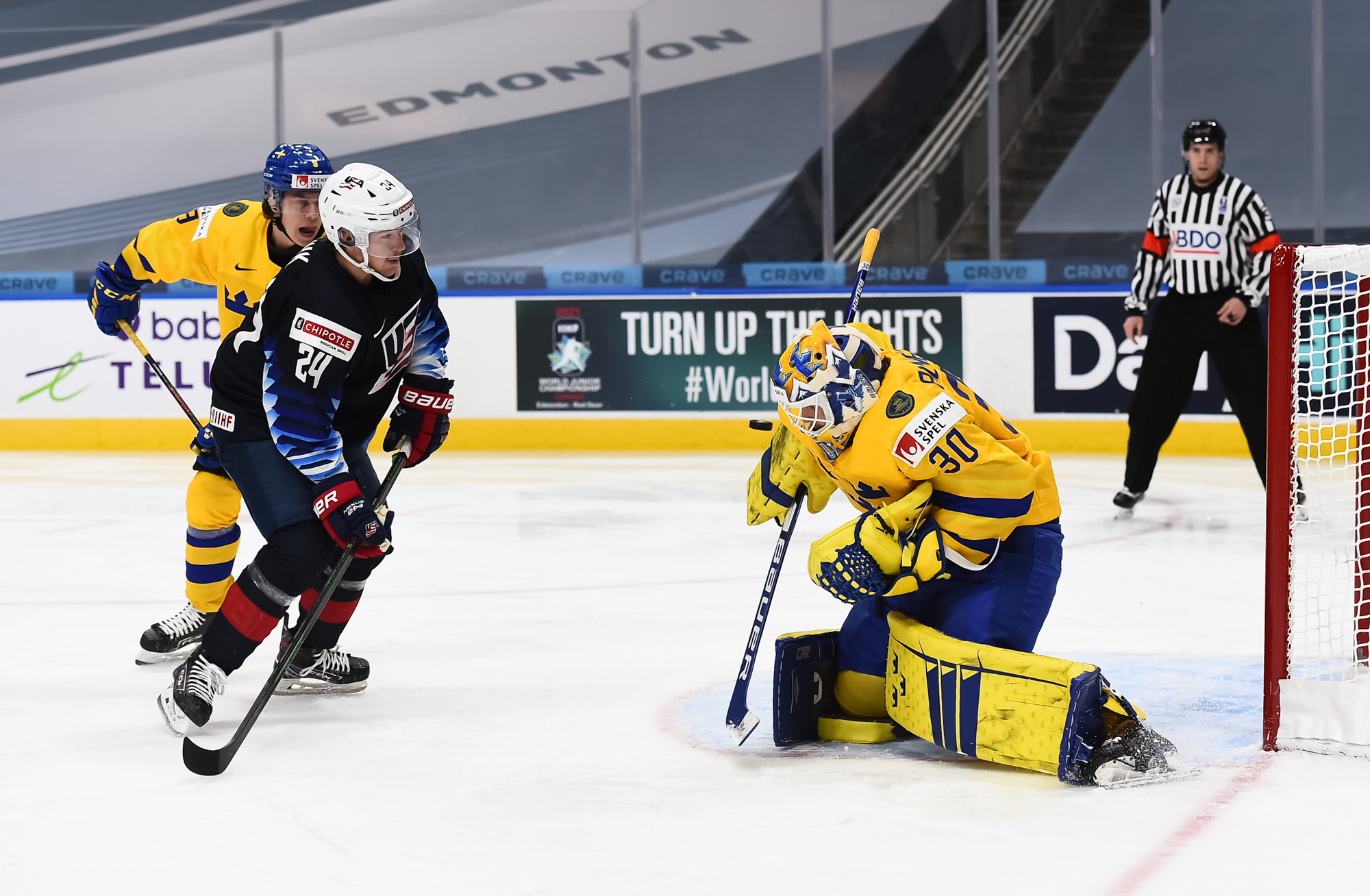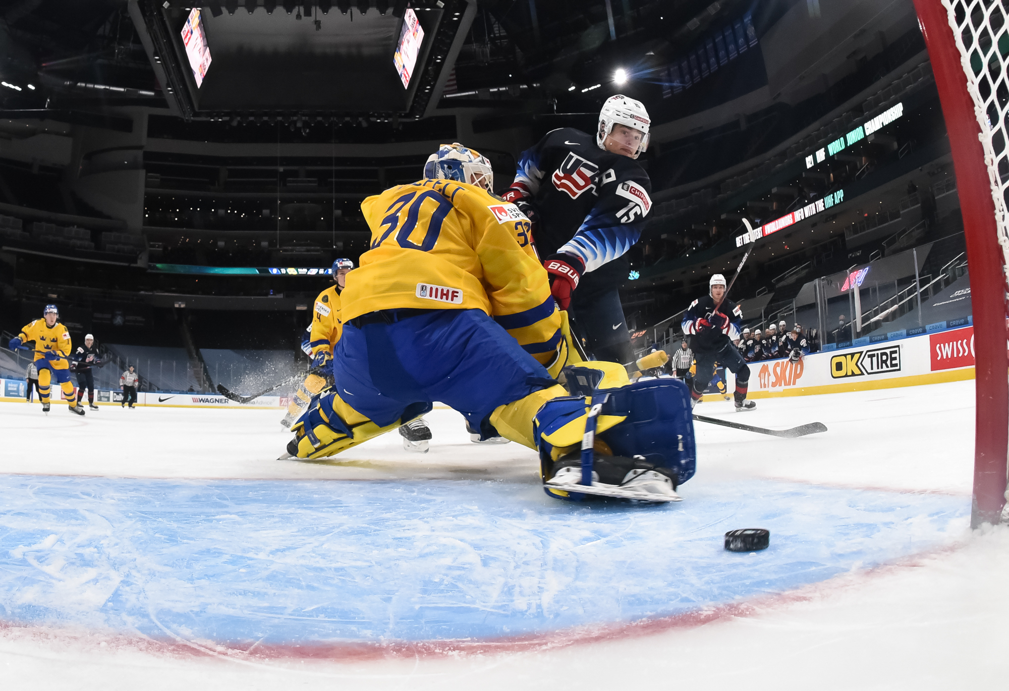 Knight was lucky as well as good. Near the 13-minute mark, Albin Sundsvik had a marvelous chance to convert a wraparound, but Knight, who had missed the initial U.S. shot, stuck out his right pad to foil the Swedish forward. On a power play late in the second, Elmer Soderblom had the goalie beaten, but rang it off the post.