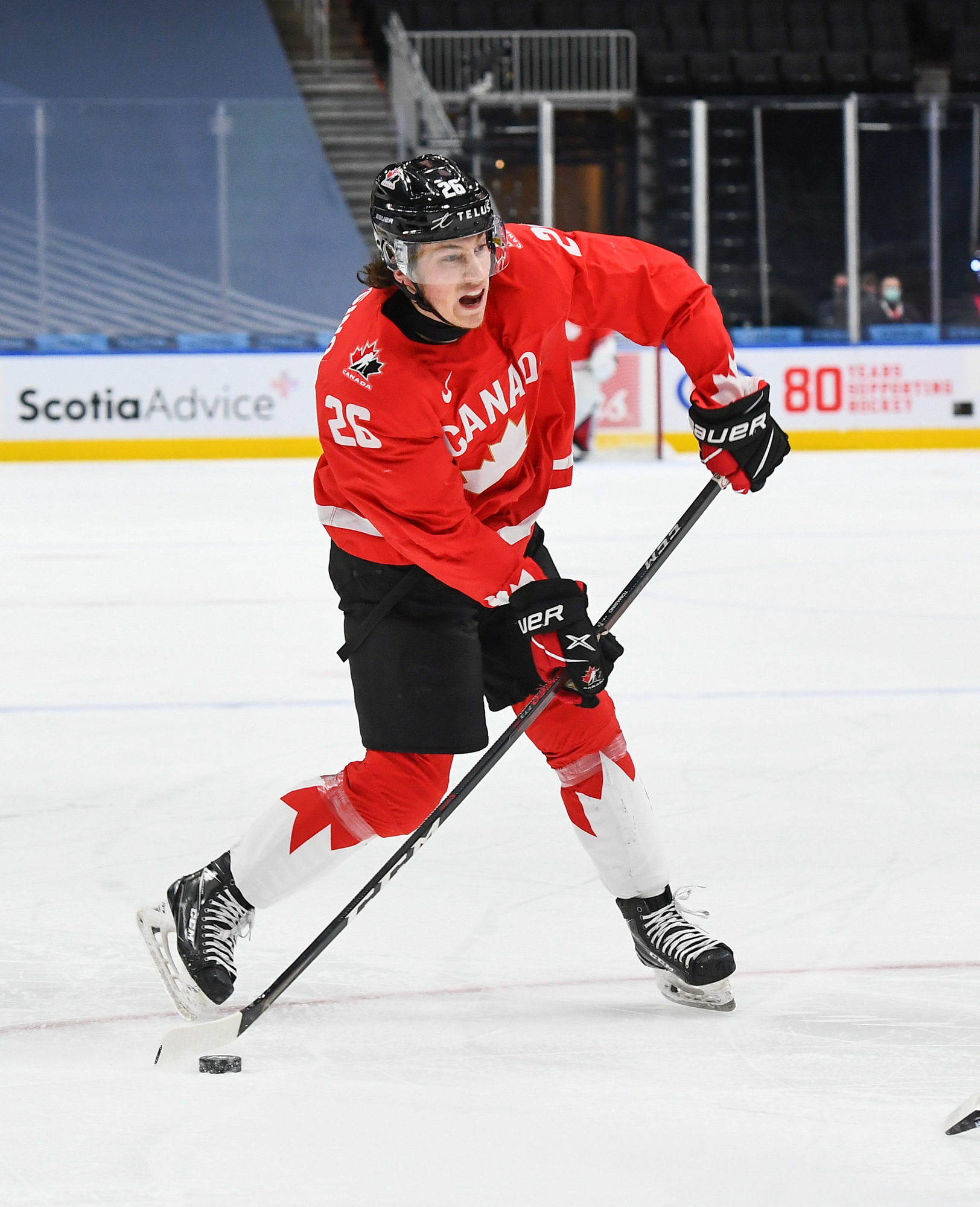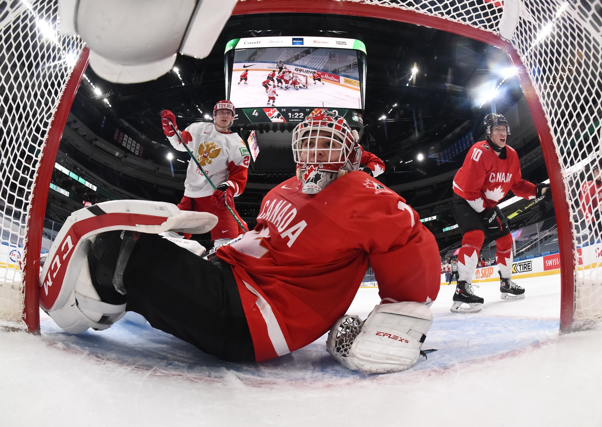 Canada’s sensational period continued with a third goal, this from Cole Perfetti during a four-minute power play. He came off the point and from the top of the circle wired a shot under the glove of Askarov to the far side at 15:05, and the Russians left the ice after 20 minutes in a state of shock.