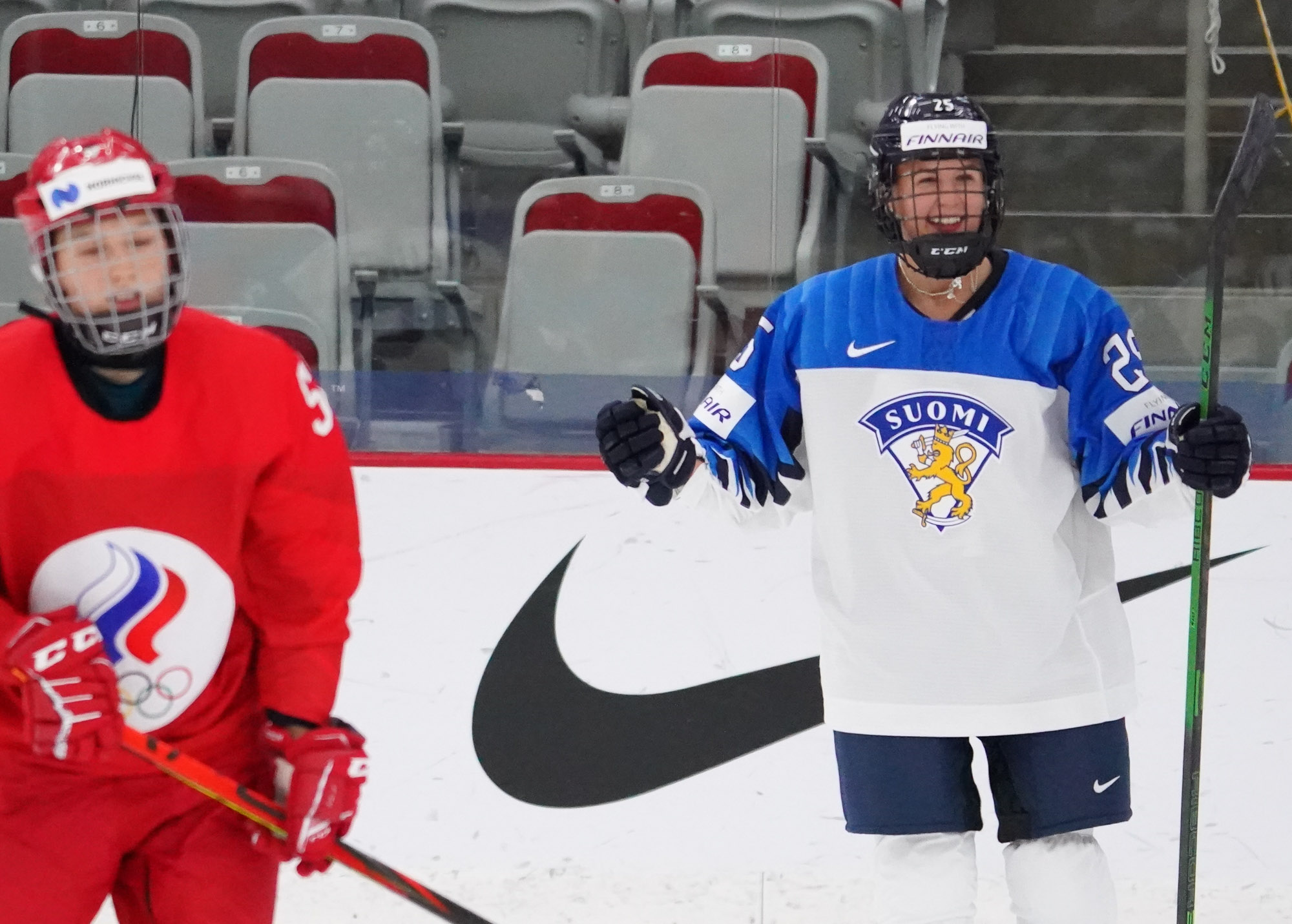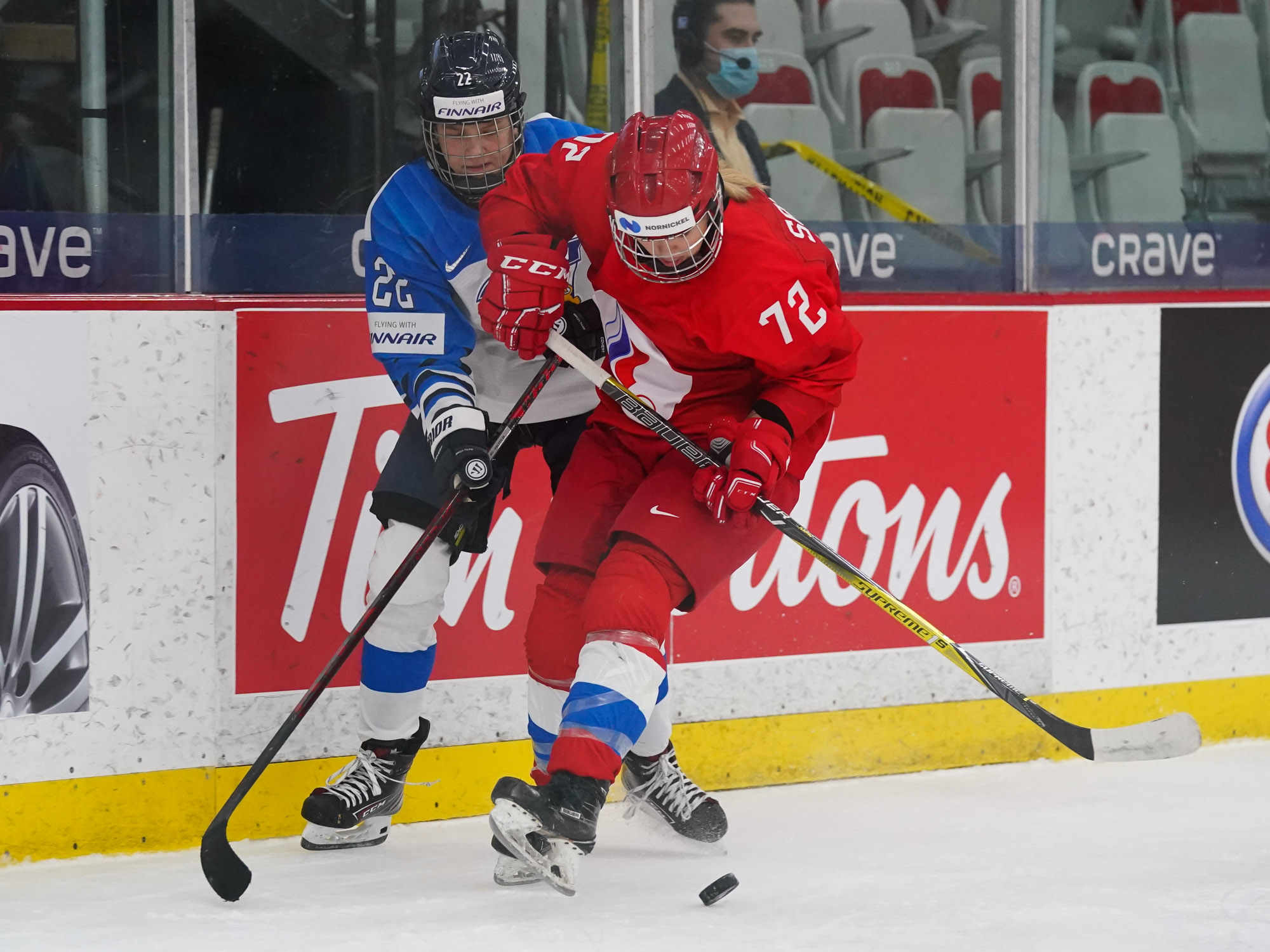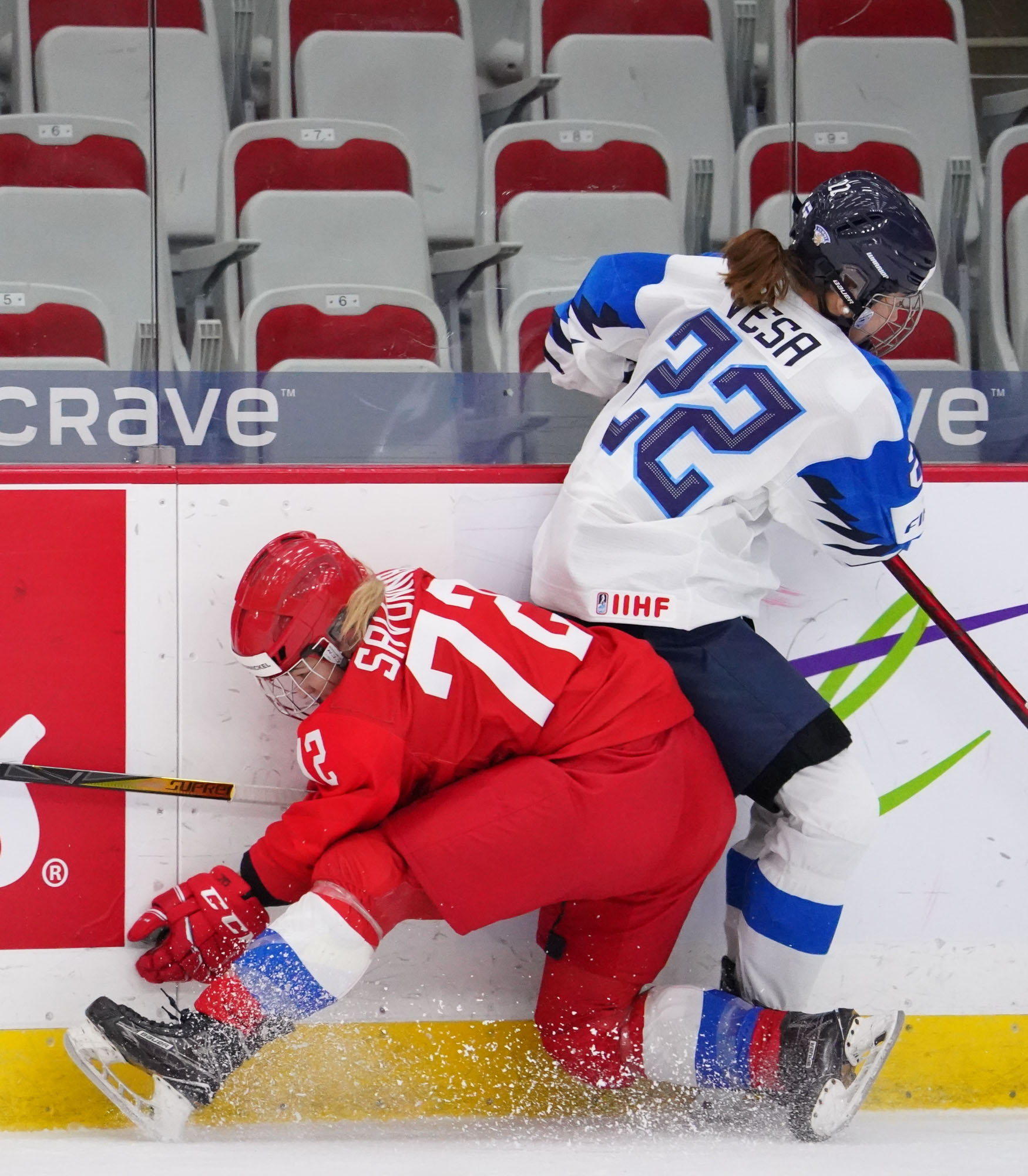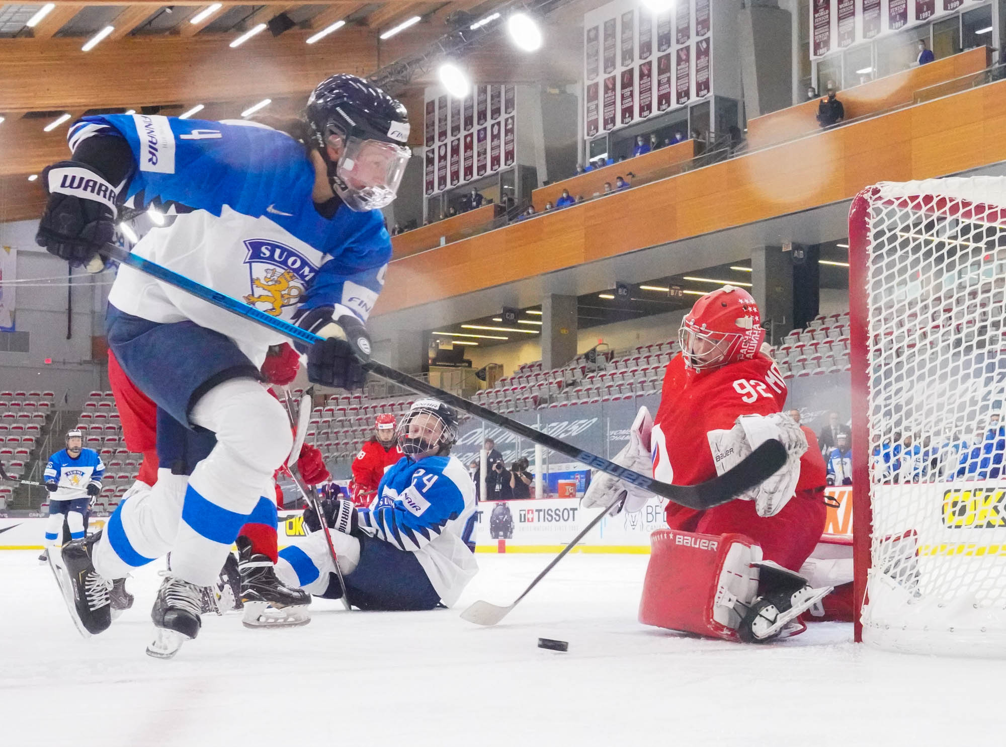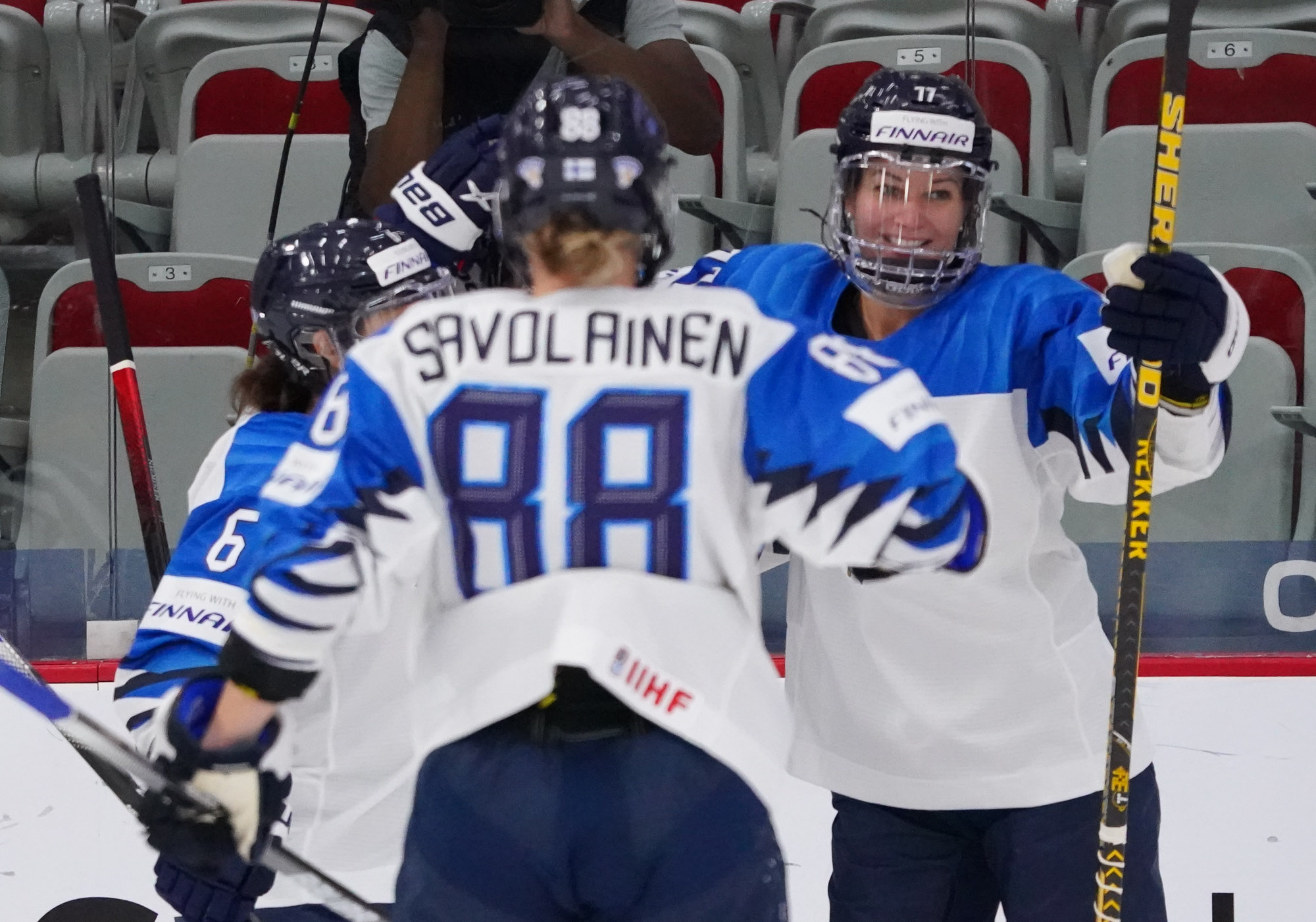 Four and a half minutes later, the Finns made it 2-0 when Karvinen’s long shot went in and out of the glove of goalie Valeria Merkusheva. Petra Nieminen was there to swat the rebound in at 12:33.