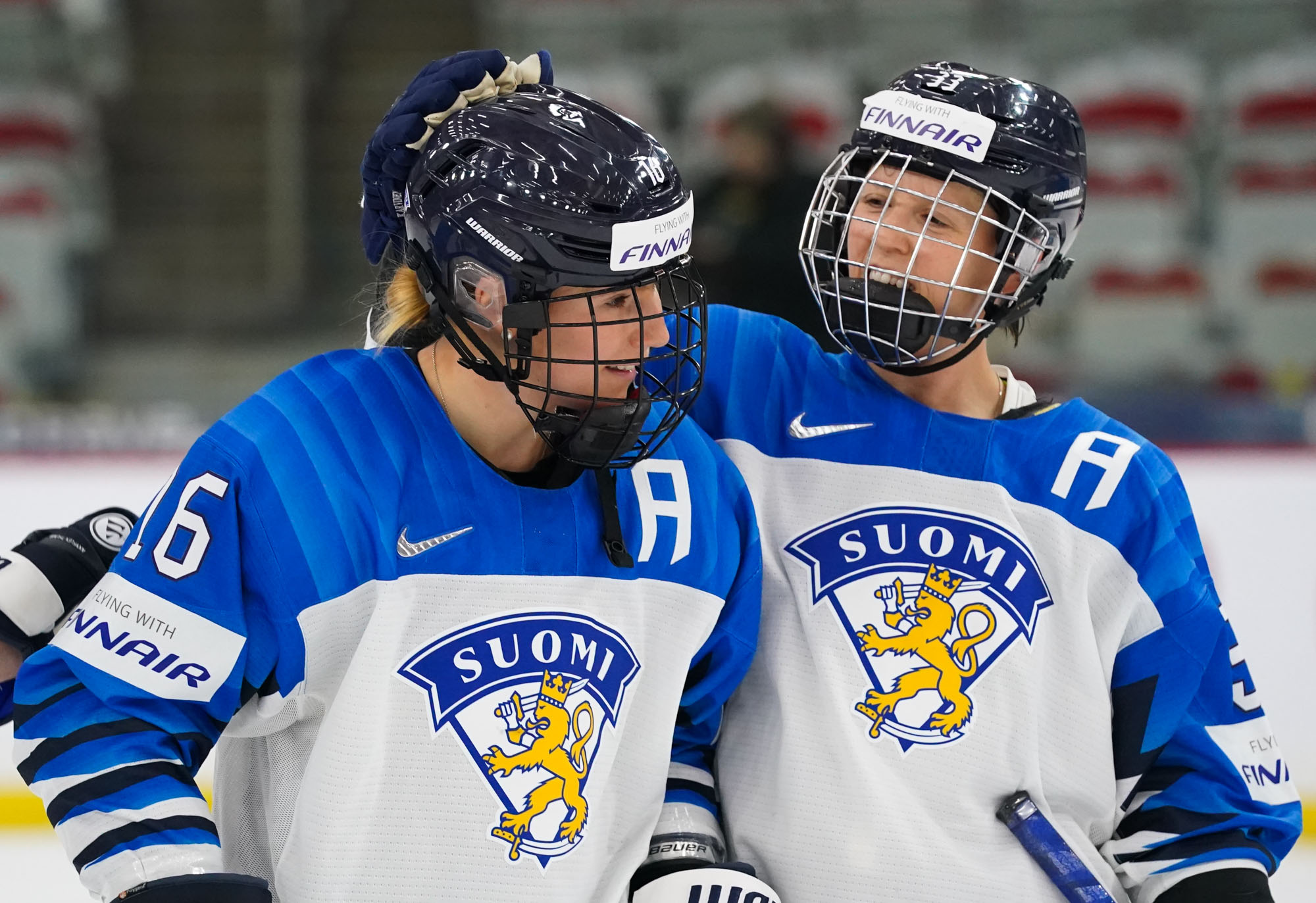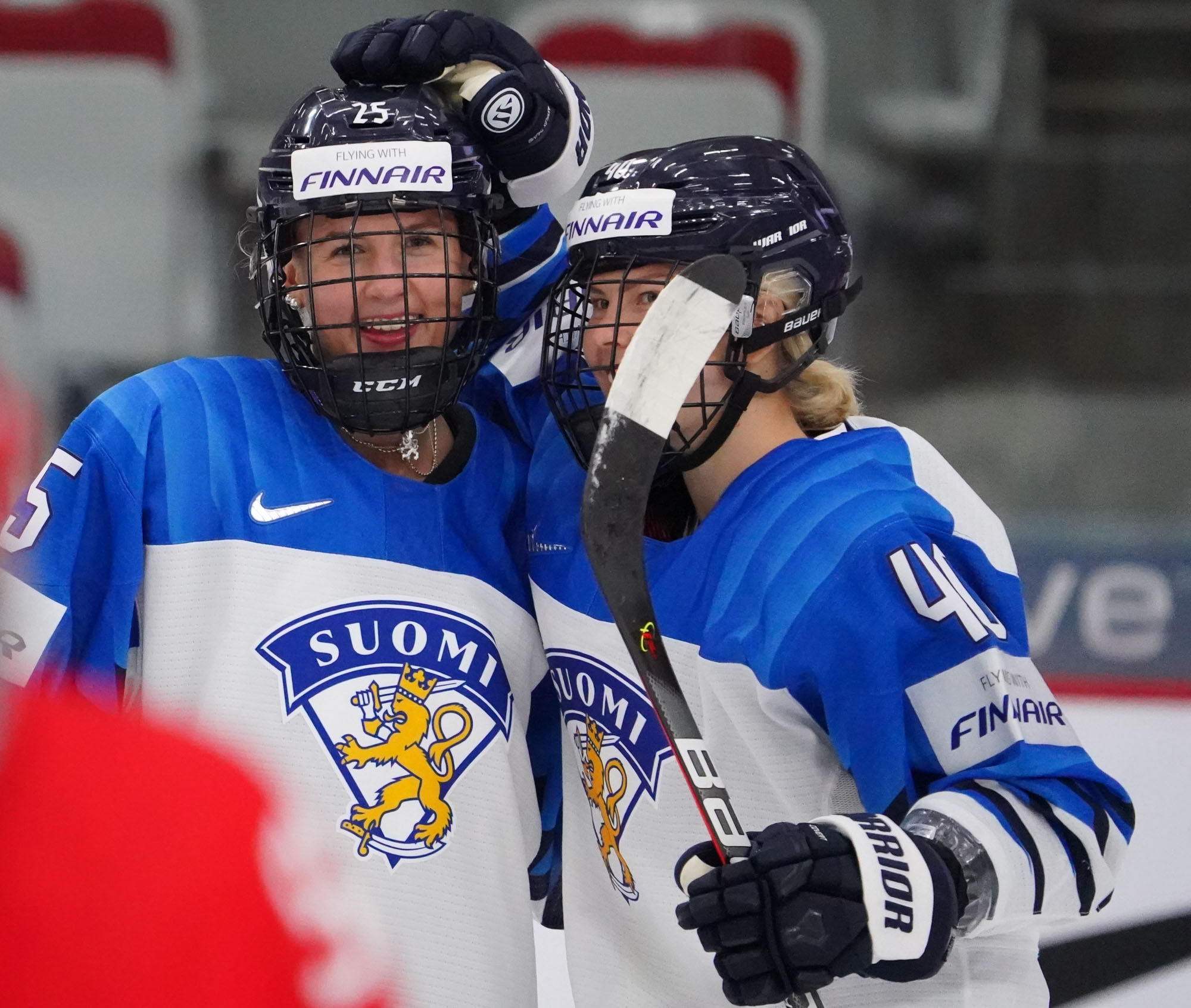 Finland's Jenniina Nylund #25 celebrates her first-period goal with Noora Tulus #40.