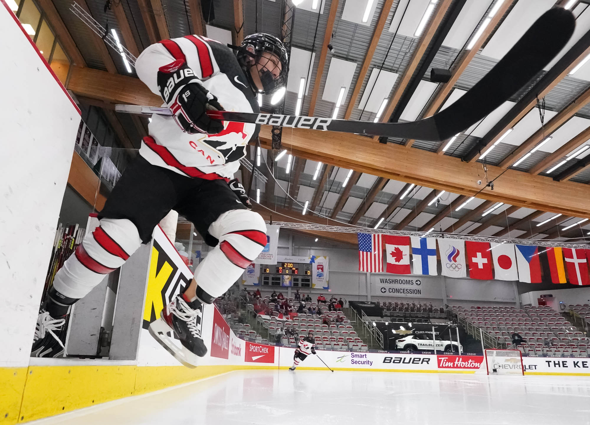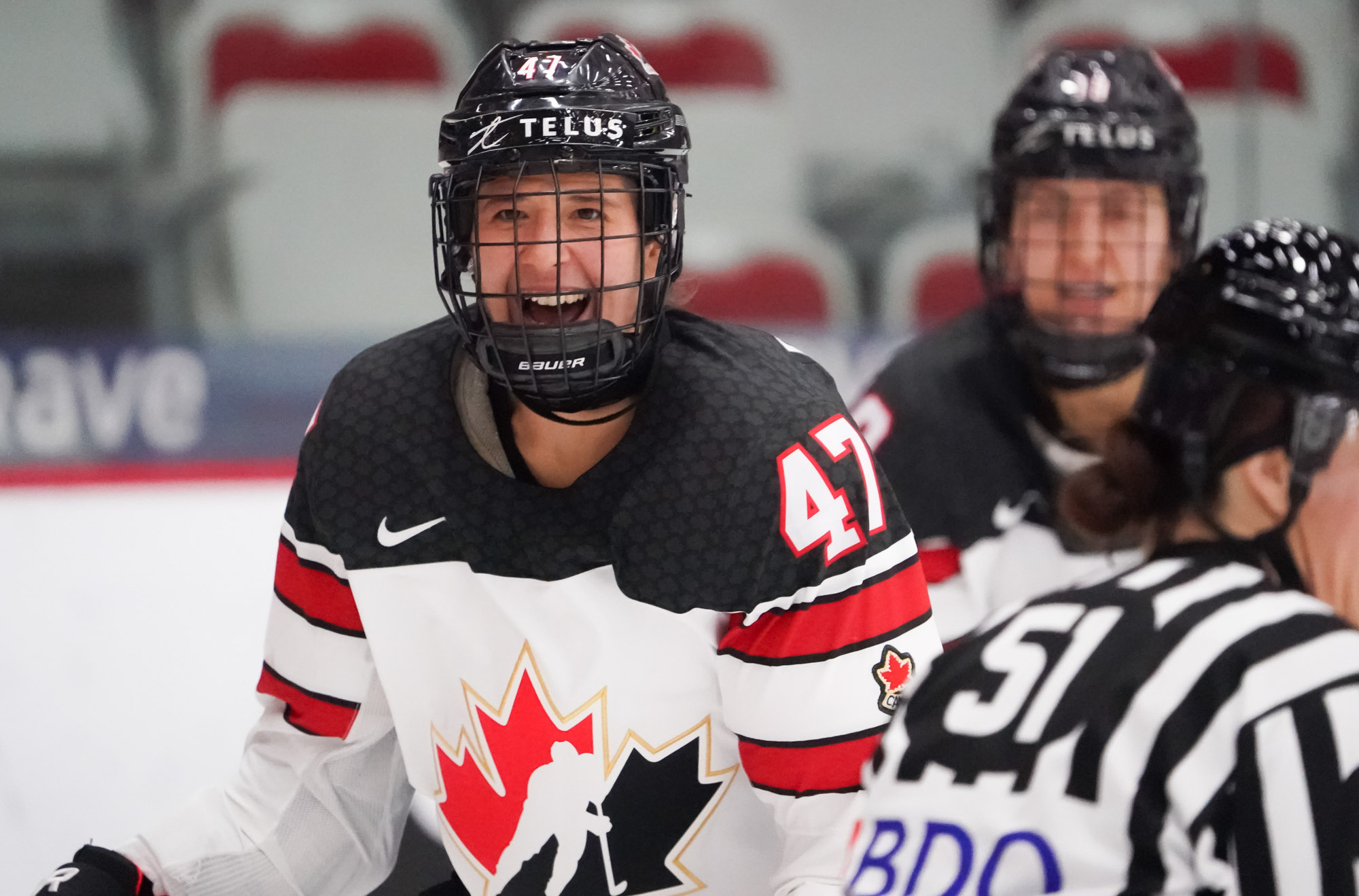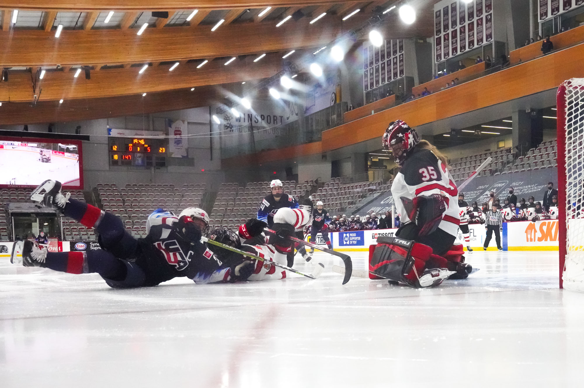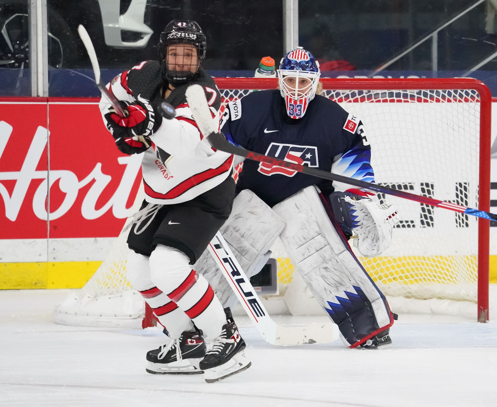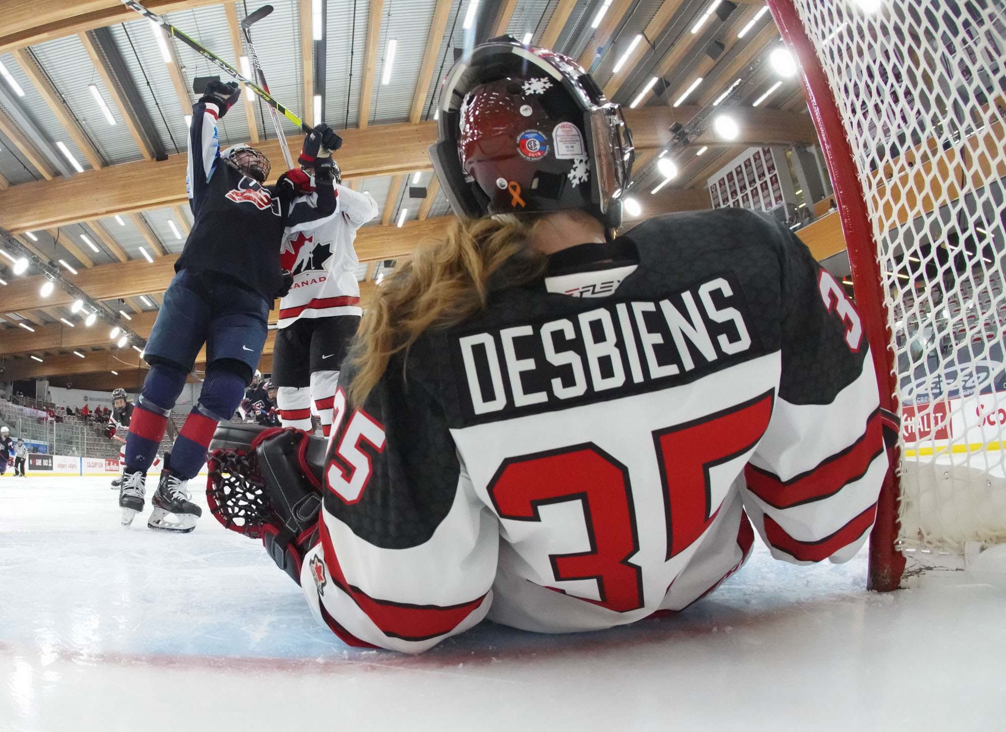 The Americans didn’t record their first shot on goal until 12 1/2 minutes into the game, and Canada continued their relentless puck pursuit. They were rewarded again at 13:50 when a mad scramble in front saw Renata Fast get her stick on the puck, which bounced crazily over the goal line to give Canada a well-deserved 2-0 lead.