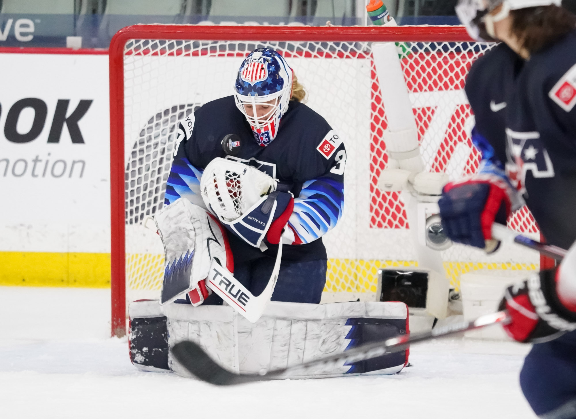 The U.S. had a great chance early in the second when Canadian goalie Ann-Renee Desbiens misplayed the puck behind her goal. Brianna Decker got to it and tried to stuff it in, but the goalie dove back and got her paddle on the puck to knock it away.