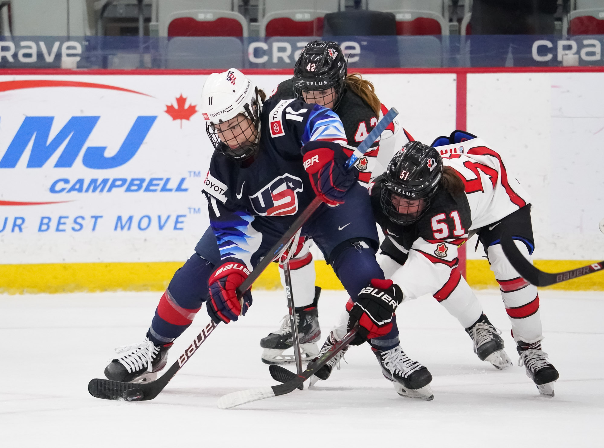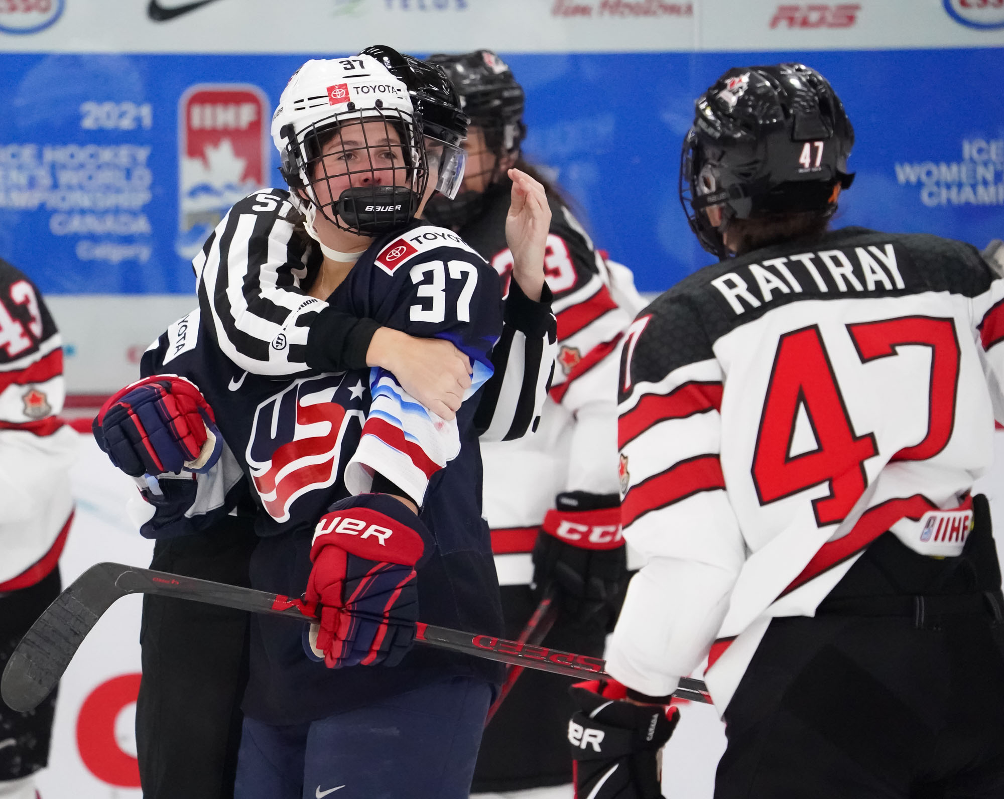 Canada scored early and often and defeated the United States emphatically, 5-1, to claim first place in Group A. They did it without their captain, Marie-Philip Poulin, but Jamie Lee Rattray stepped up and contributed two goals in the win.