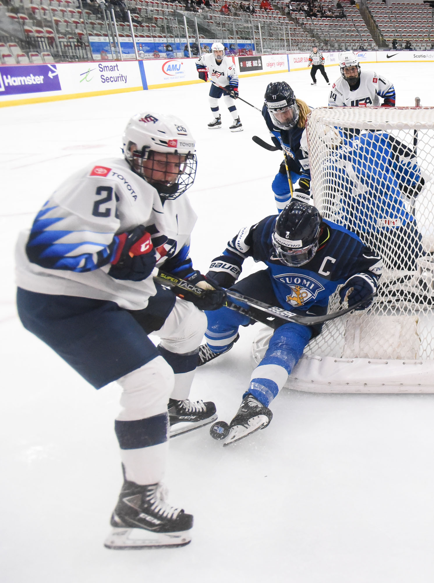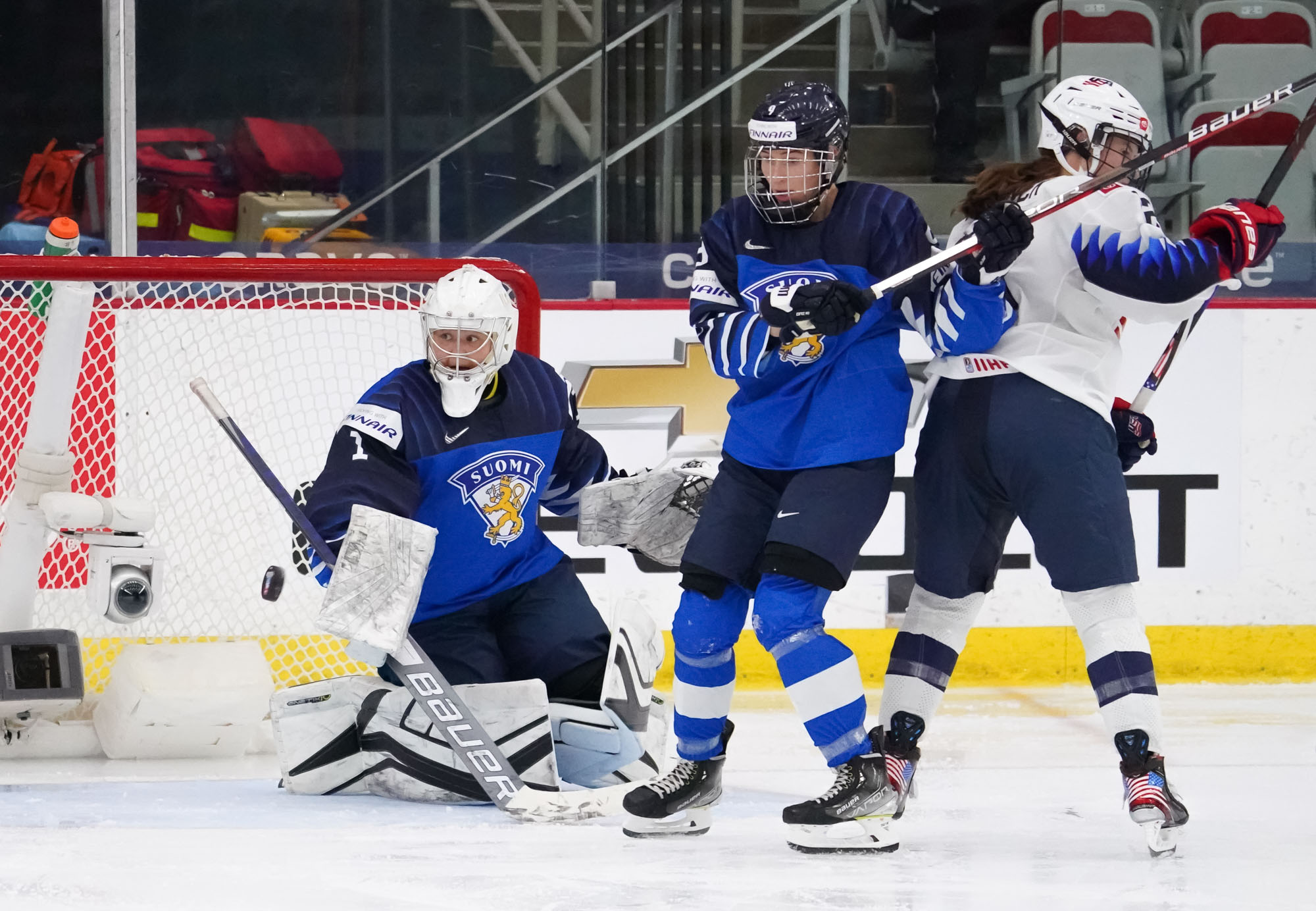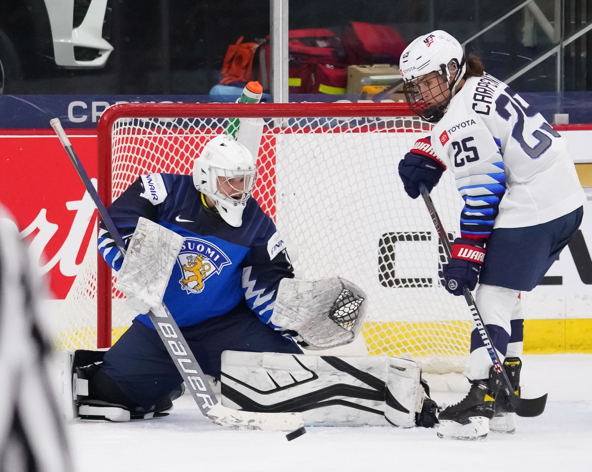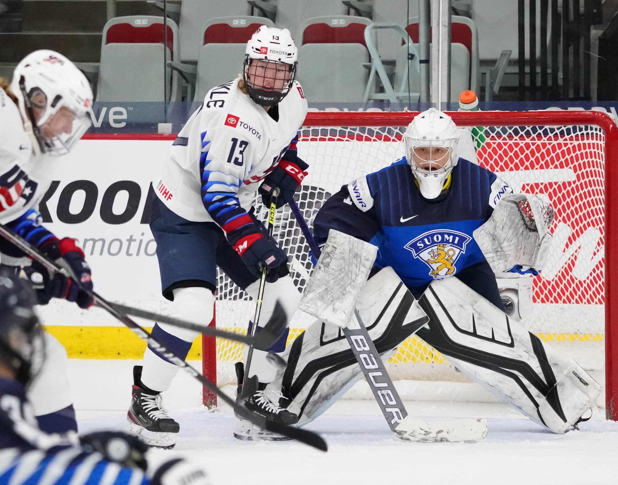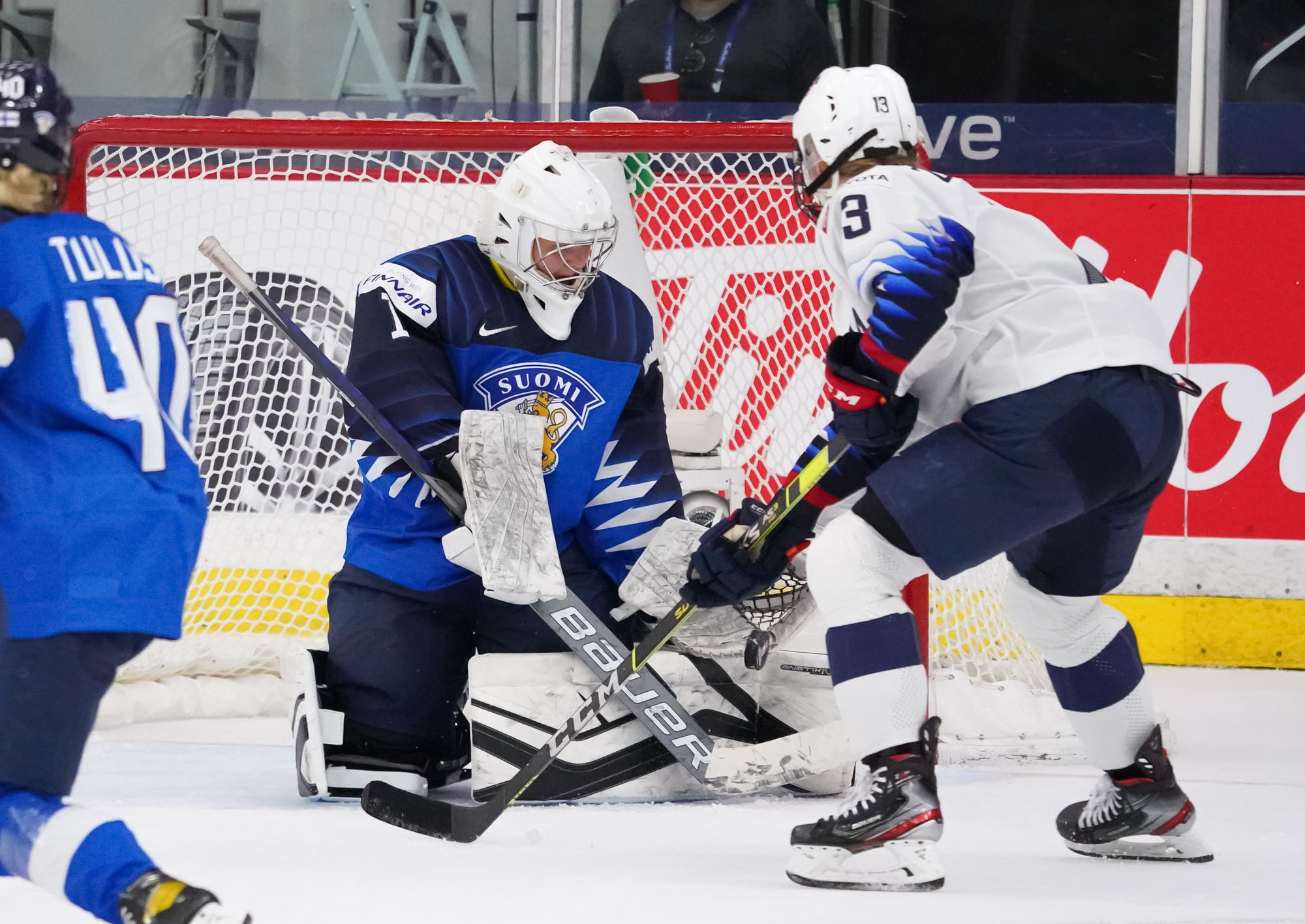 Keisala stayed strong early in the third, foiling Scamurra on a rush and Carpenter from the slot. The Finns nearly got on the board when Tapani dipsy-doodled into the U.S. zone and sent a slick pass to Elisa Holopainen in tight. Keller drew a penalty on the play and Mustonen called his timeout to strategize. It was to no avail.