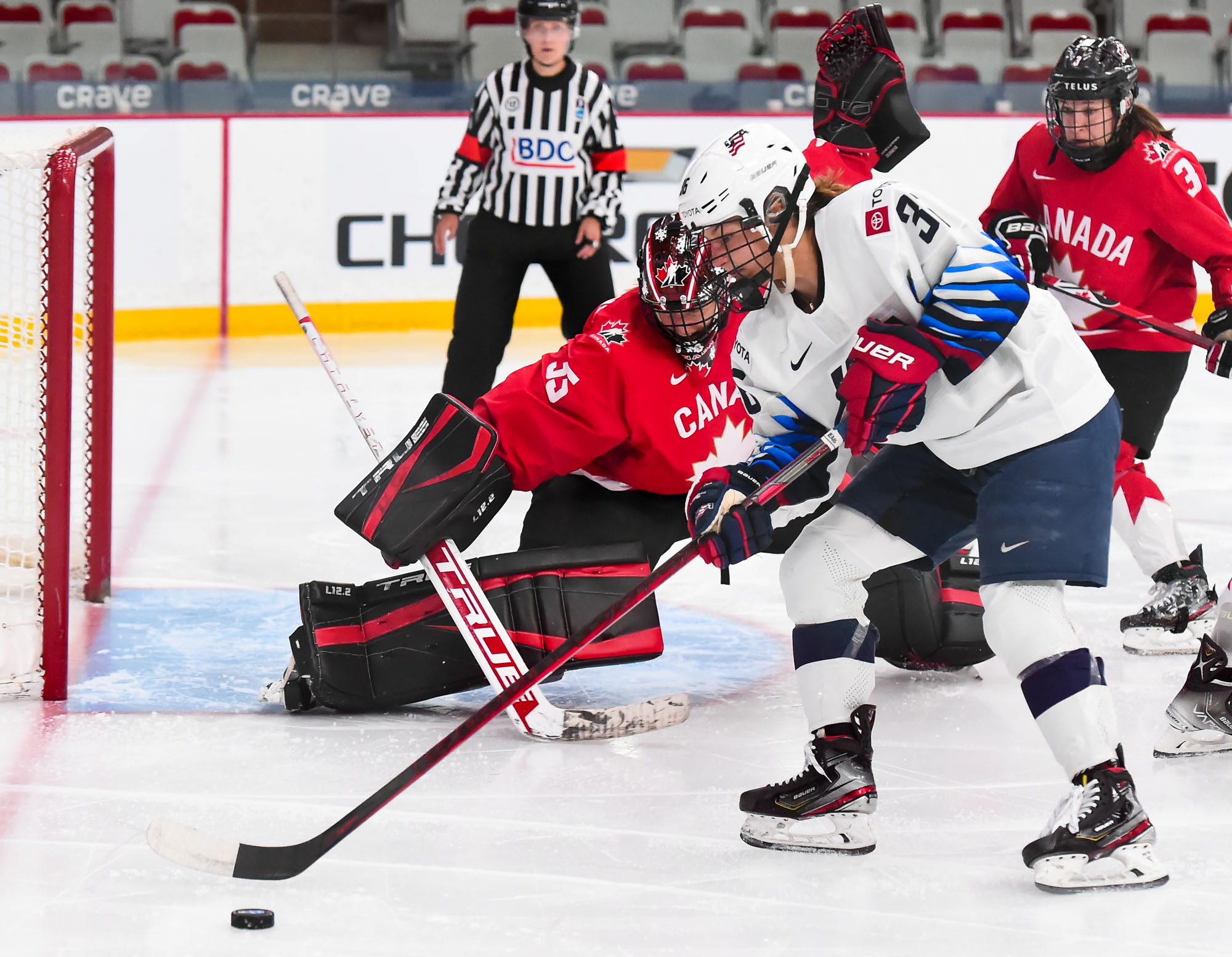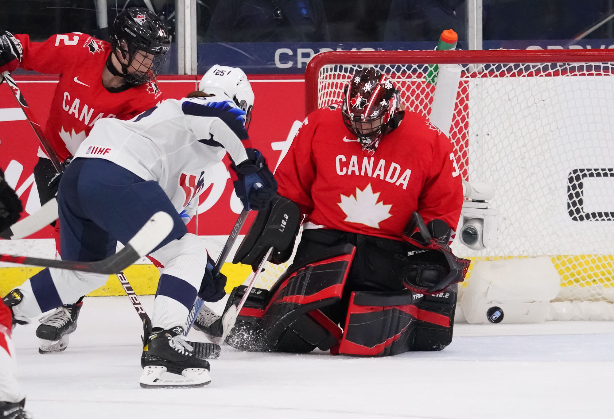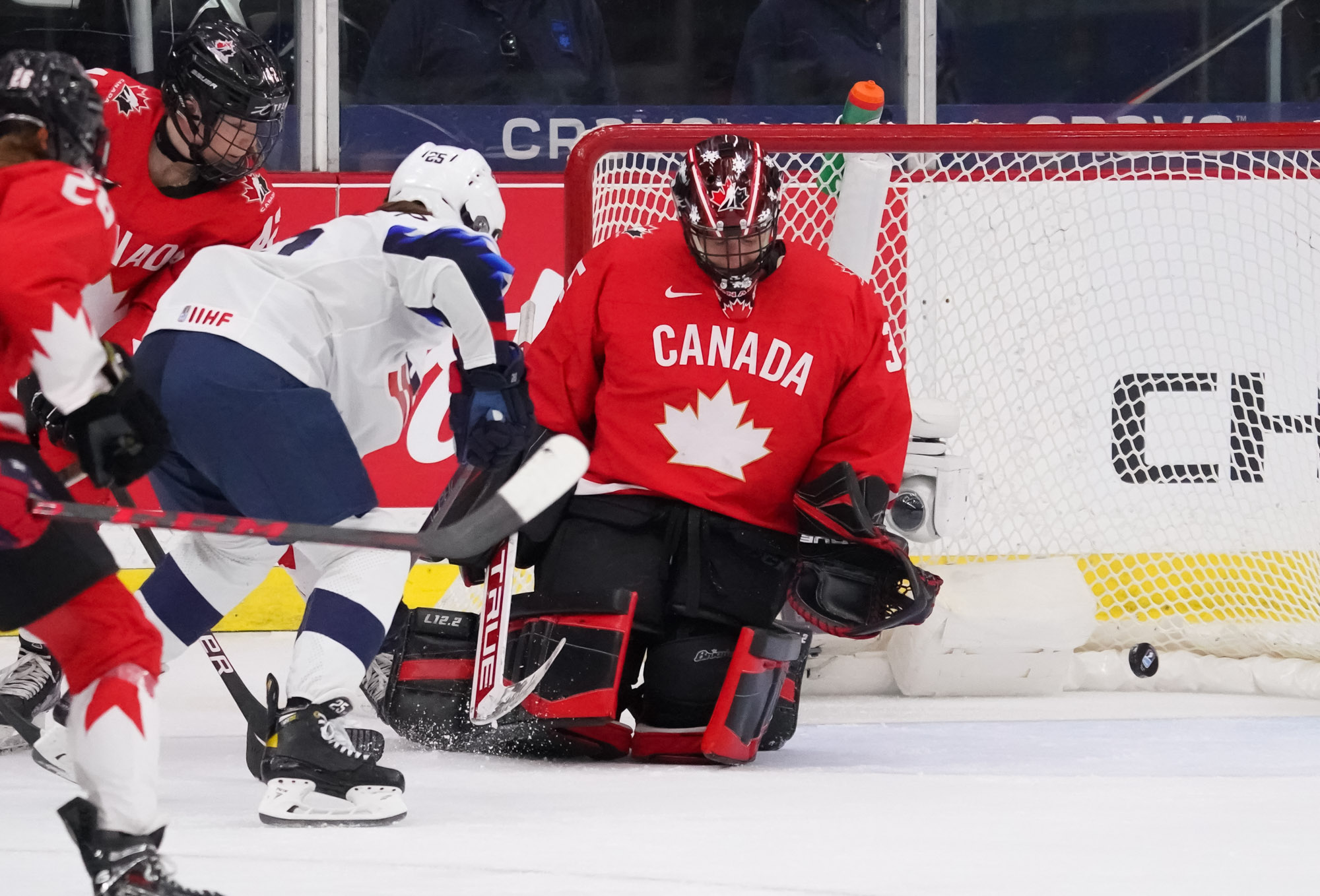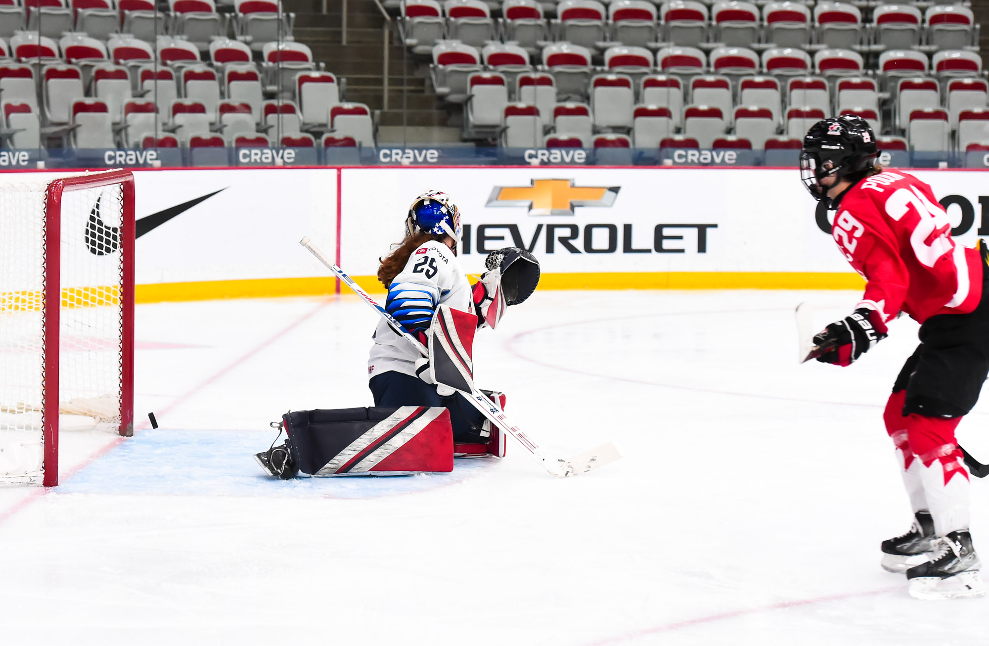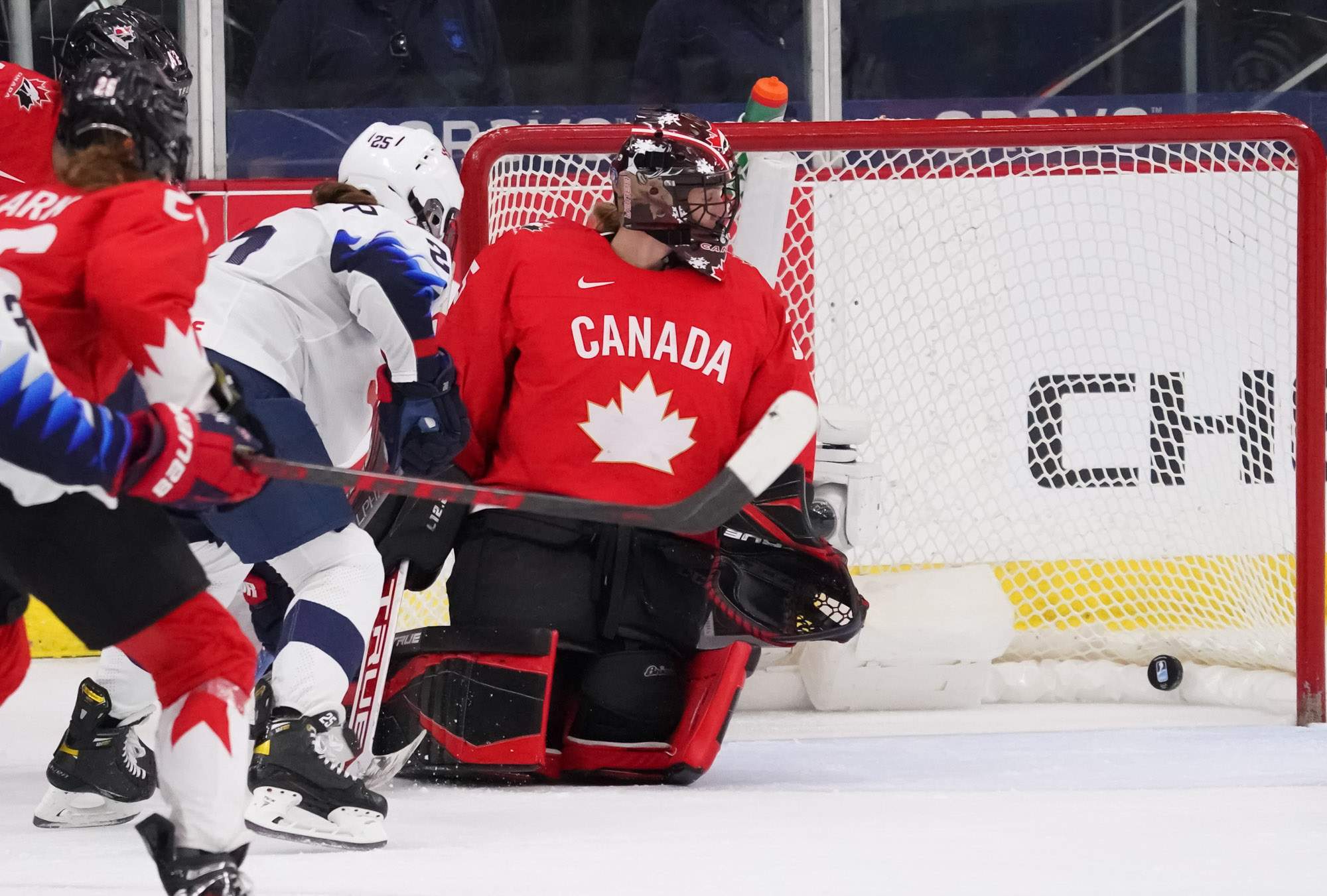 Not to be outdone, Desbiens then came to Canada's rescue. She stopped Hayley Scamurra, who blew by her cover and got a great shot on goal, only to be foiled by the goalie. Moments later, Abbey Murphy had a chance in close but Desbiens held her ground.