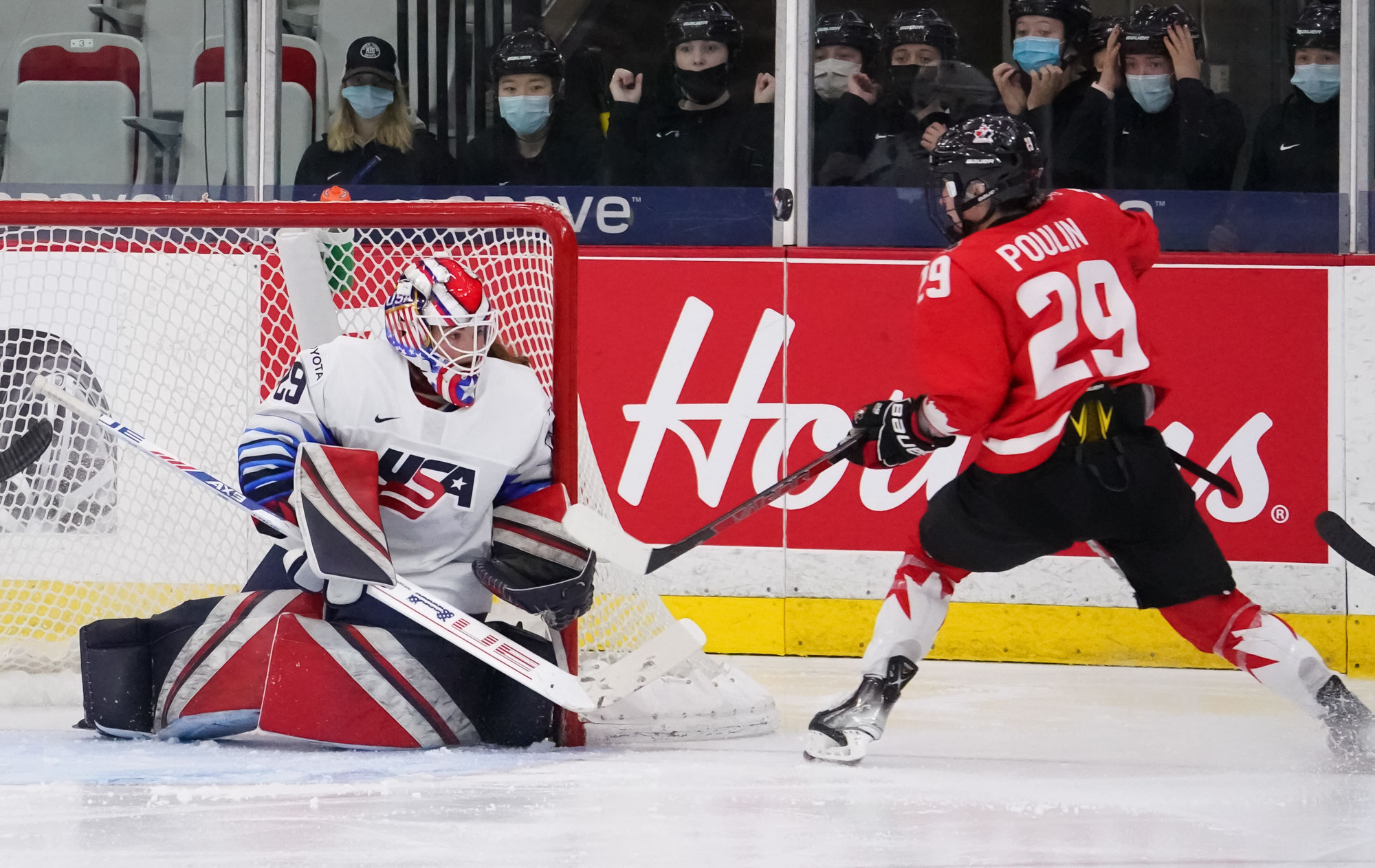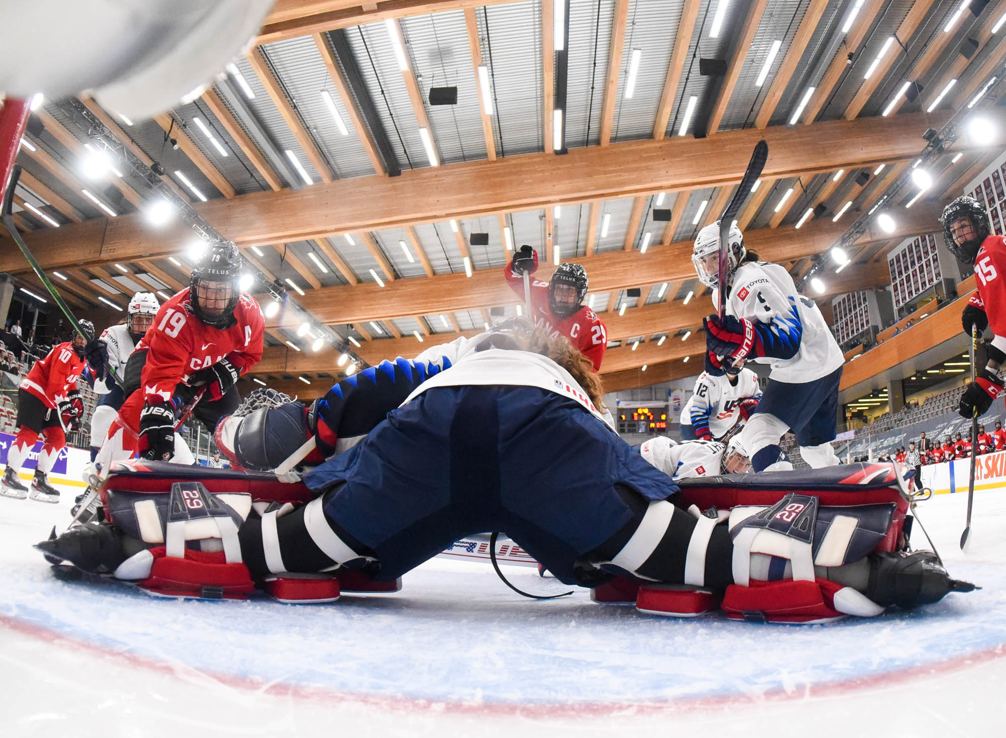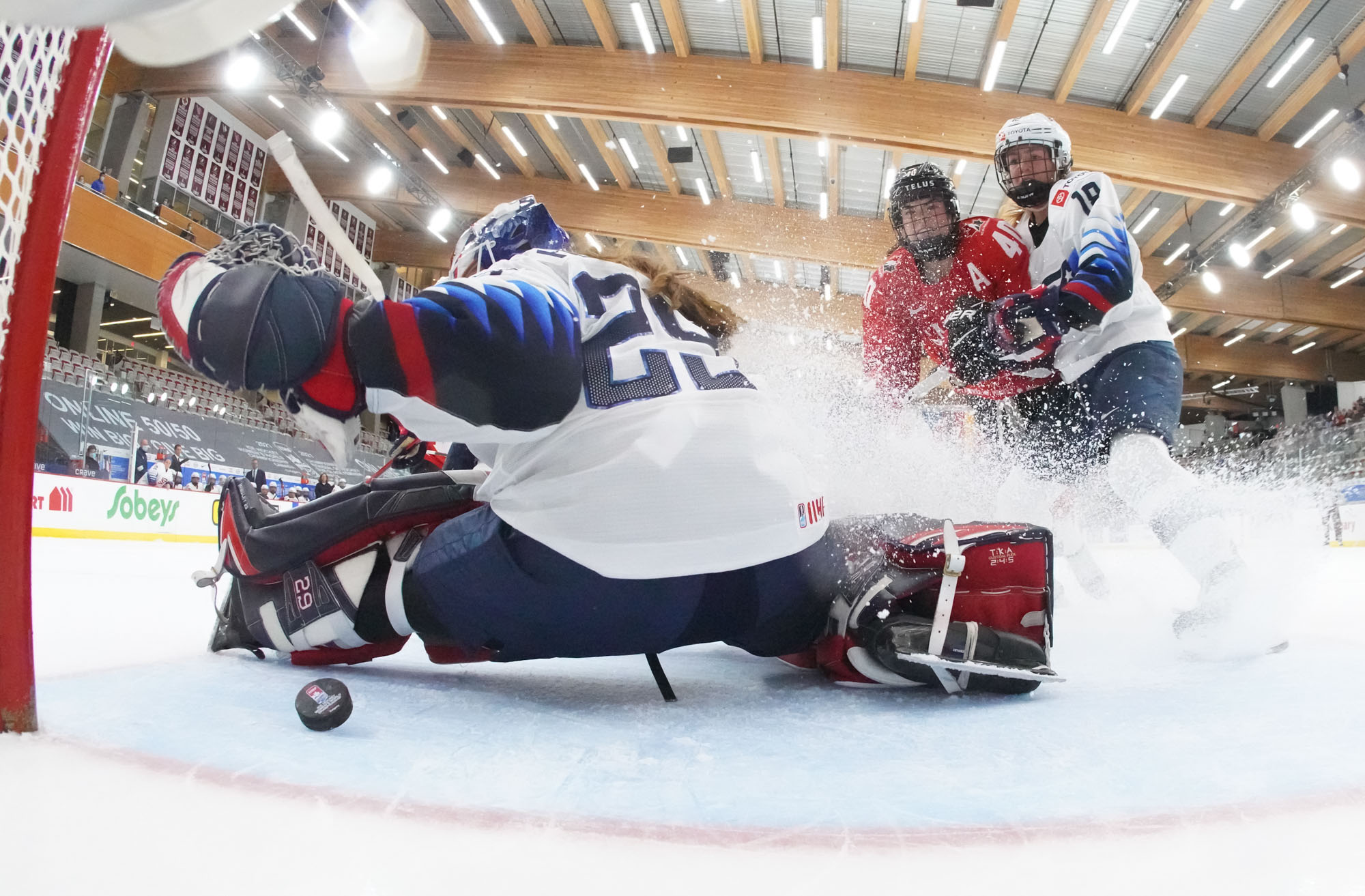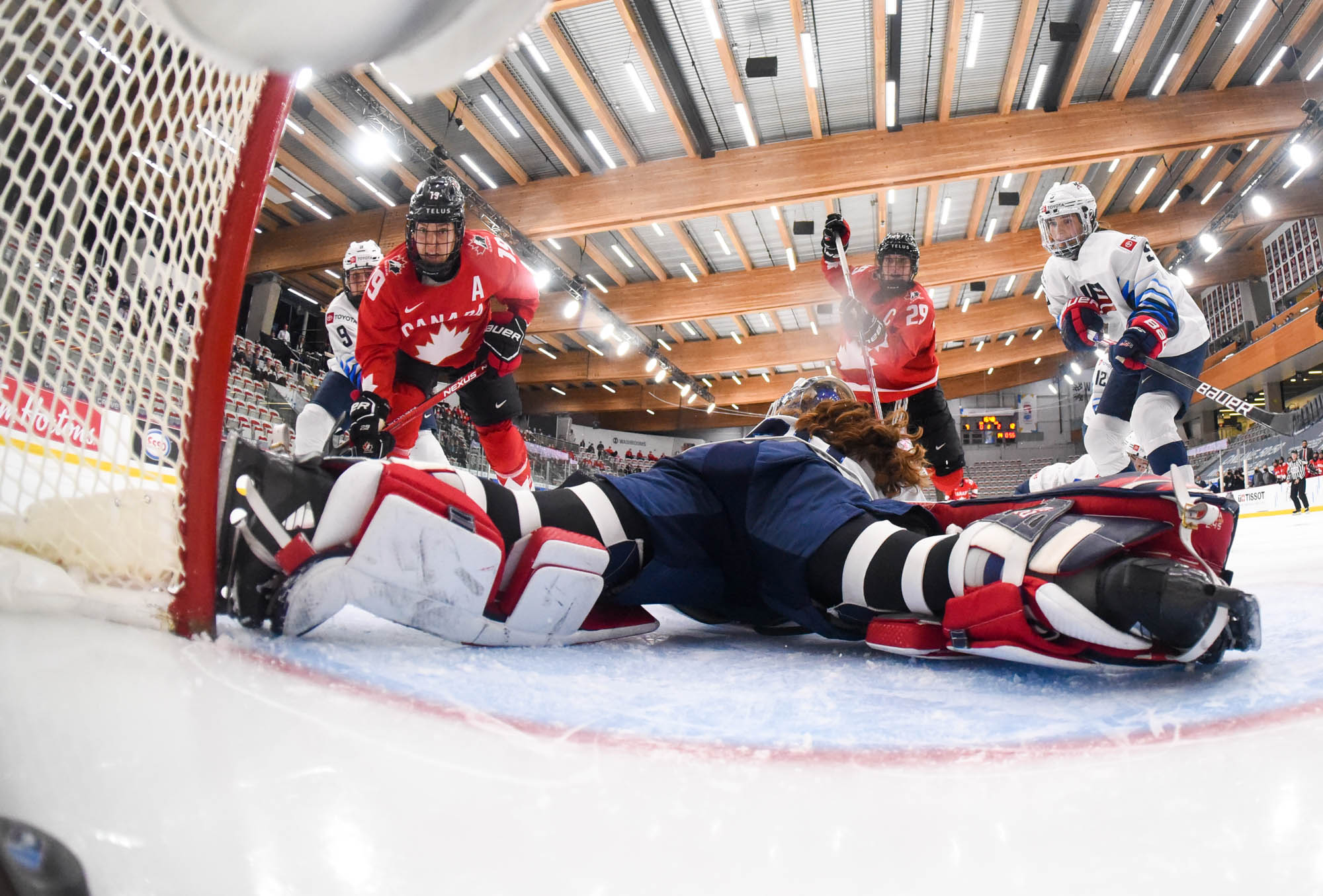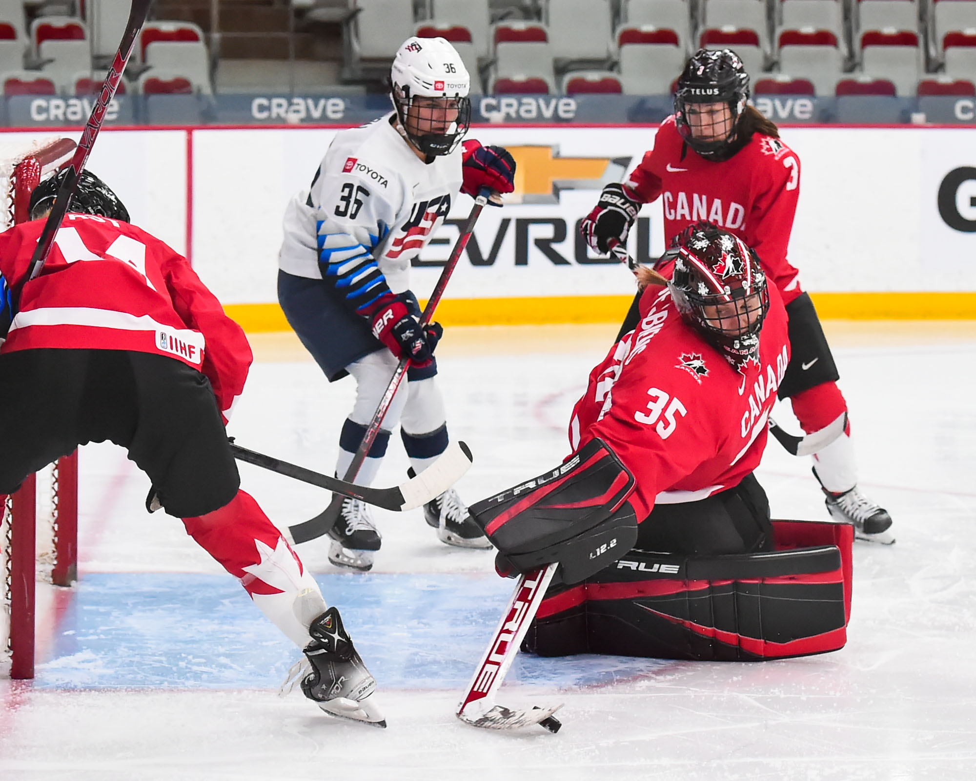 Not to be outdone, Desbiens then came to Canada's rescue. She stopped Hayley Scamurra, who blew by her cover and got a great shot on goal, only to be foiled by the goalie. Moments later, Abbey Murphy had a chance in close but Desbiens held her ground.