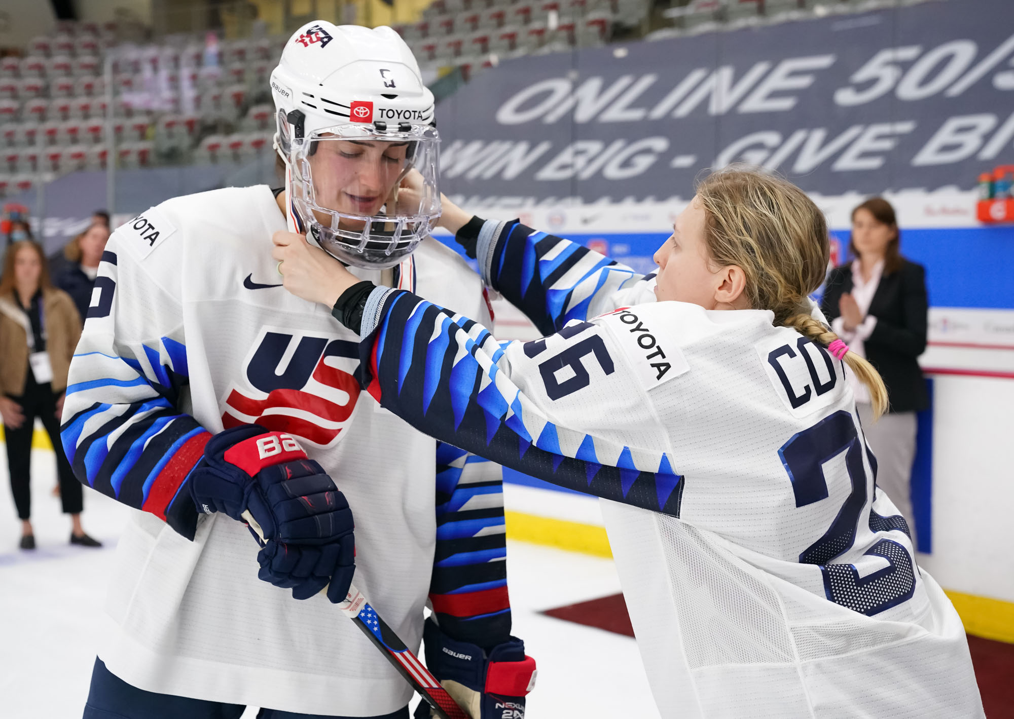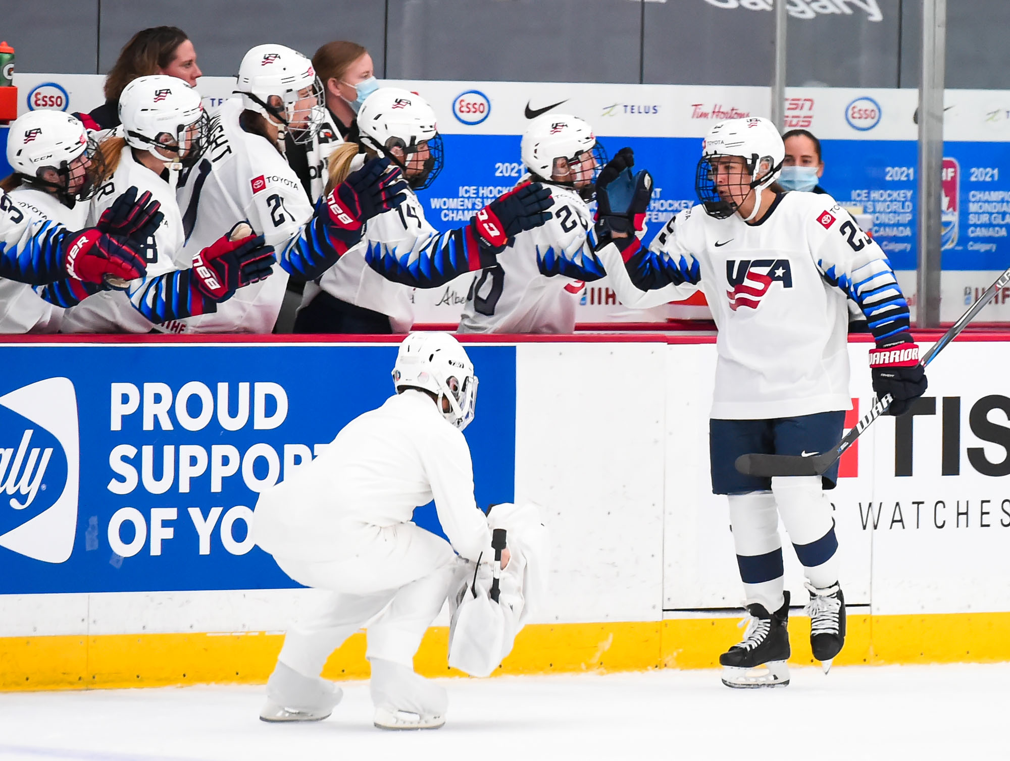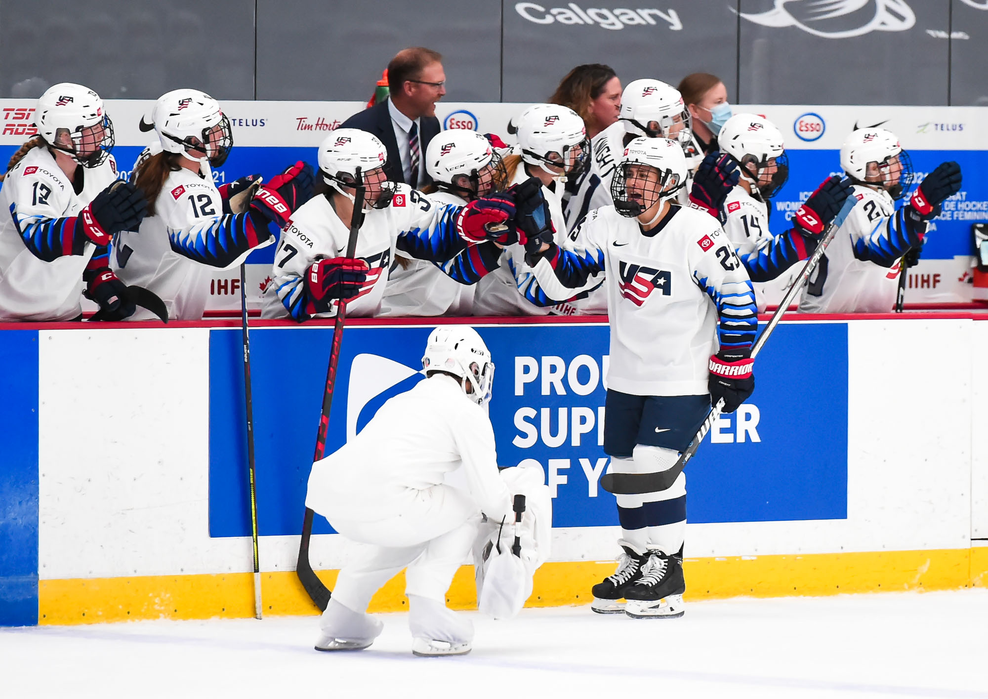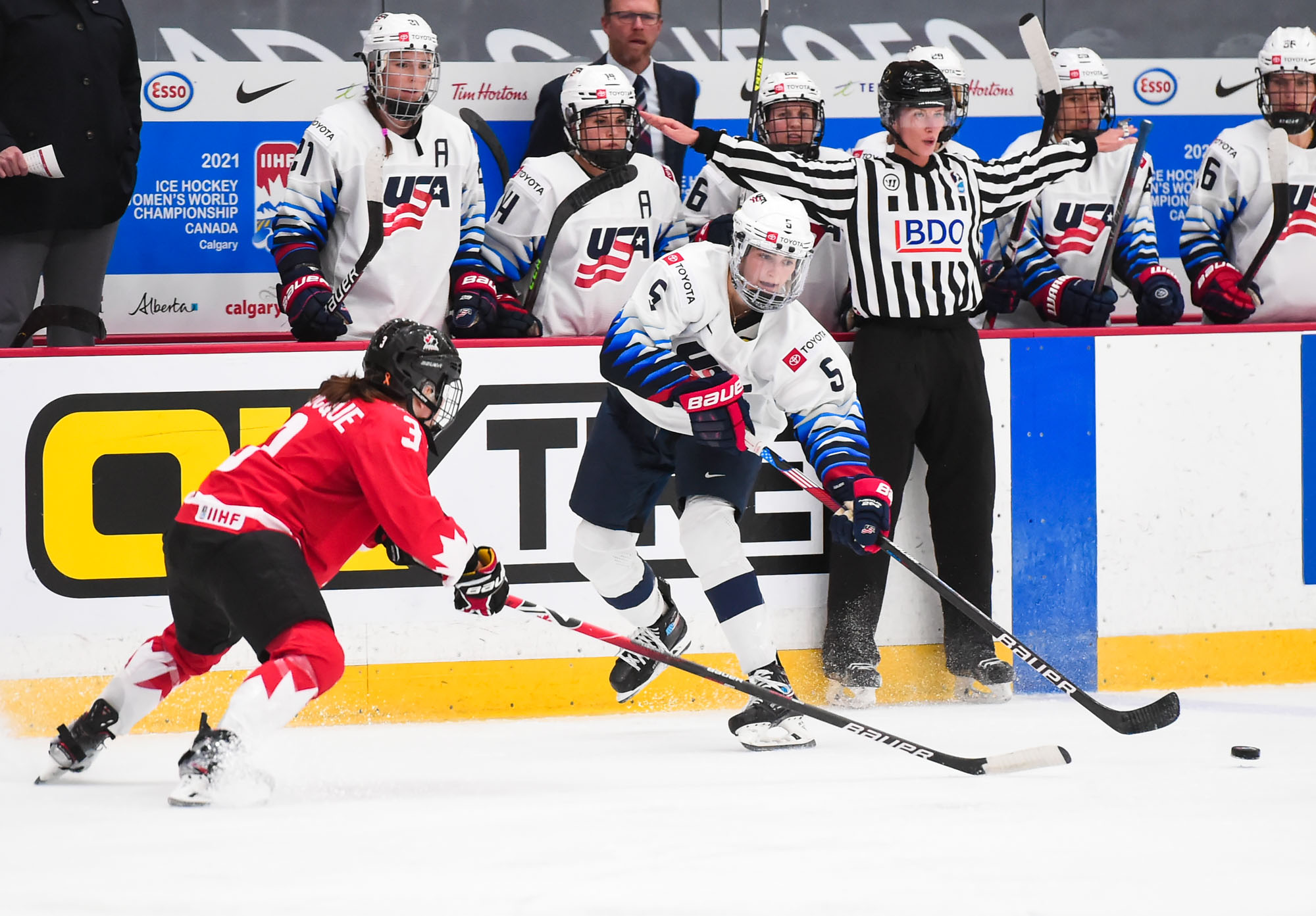 The goal, at 9:55, marked the first time Canada had trailed since the opening period of the tournament, against Finland. Soon after, Canada took a penalty and the Americans struck again. This time Lee Stecklein took a point shot, and there was Carpenter once again to whack the puck in.