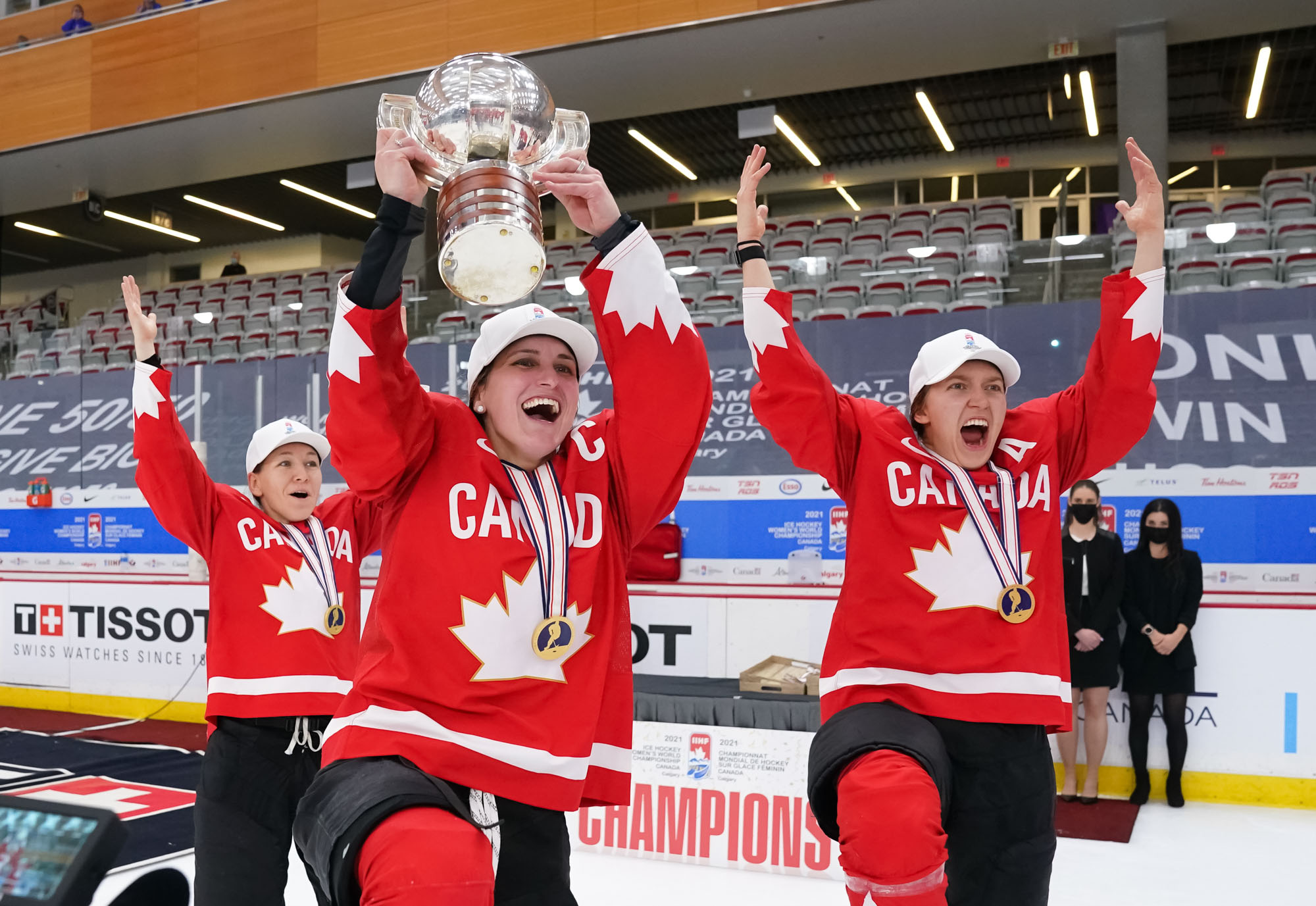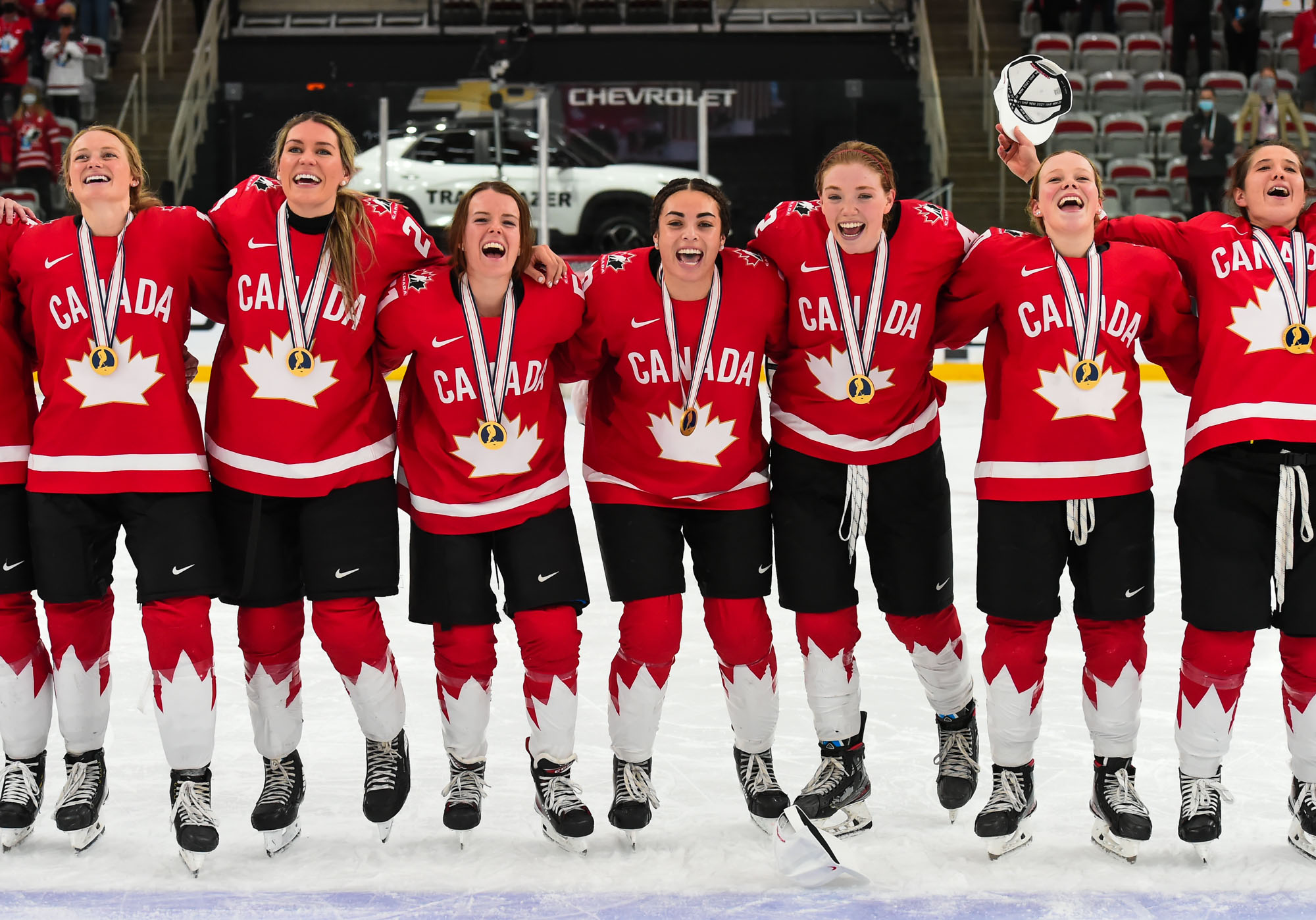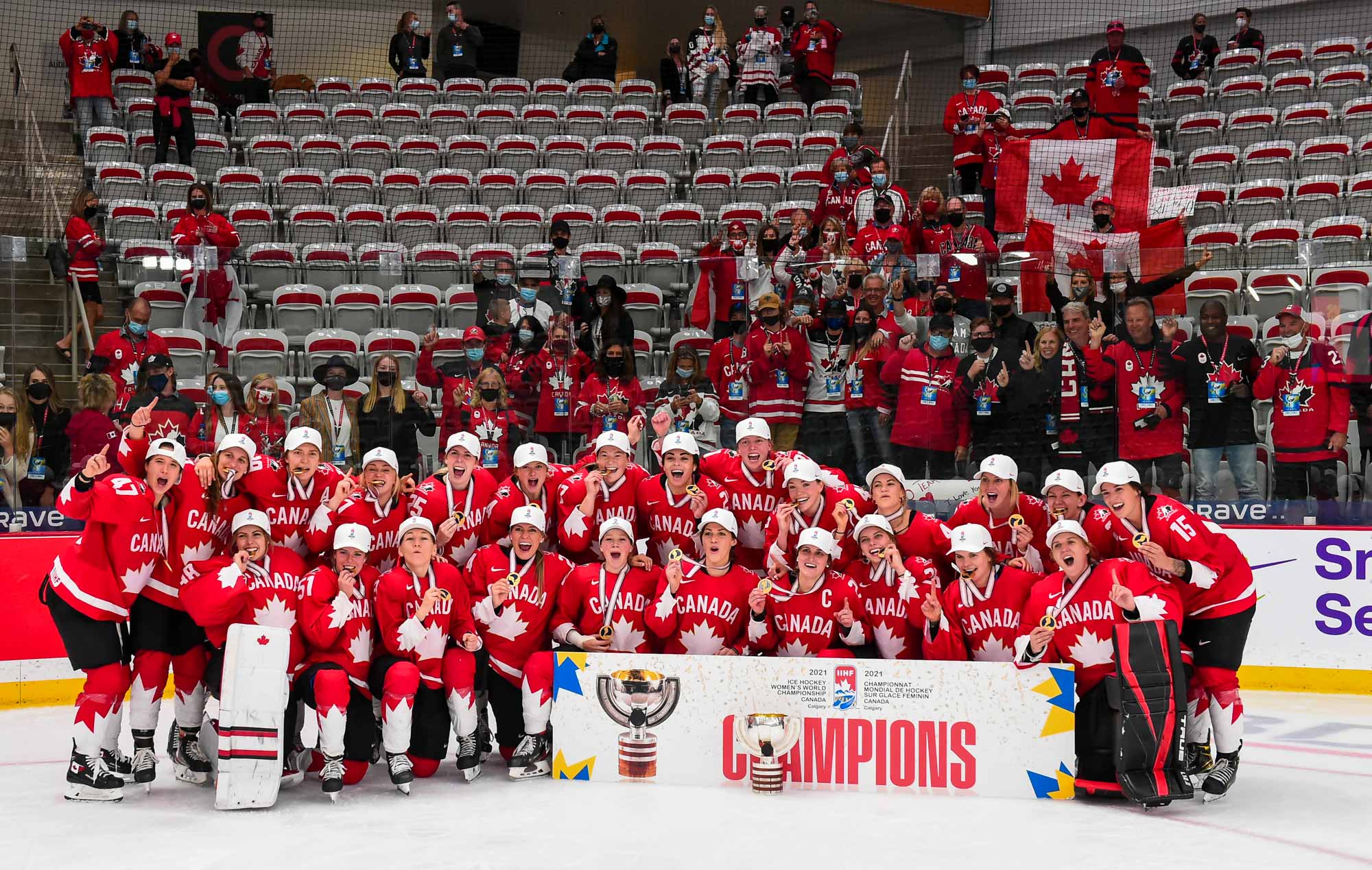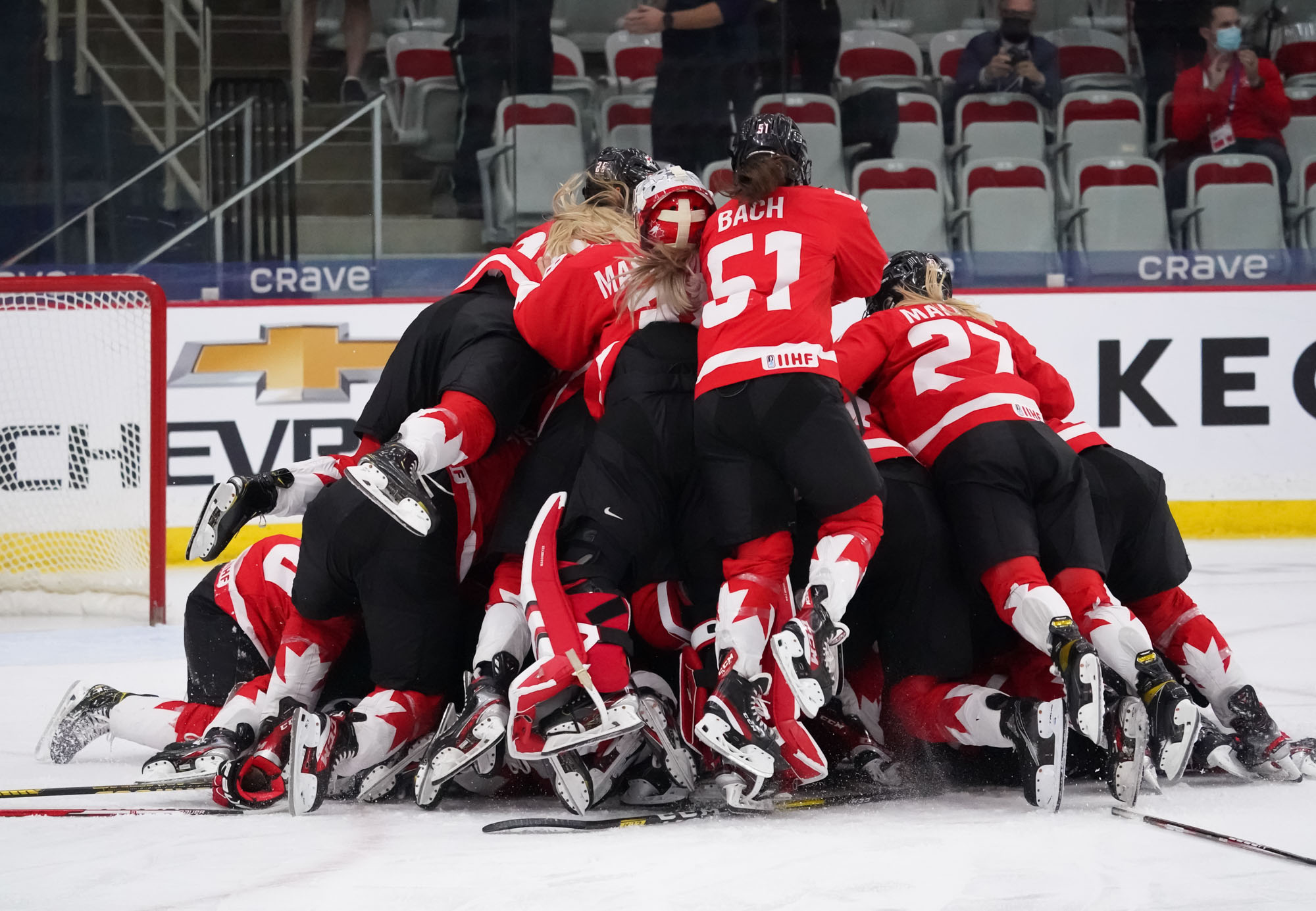 Team Canada celebrate after the 3-2 overtime win against Team USA for gold at the 2021 IIHF Ice Hockey Women's World Championship.
