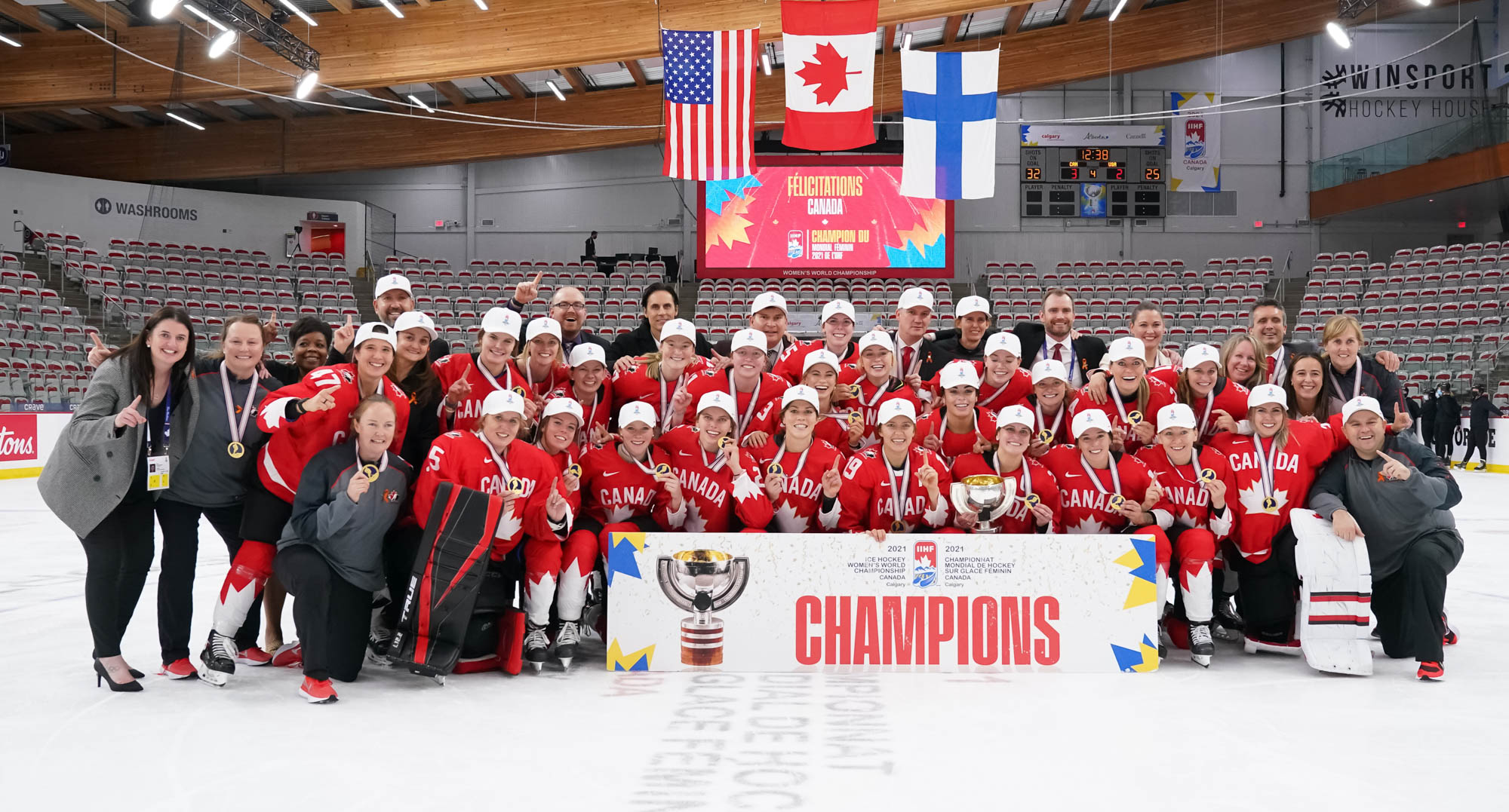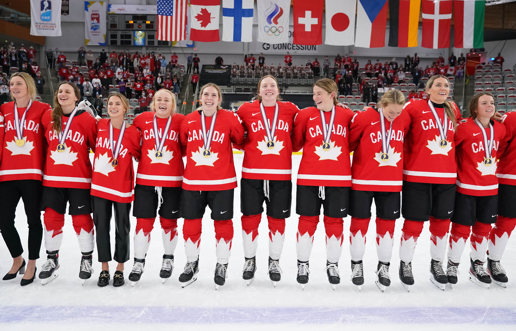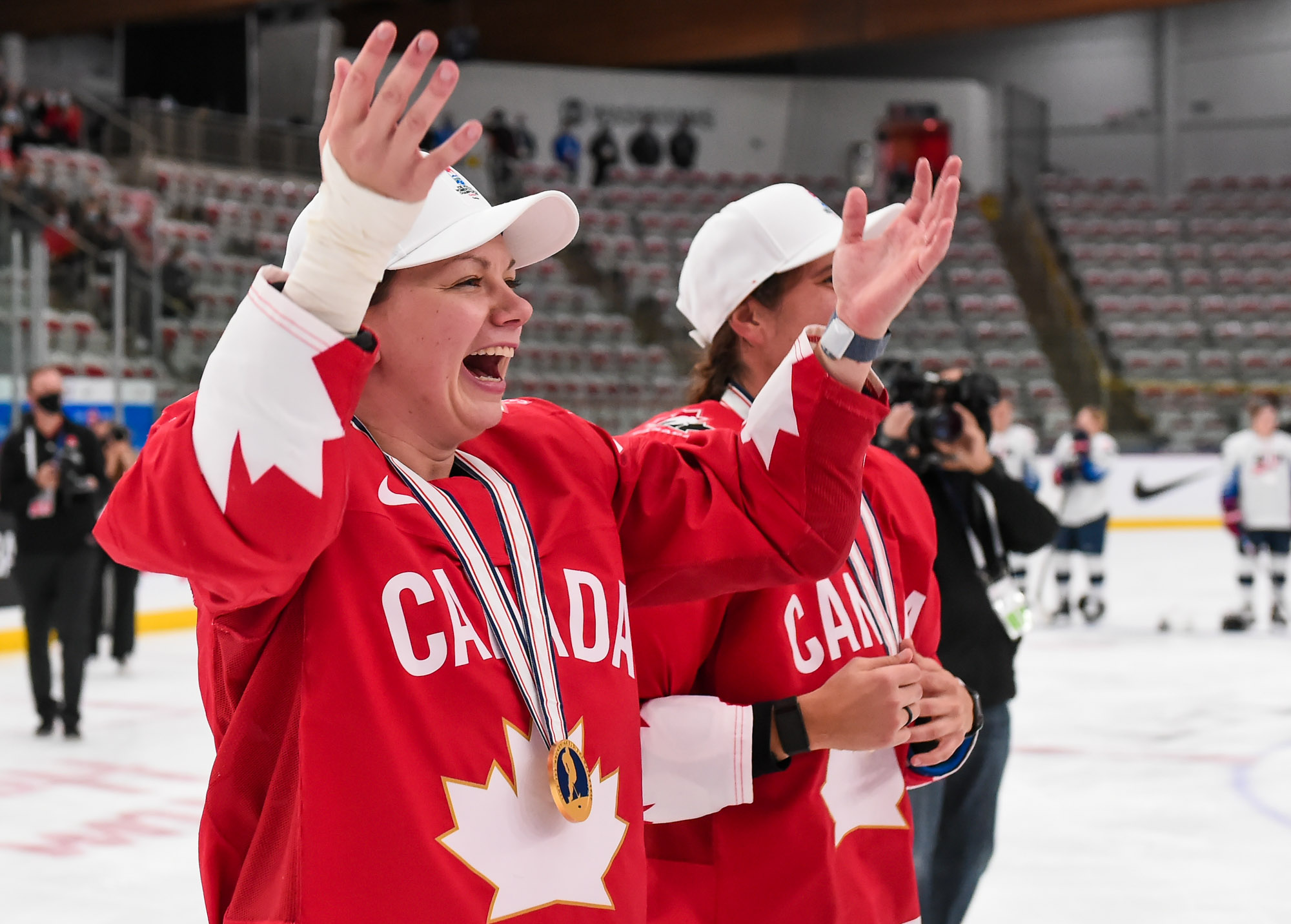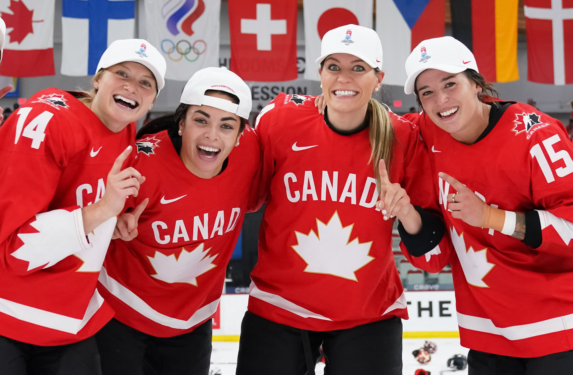 Team Canada celebrate after the 3-2 overtime win against Team USA for gold at the 2021 IIHF Ice Hockey Women's World Championship.