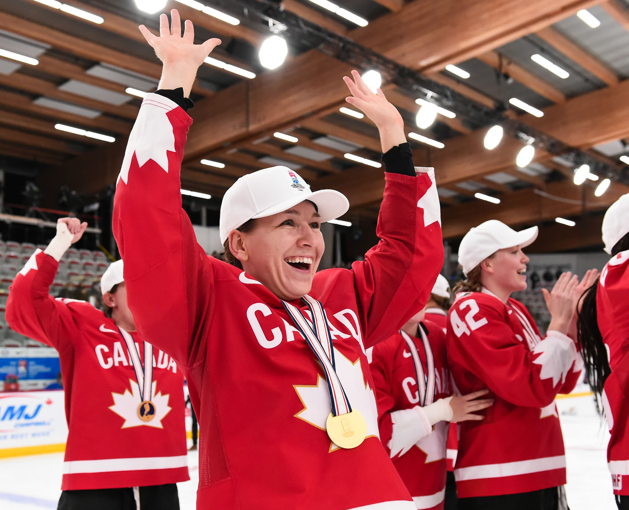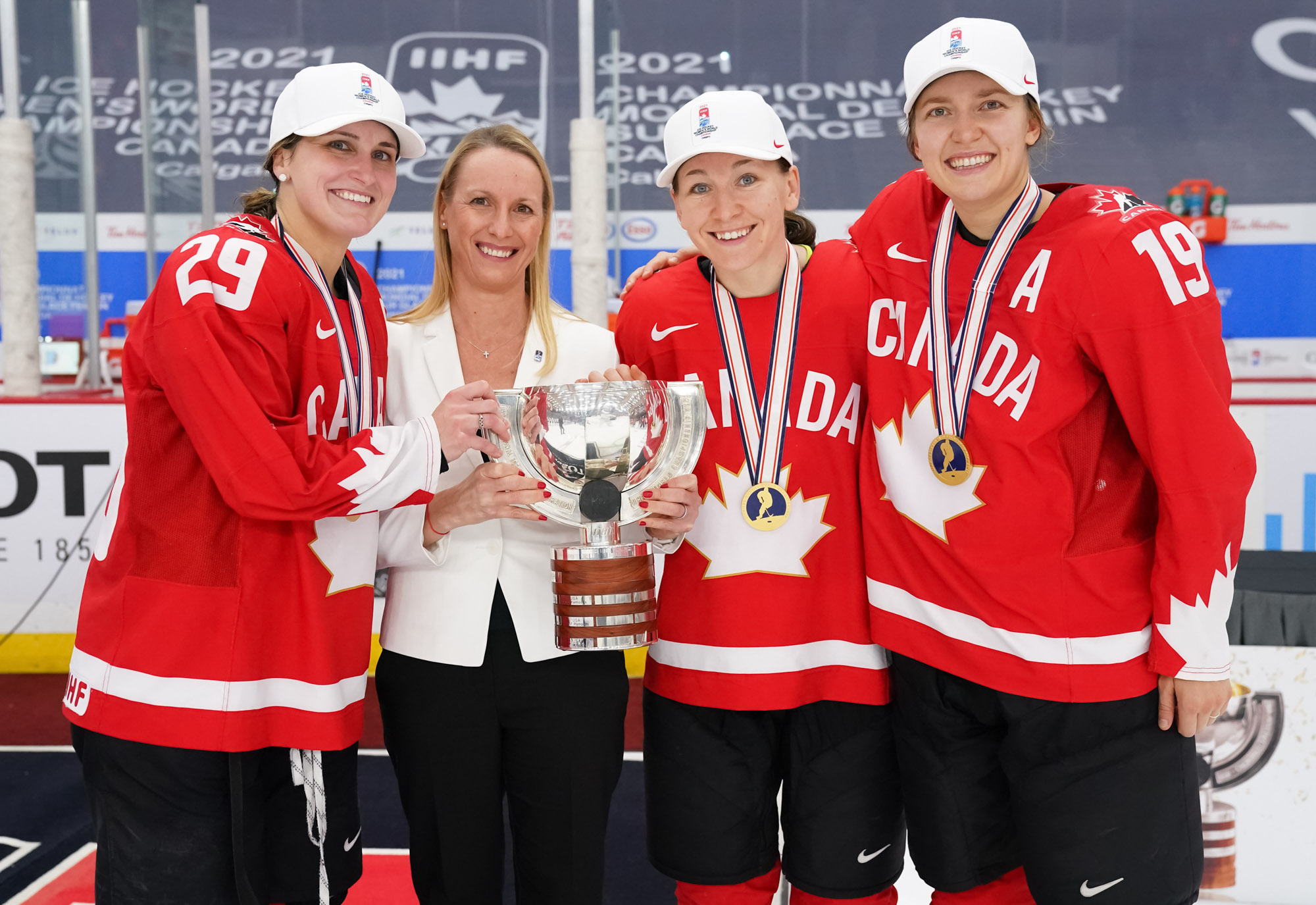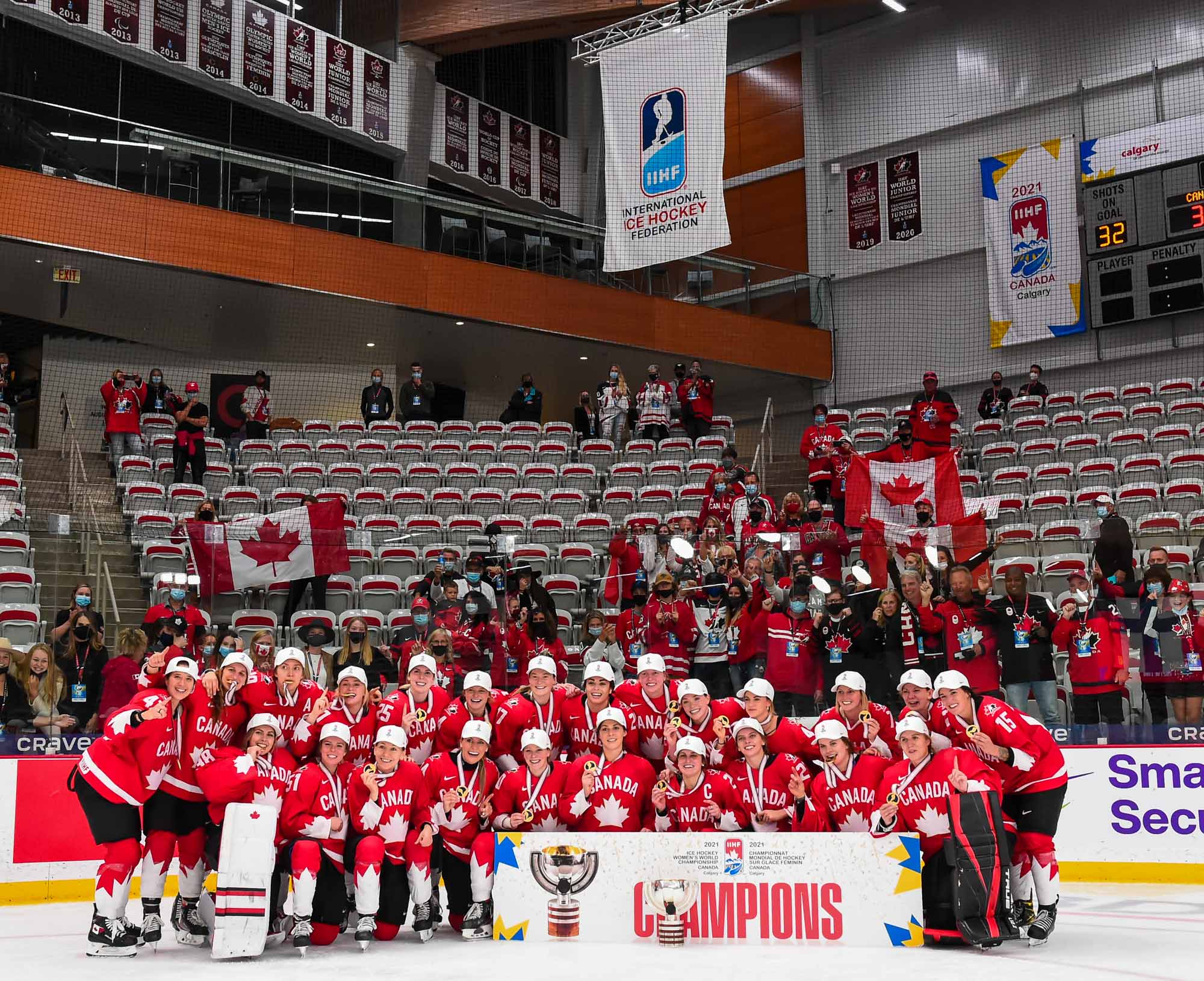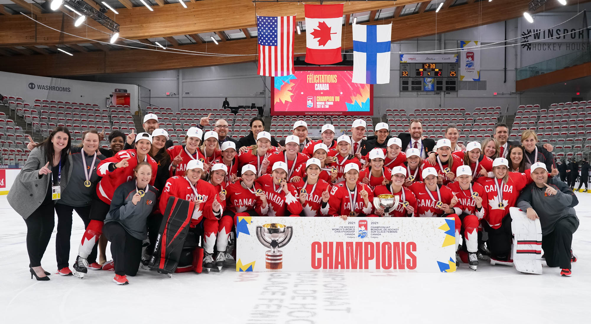 Team Canada celebrate after the 3-2 overtime win against Team USA for gold at the 2021 IIHF Ice Hockey Women's World Championship.
