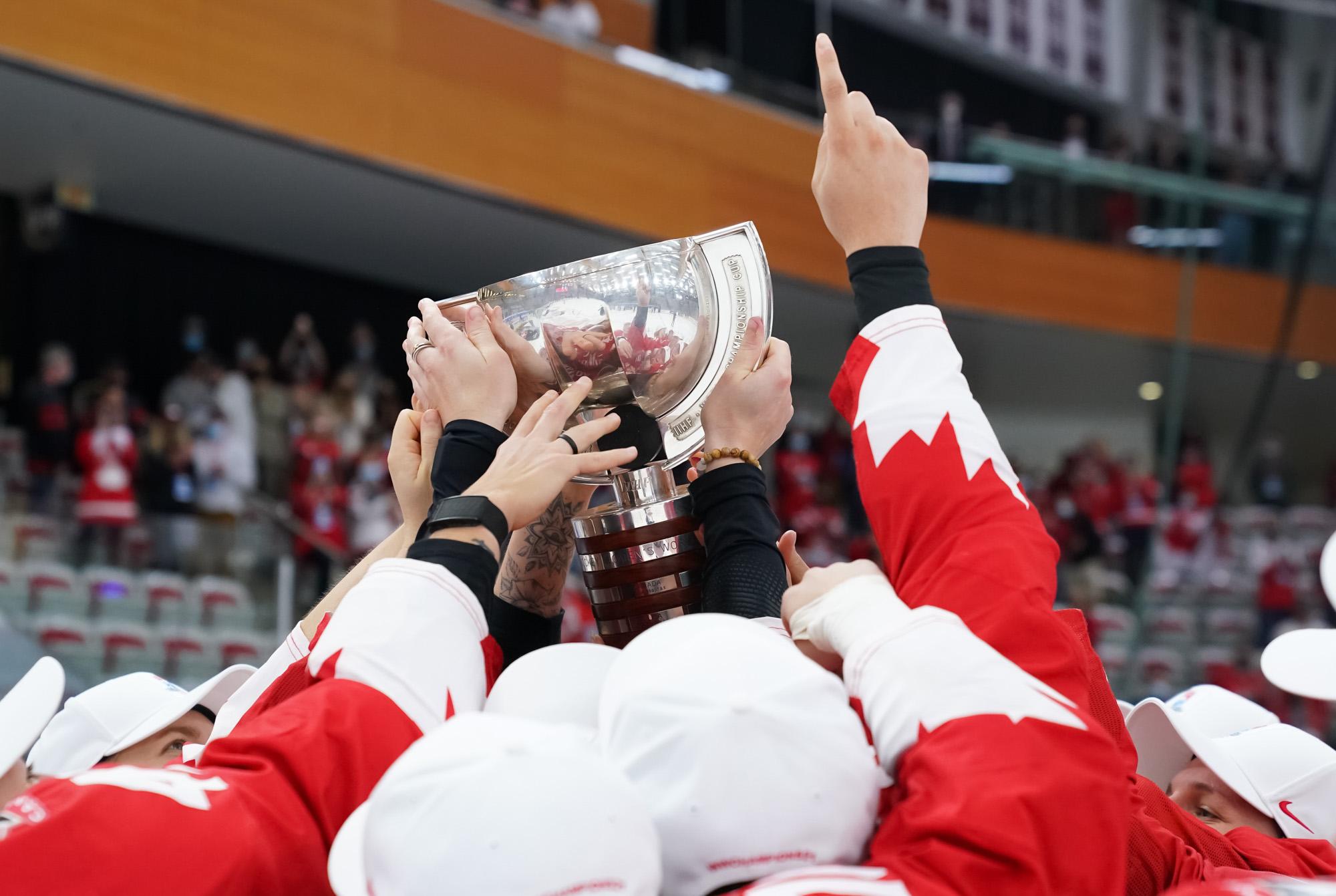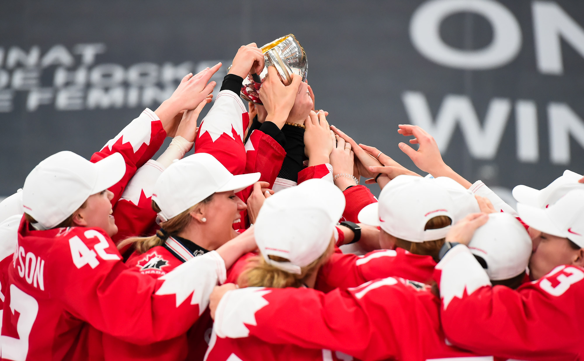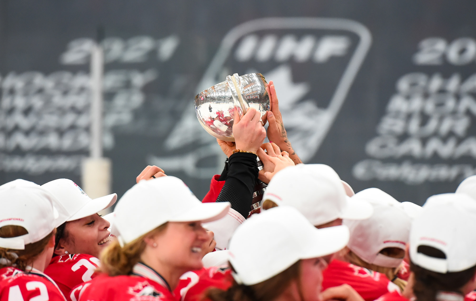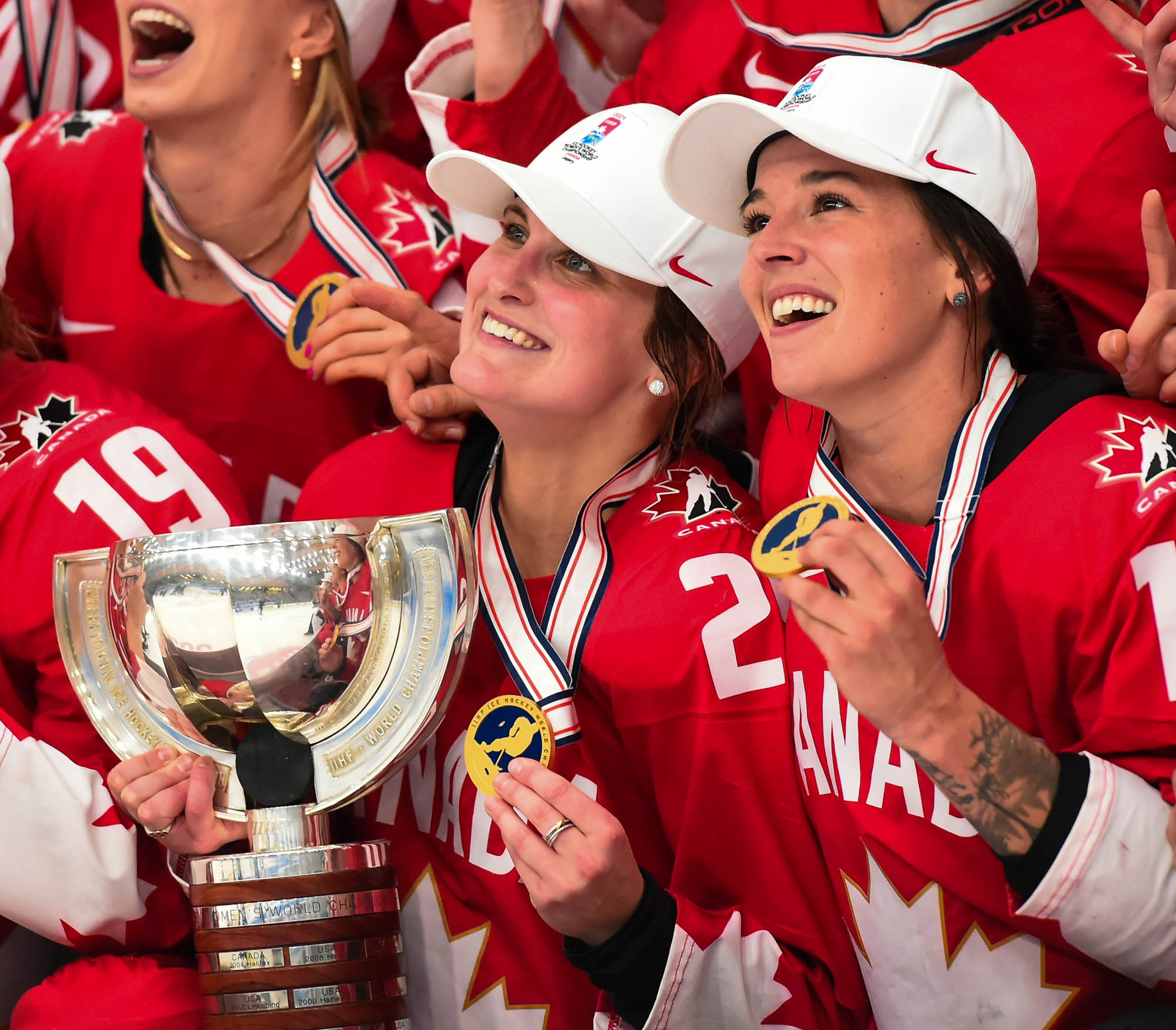 Team Canada celebrate after the 3-2 overtime win against Team USA for gold at the 2021 IIHF Ice Hockey Women's World Championship.