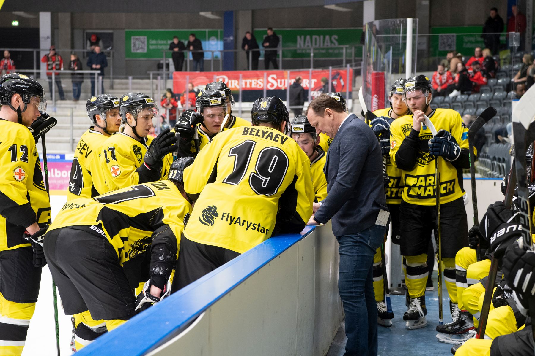 “They boys are back and they’re looking for trouble,” was played at the arena after the Pirates’ first goal in the tournament. A coach challenge didn’t change the decision and Saryarka gave up a penalty for it but Aalborg didn’t capitalize on the power play while on the other side captain Edgars Siksna was close to Saryarka’s fourth goal when his shot hit the crossbar during a man advantage.