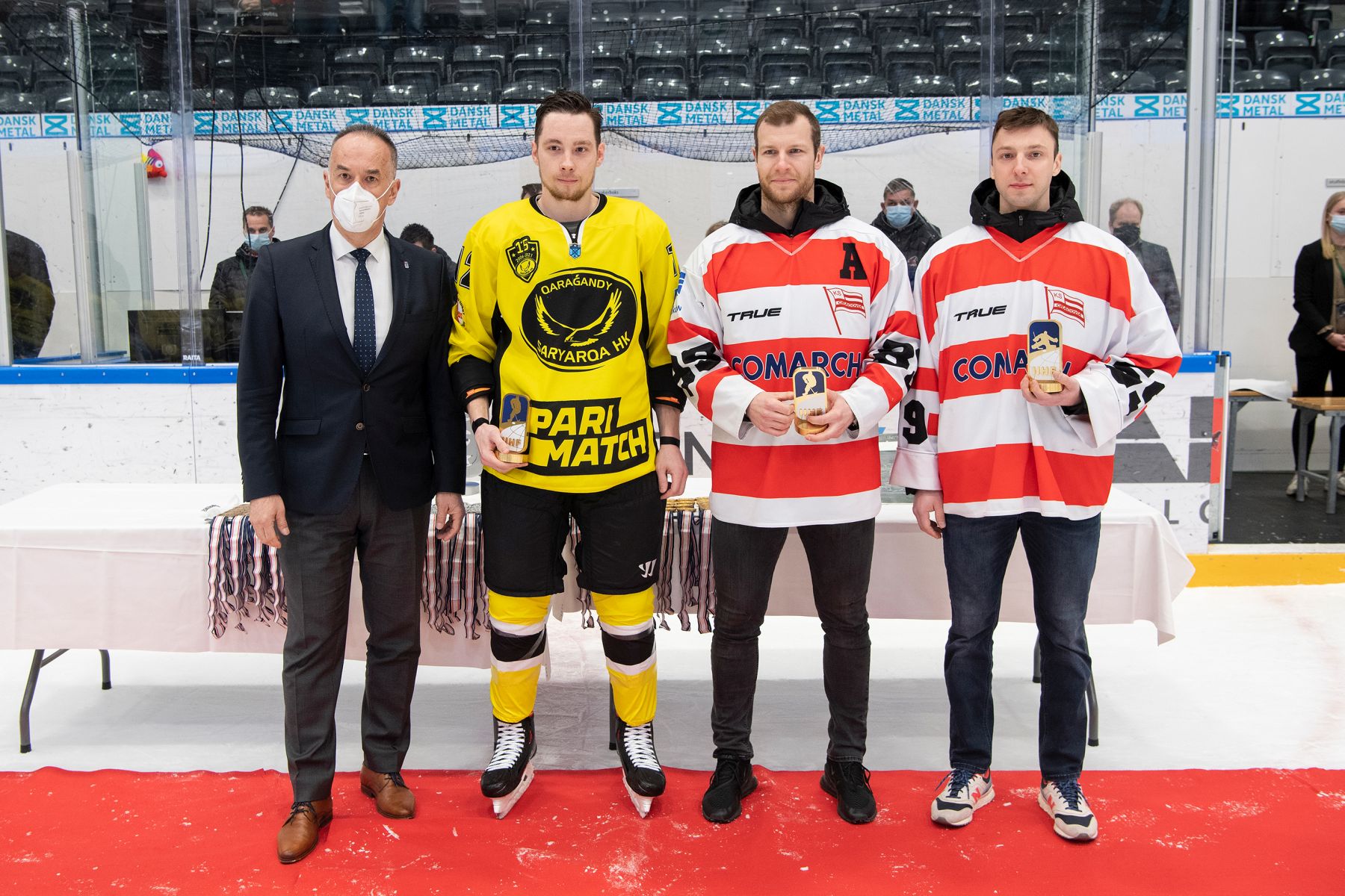 Also the individual awards selected by the tournament directorate were given to Cracovia goaltender Denis Perevozchikov, Cracovia defender Jiri Gula and Saryarka forward Sergei Barbashyov.