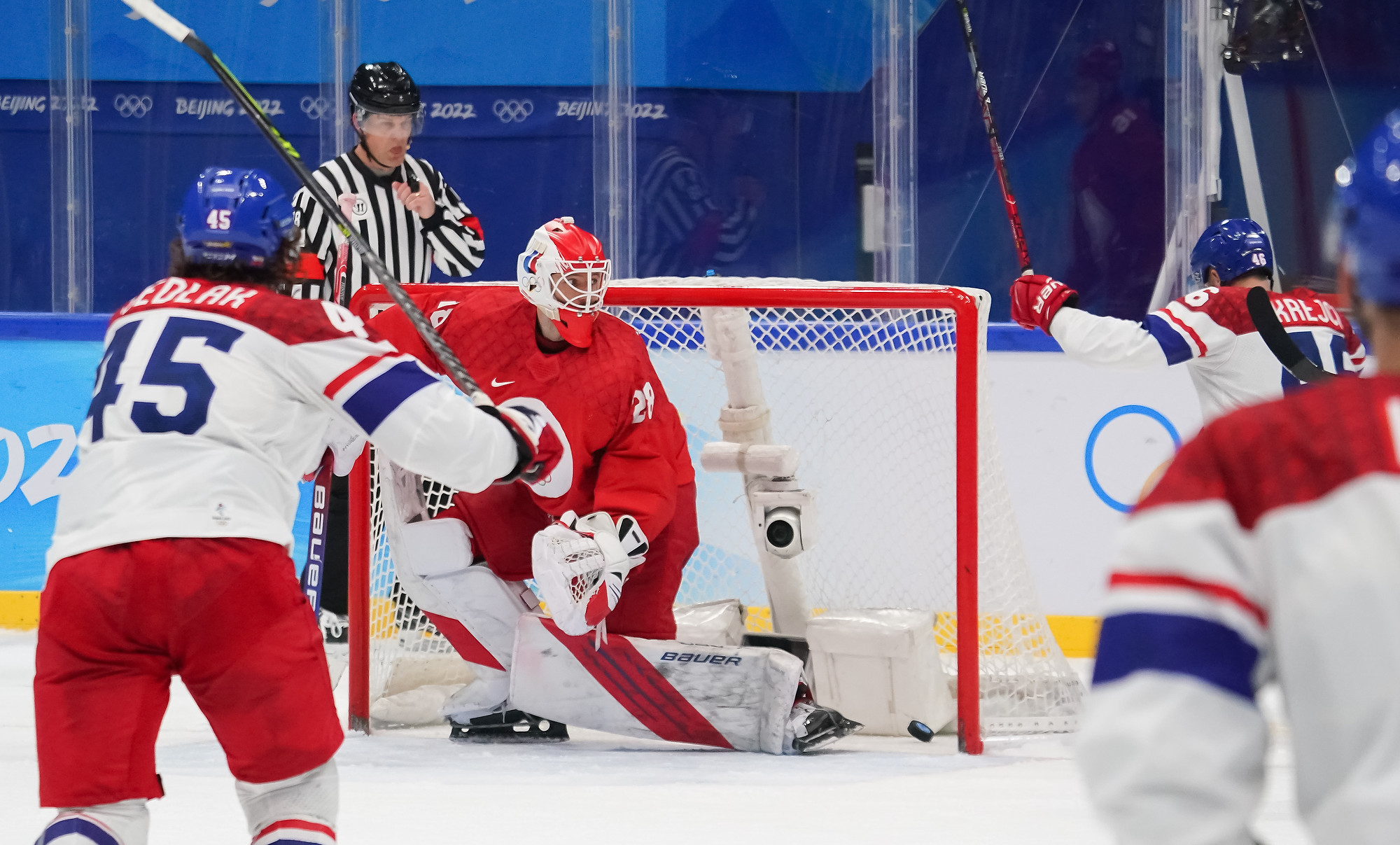 Hrubec was busy at the start of the second period, with an arm save to deny Mikhail Grigorenko representing the highlight of the early exchanges. And when ROC got a 5-on-3 power play, Alexei Zhamnov’s team regained the lead. The Czechs dug deep to try to kill the penalties, but once back to four men the defence was breached and Nikita Nesterov got his team’s first power play goal in these Games.