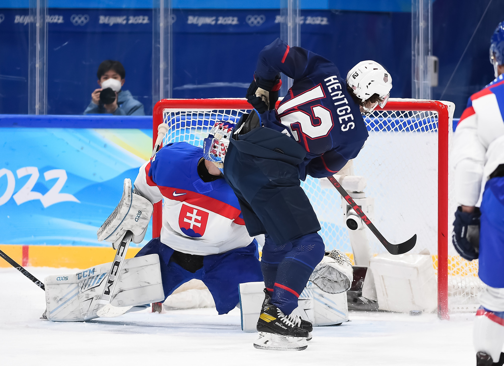 Slovakia pressed hard in the second period and held a 13-6 advantage in shots, but it was the Americans who scored the lone goal, and it again was the result of a quick series of passes to finish off a rush. Just shy of the game’s 29-minute mark, Sam Hentges, with his back to the goalie, took a pass from Nick Perbix and, with Rybar guessing backhand, spun around on his forehand and found some open room just inside the post.