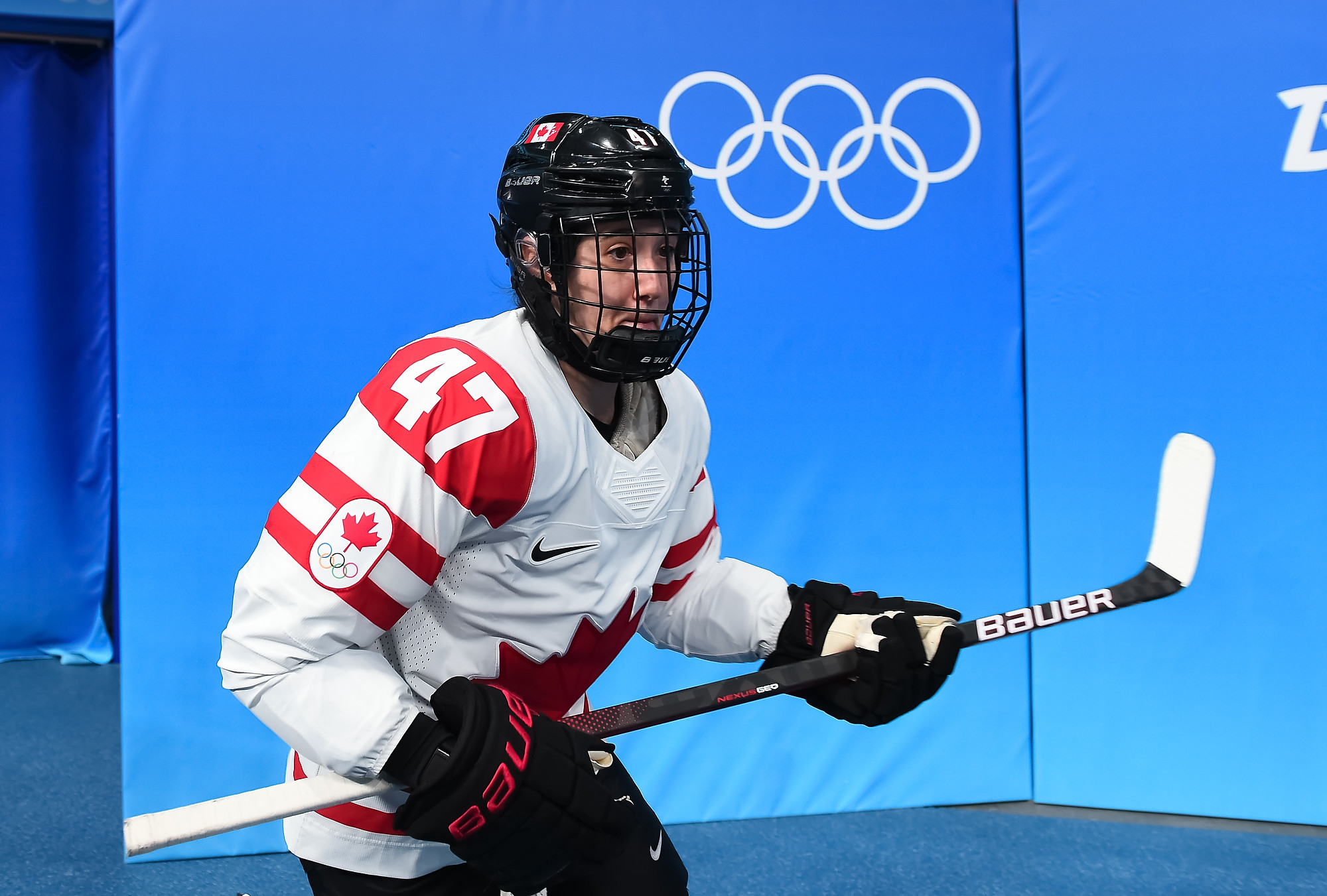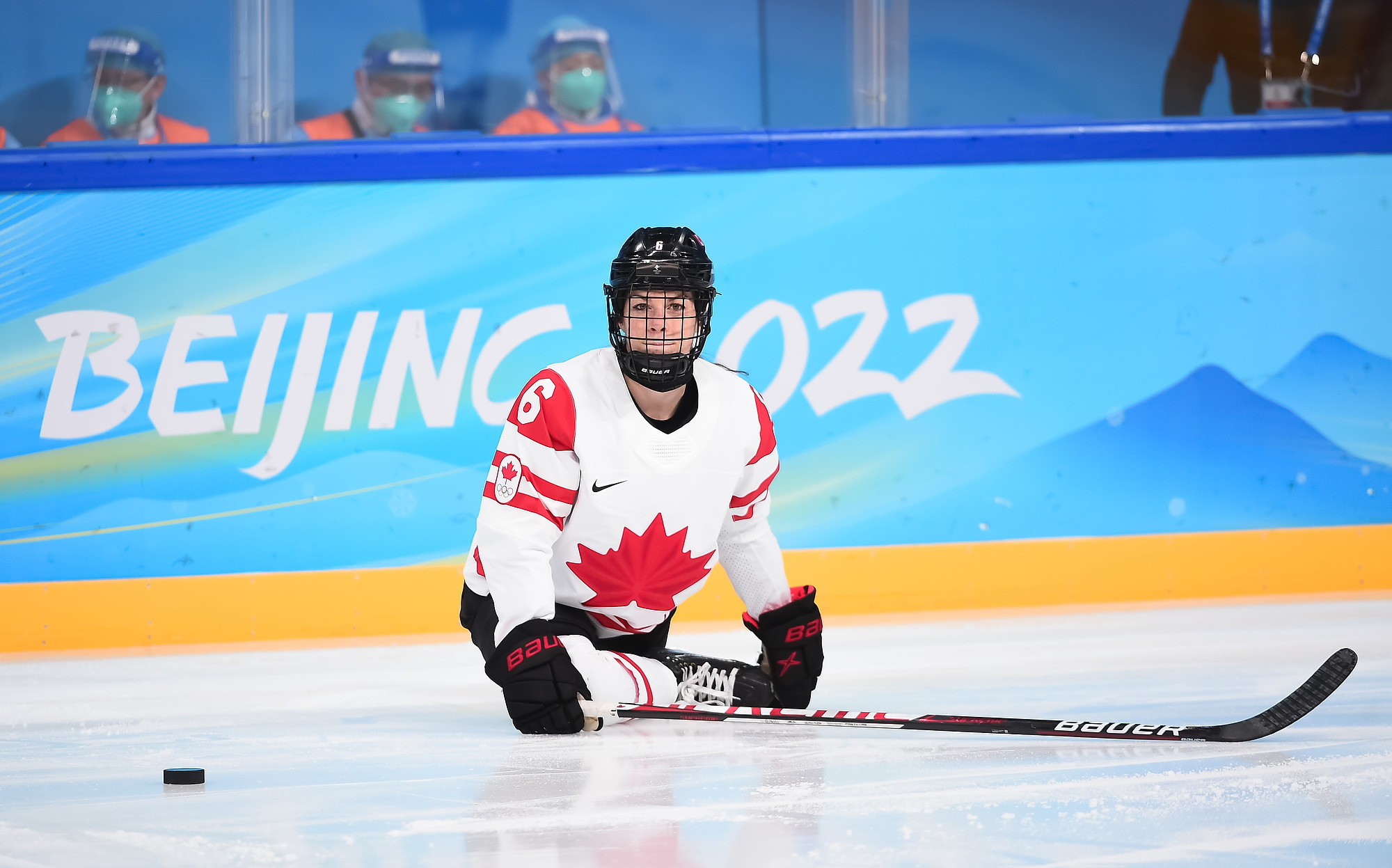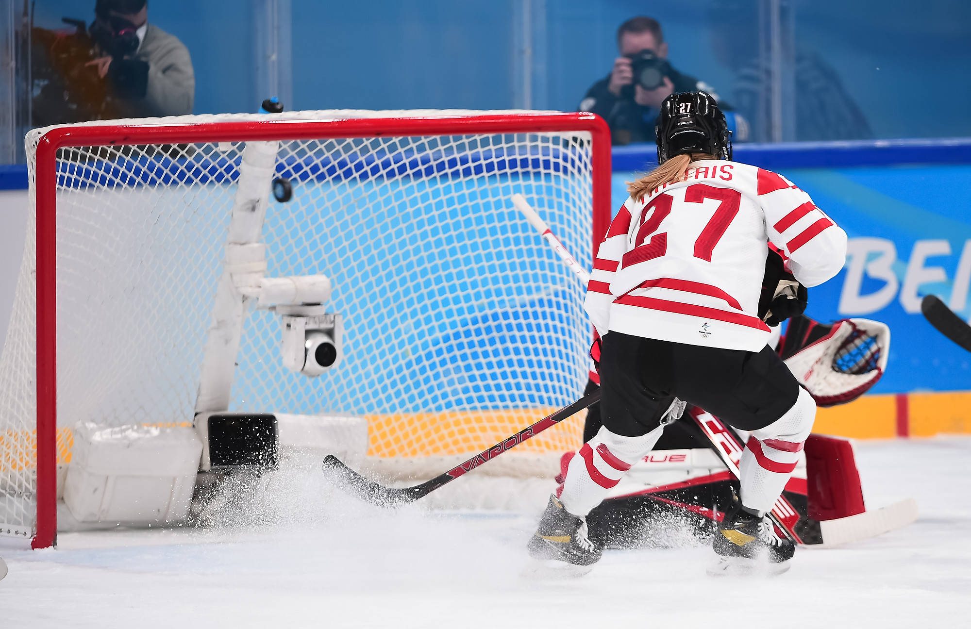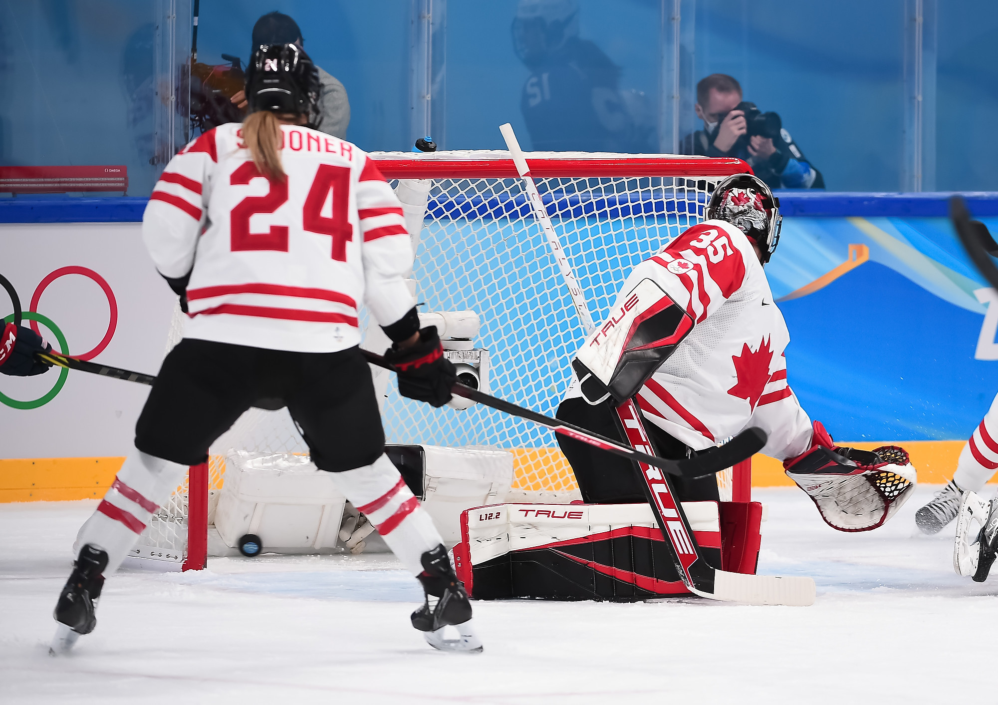 With under three minutes to pay in the middle frame, Cayla Barnes hooked Poulin on a shorthanded breakaway and the captain was awarded a penalty shot, the first one in Canadian Olympic women's hockey history. She curled in from the left side and got the puck past Rooney's blocker for a 4-2 lead.