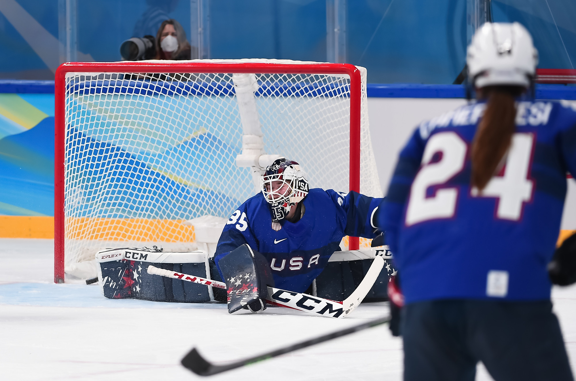 An exciting rush led by Roque led to America's second goal. Roque found Kessel in the middle and she skimmed it to partner-in-crime Carpenter, who let Desbiens go down before roofing a backhander for a 2-1 lead at 11:34.