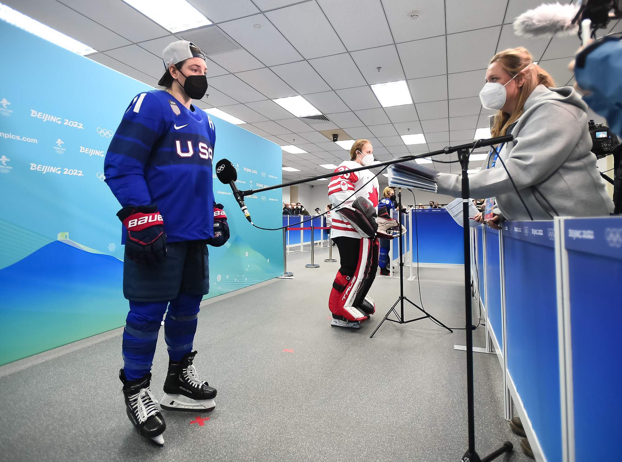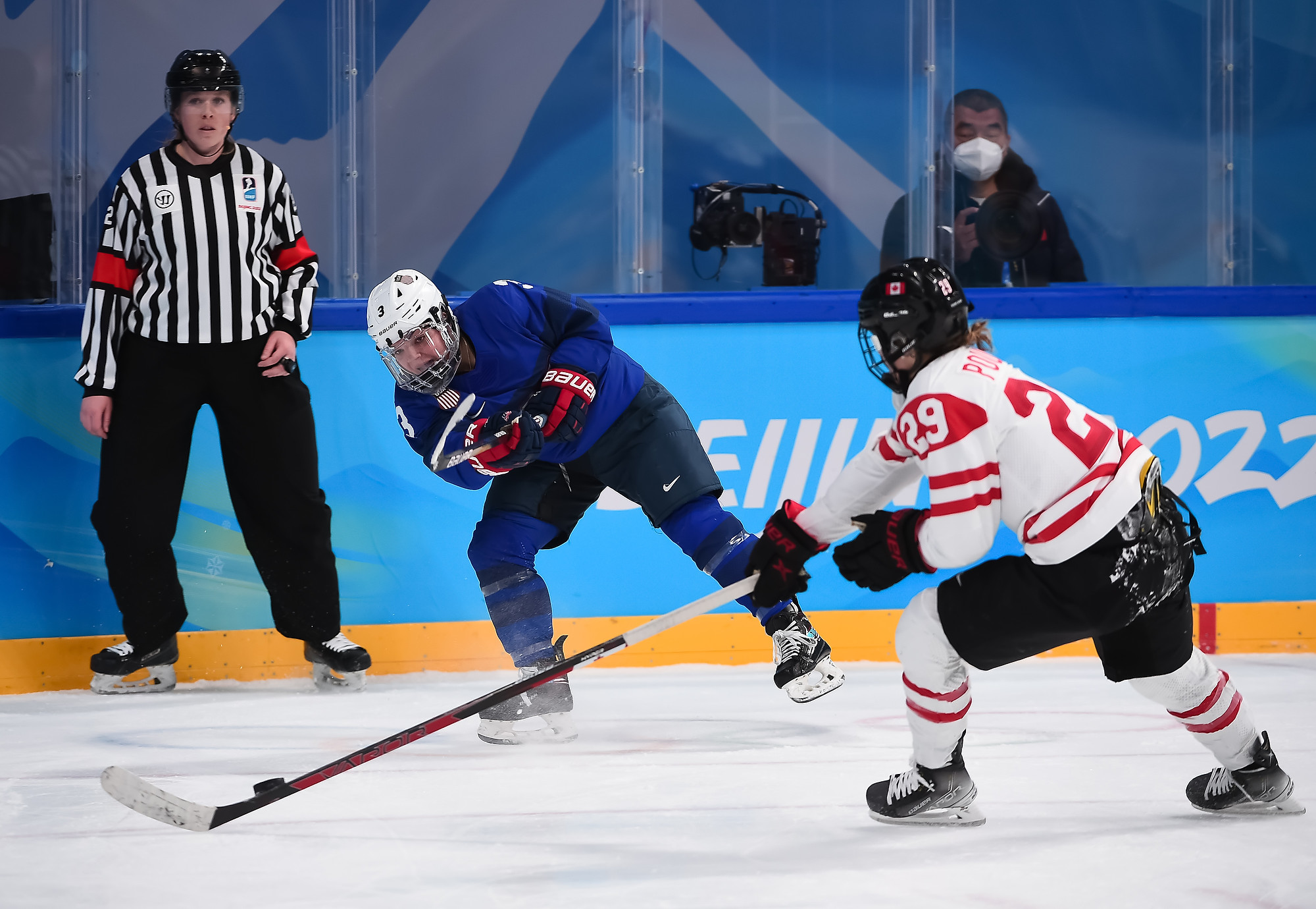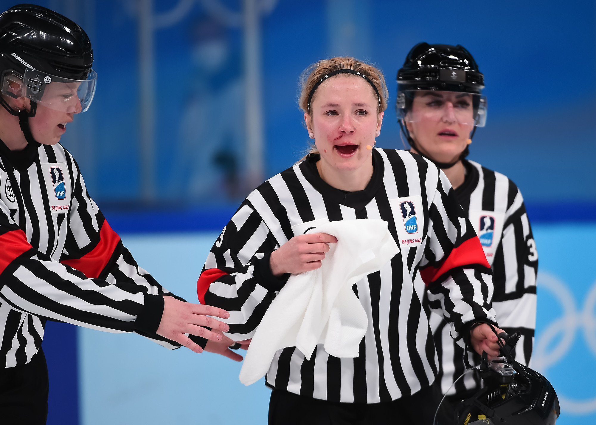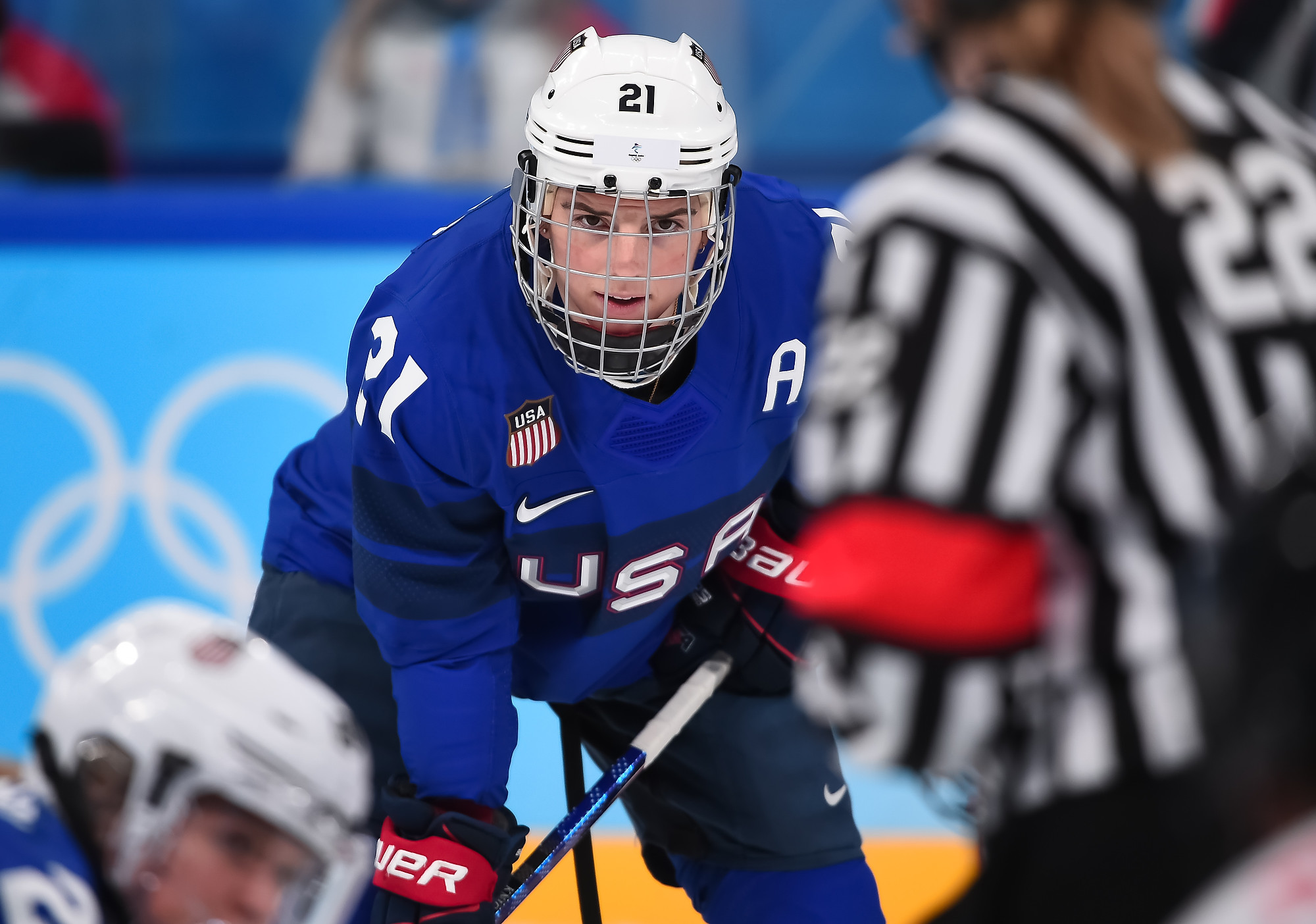 In the second period, blood was shed, but not because both teams drove to the net fearlessly. U.S. veteran Amanda Kessel inadvertently clipped referee Cianna Lieffers with a high stick and cut her. She went off for repairs and the play continued with three on-ice officials until Lieffers returned with a Band-Aid.