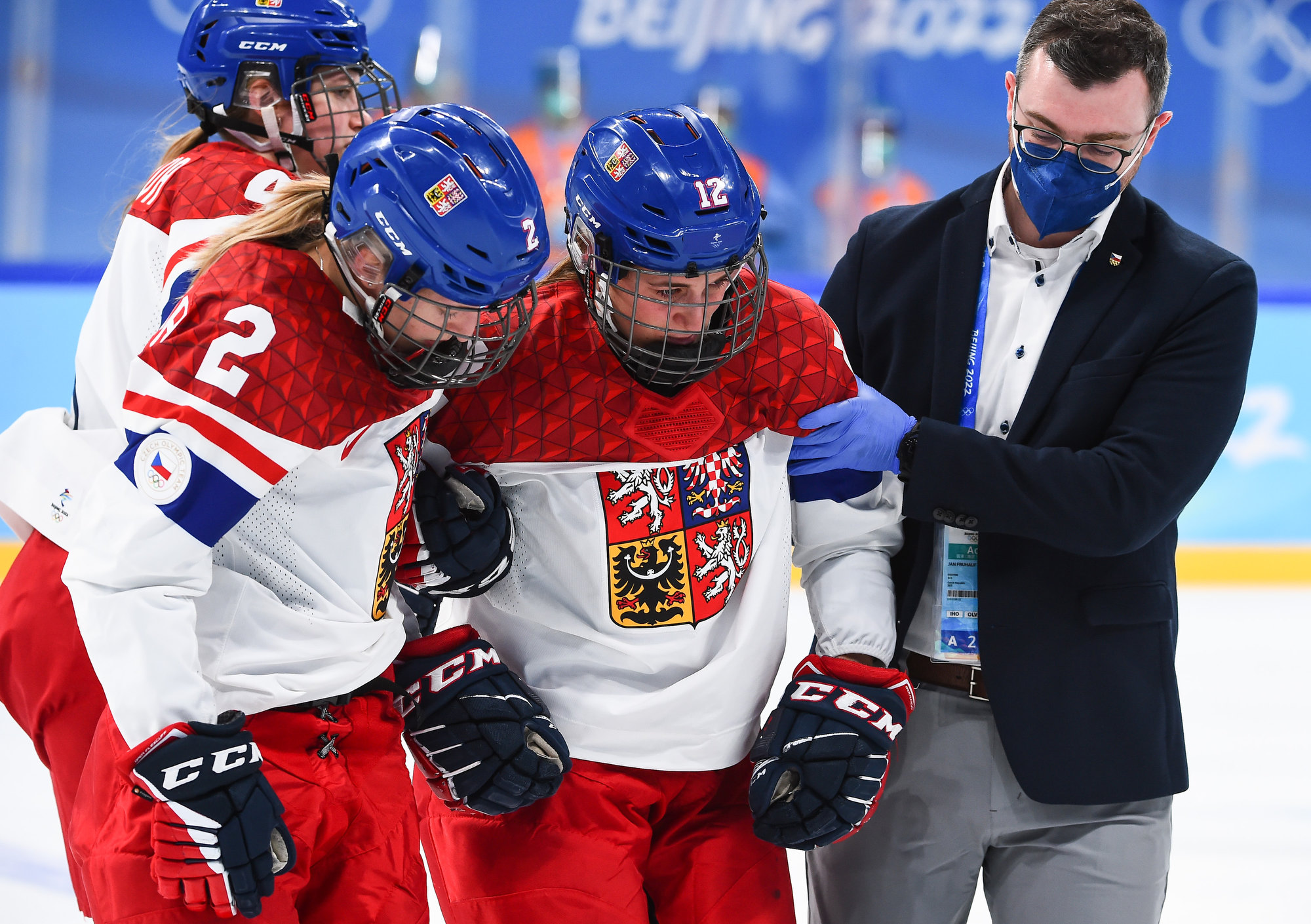 The Czechs nearly lost another player in the second period when Natalie Mlynkova took a slap shot to the side of her helmet while sliding to block it. However, after play was stopped, she was able to get to her feet and skated off the ice on her own accord, returning to the ice later in the period.
