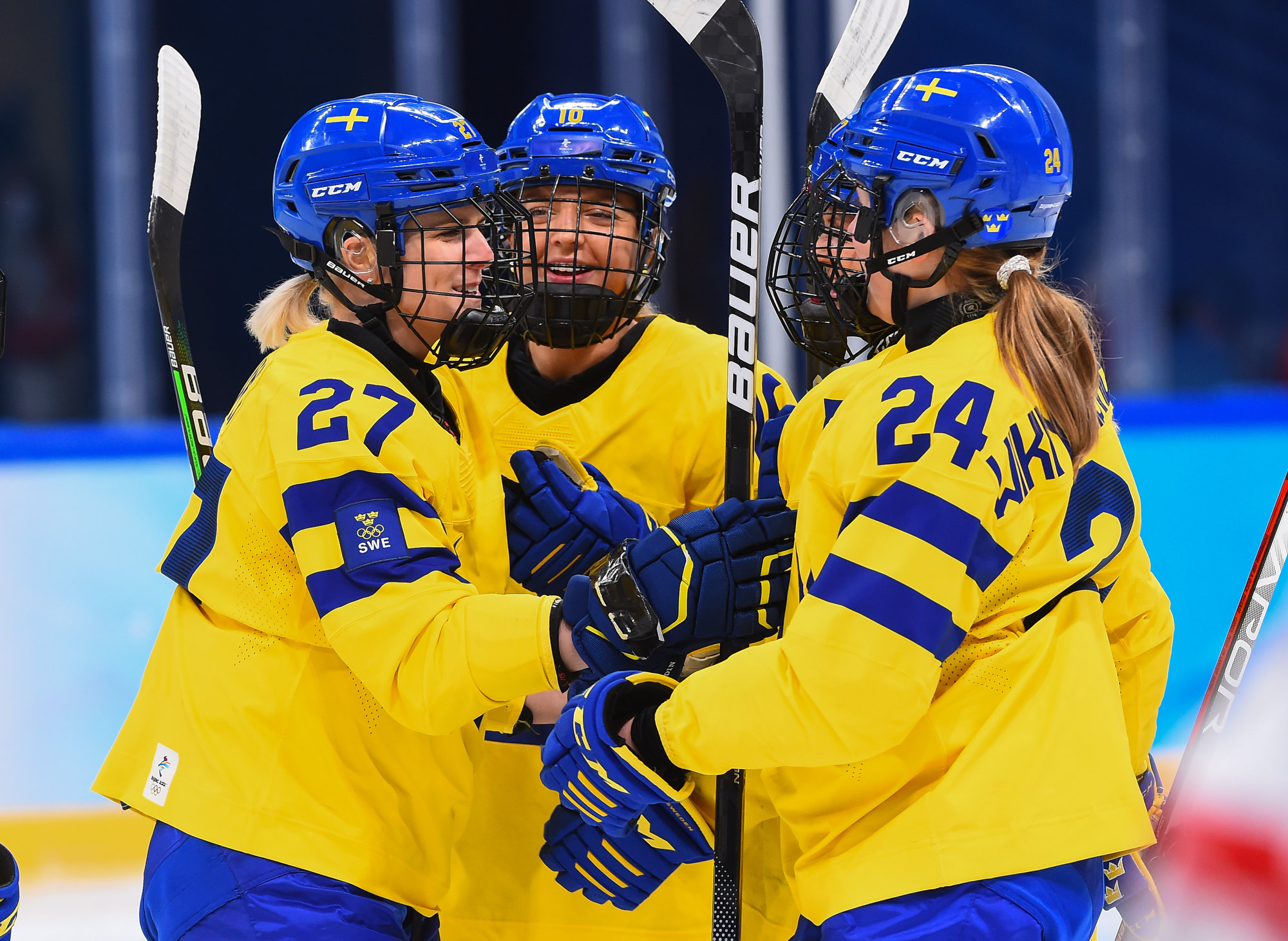Ebba Berglund #8 of Sweden celebrates her third-period goal against Denmark with Maja Nylen Persson #12 and Michelle Lowenhielm #28.