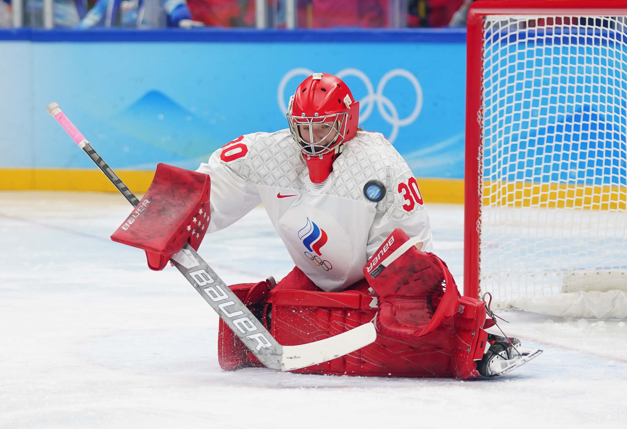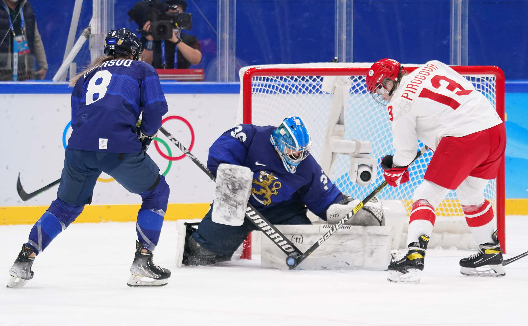Three and a half minutes later, they made it 4-0 on a power play. Minnamari Tuominen’s point shot deflected off the glove of ROC defender Yelena Provorova and landed in behind Sorokina. The goal went to a lengthy video review to see if a high stick made contact, but the goal on the ice stood.