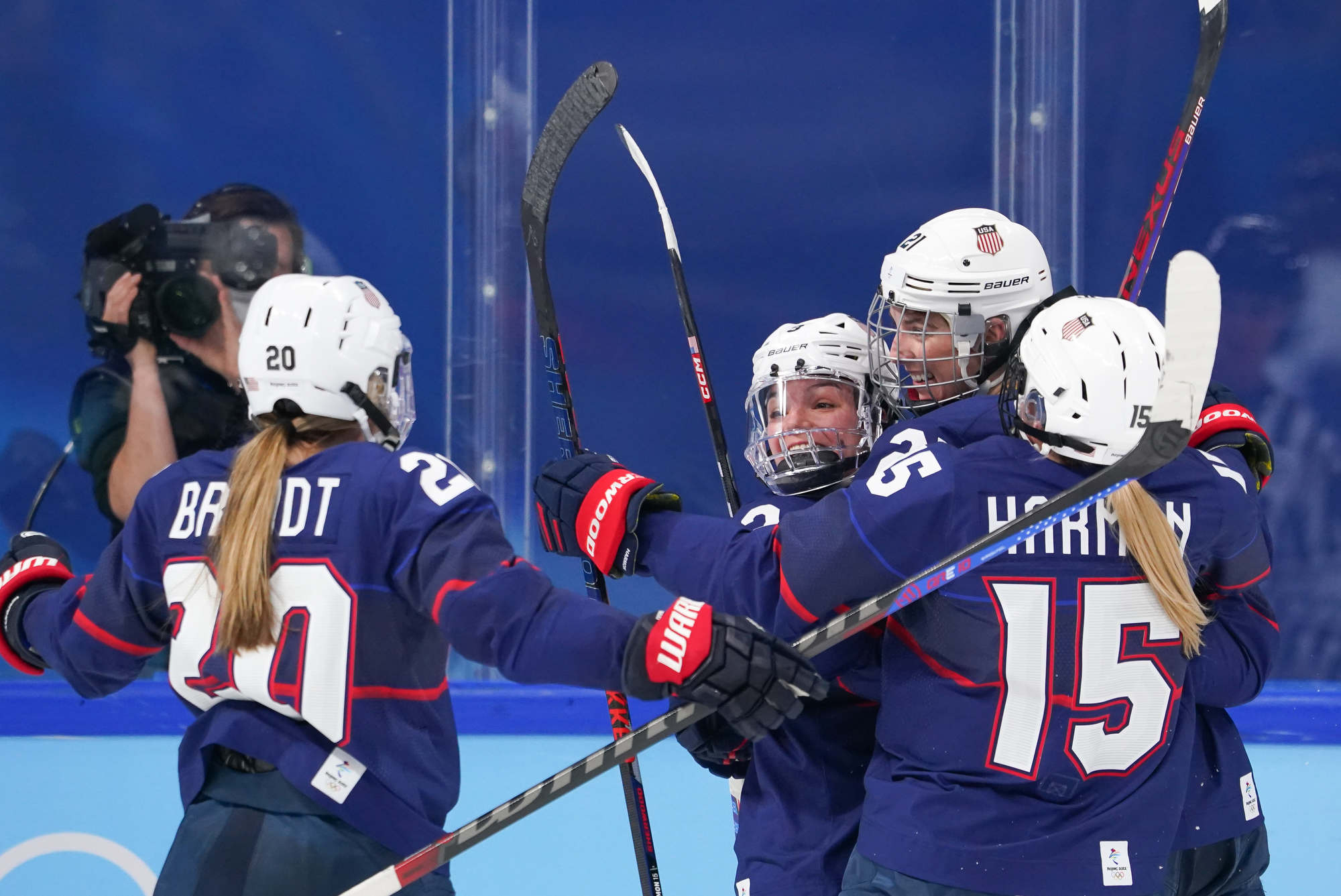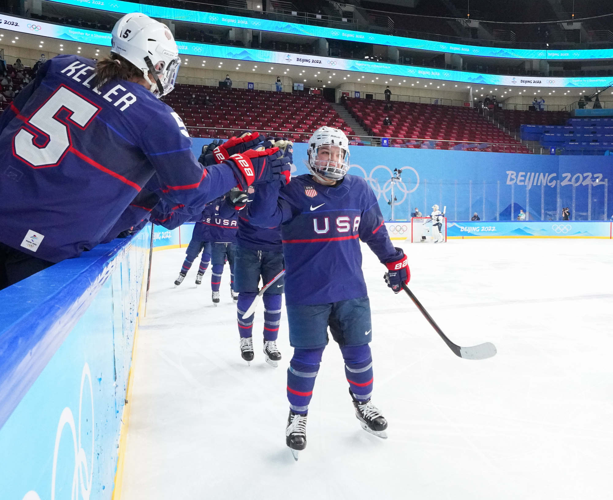 USA's Hilary Knight #21 celebrates with Kendall Coyne Schofield #26, Hannah Brandt #20, Savannah Harmon #15 and Megan Keller #5 after scoring against Finand.