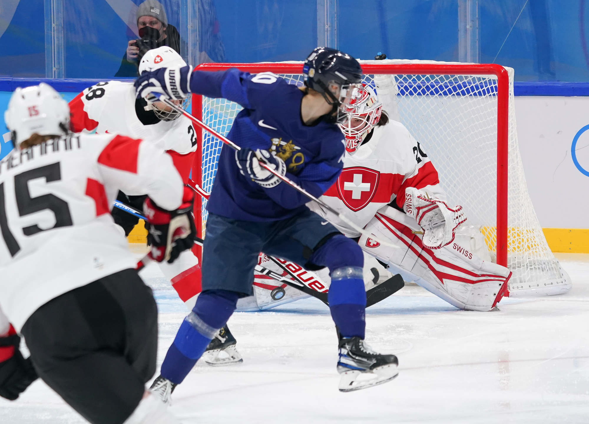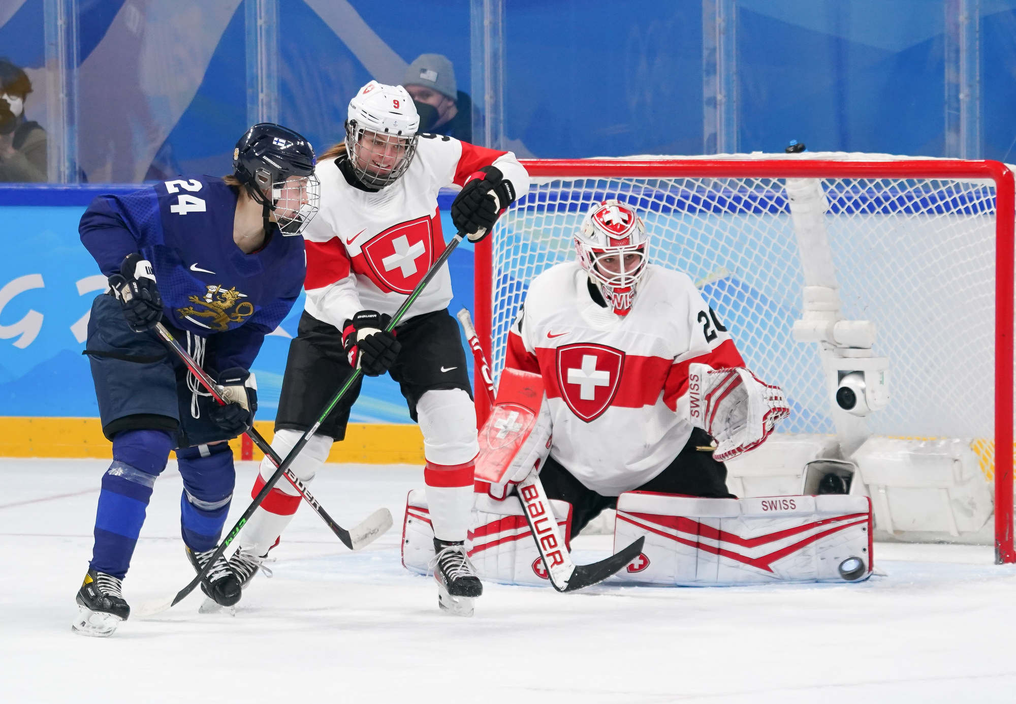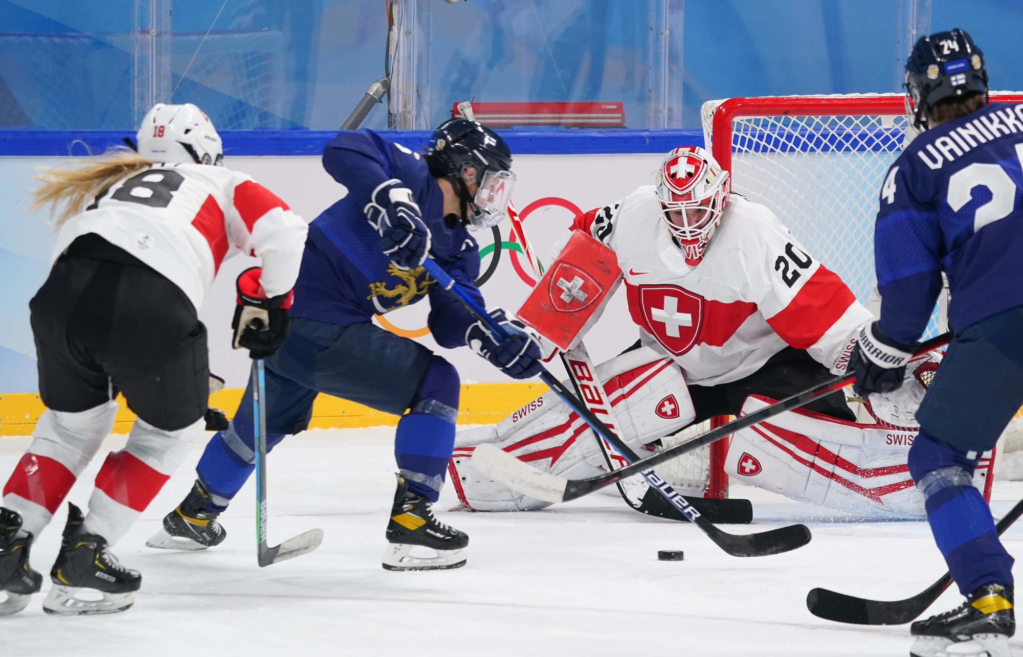 The game’s first goal came off the rush on a play that hardly looked dangerous. Elisa Holopainen carried the puck into the Swiss end and set up Noora Tulus for a shot. Braendli made the save but went down with a defender, and Viivi Vainikka knocked in the loose puck at 11:36.