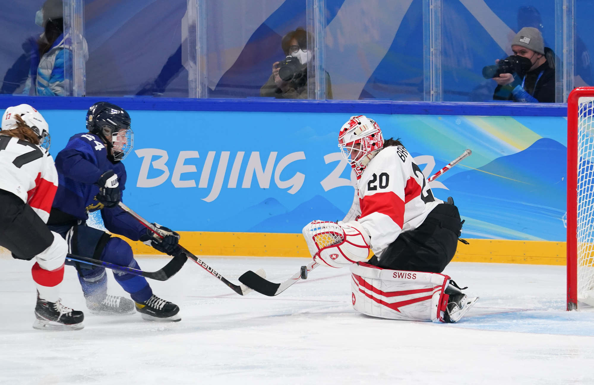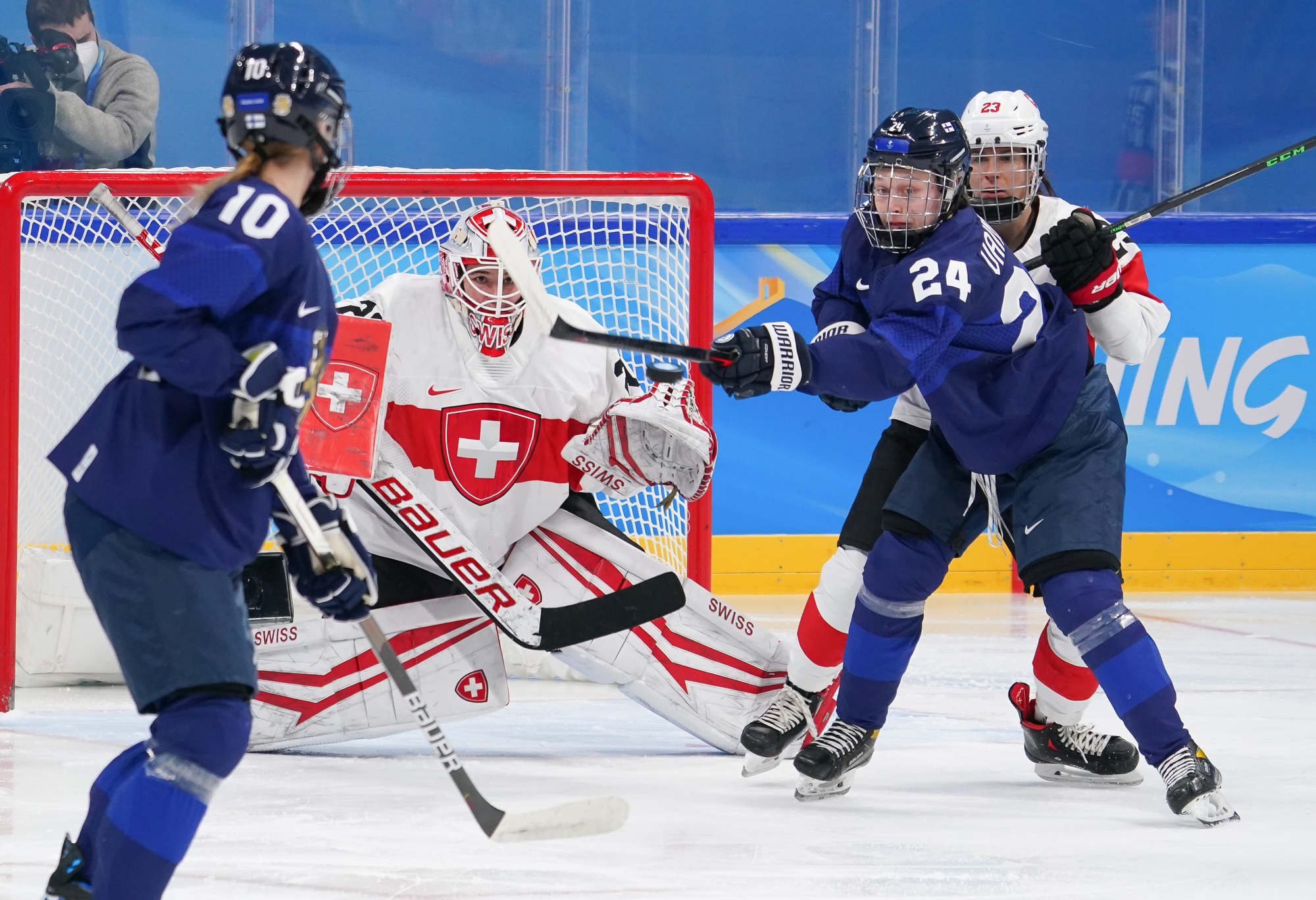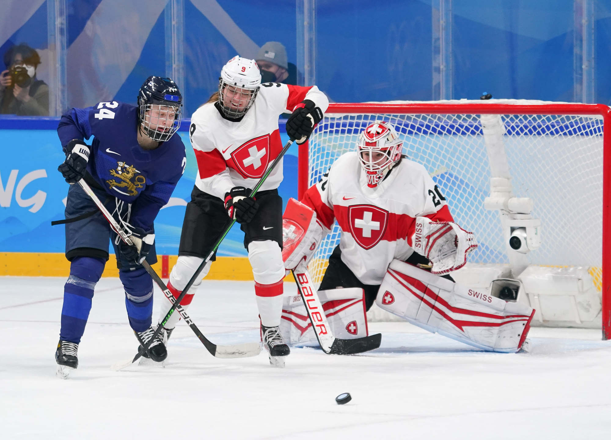 The game’s first goal came off the rush on a play that hardly looked dangerous. Elisa Holopainen carried the puck into the Swiss end and set up Noora Tulus for a shot. Braendli made the save but went down with a defender, and Viivi Vainikka knocked in the loose puck at 11:36.