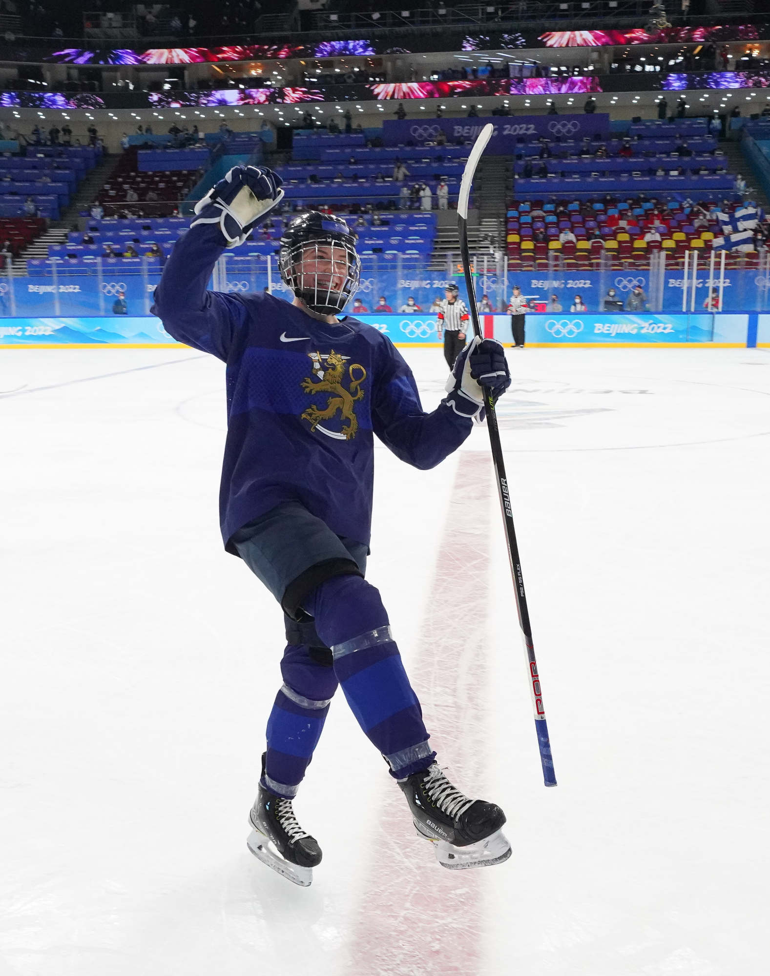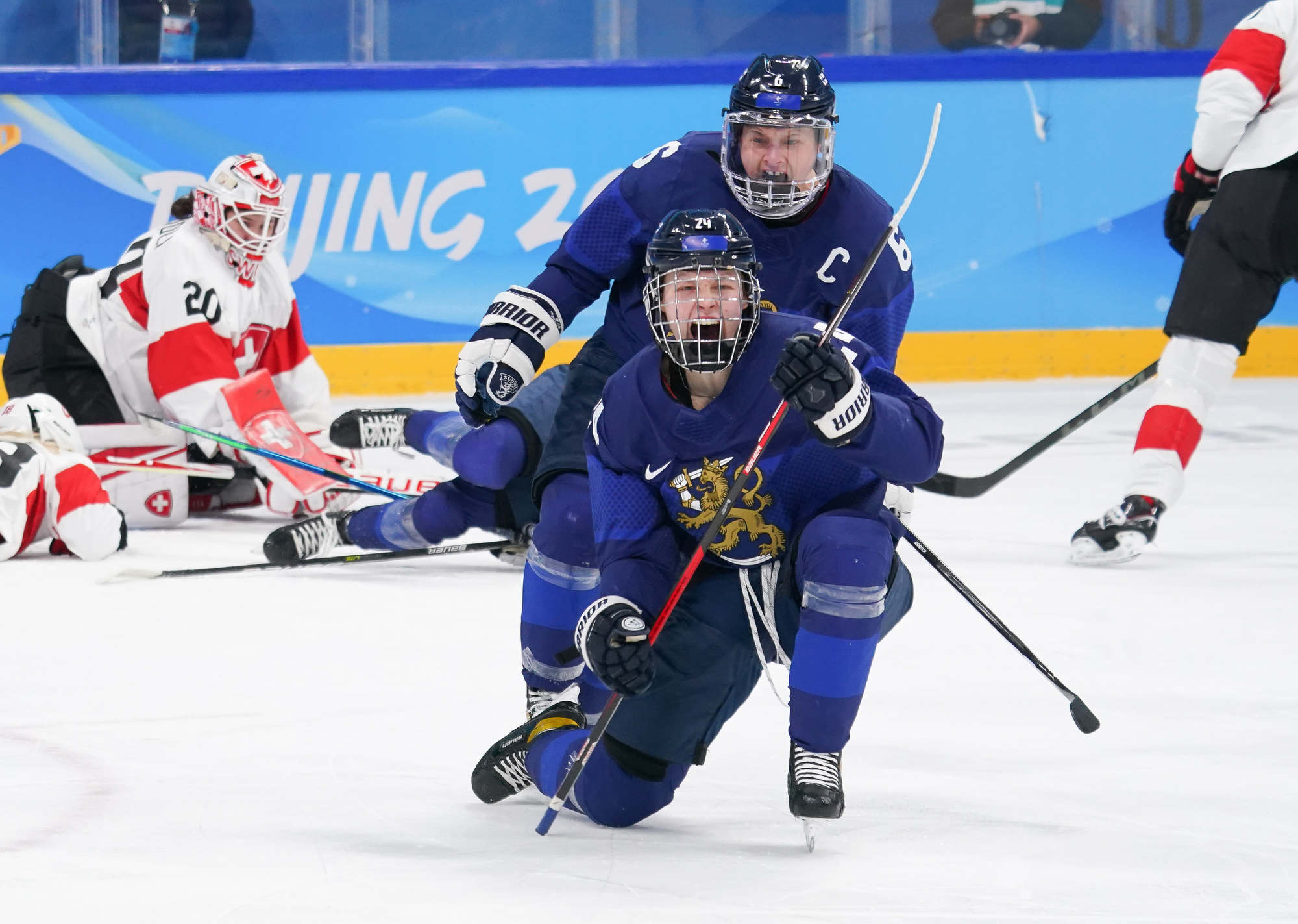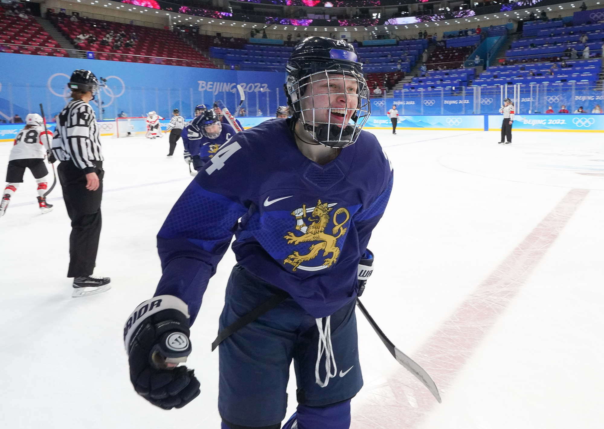 Viivi Vainikka celebrates after scoring the opening goal for Finland in the bronze medal game against Switzerland.