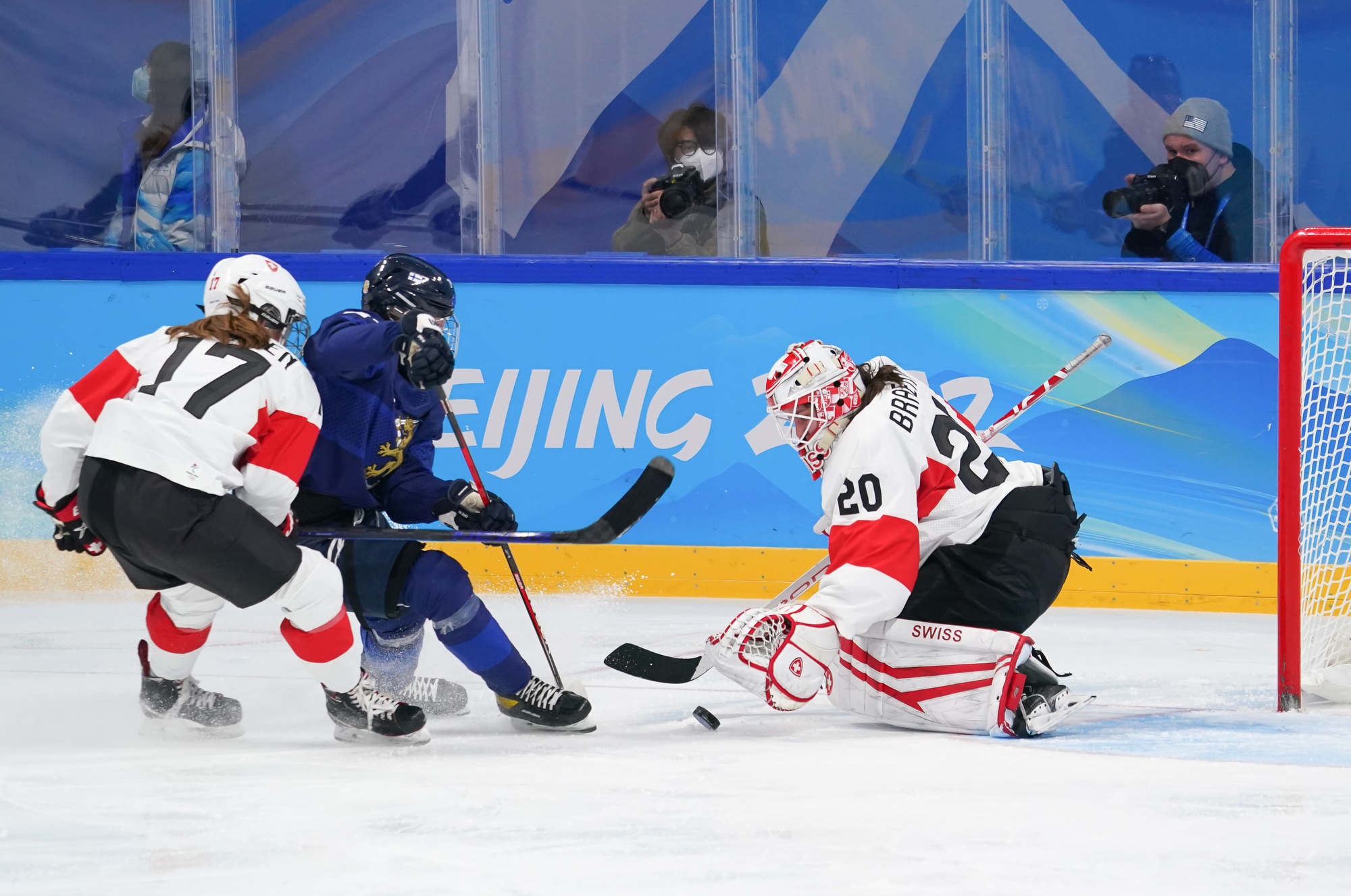 Sinja Leeman lost the puck at the Finland blue line and Susanna Tapani took the puck up ice on a two-on-one with Petra Nieminen, only Nicole Vallario back. When Vallario slid to take away the pass across, Tapani wired a shot over Braendli's shoulder at 3:24, her sixth goal of the Olympics. That was the dagger to the Swiss heart.
